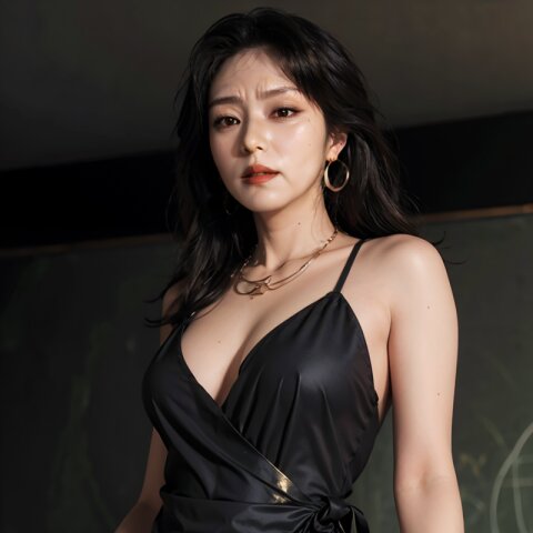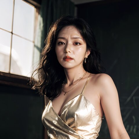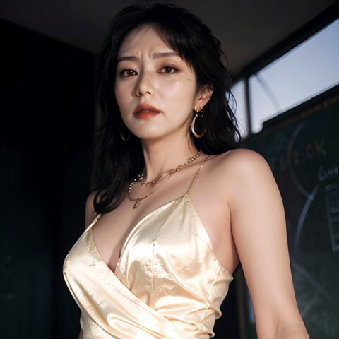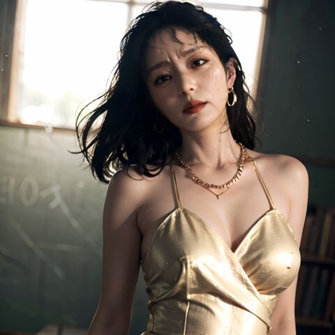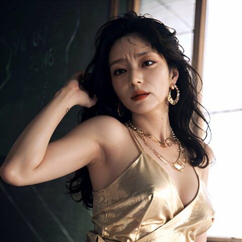 (((shot from below))), (8k, best quality, masterpiece:1), (realistic, photo-realistic:1.4), HDR, (incredibly absurdres:1.2), (random pose: 1.6), 1woman, 55 years old, sex worker, (wrap dress, gold earrings and necklace, black panties: 1.6), (perky breasts:1.6), beautiful detailed face, (cowboy shot: 1.6), perfect skin, detailed skin texture, looking aside, (dark daylight: 1.6), (((in the dark classroom))), <lora:emi_v01:0.6>