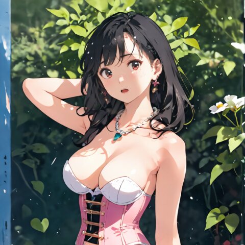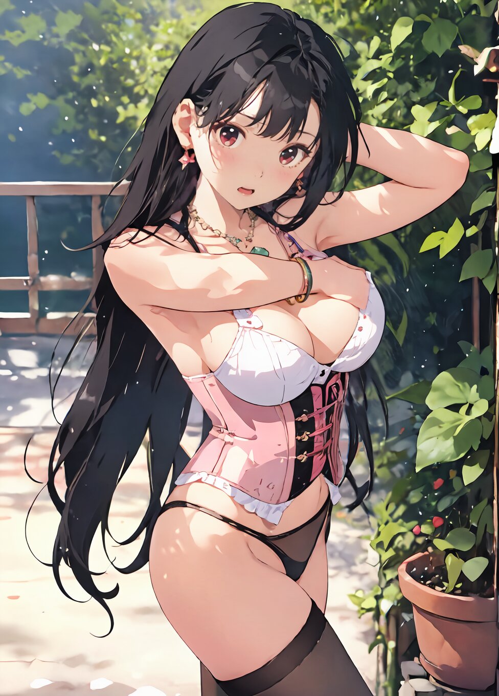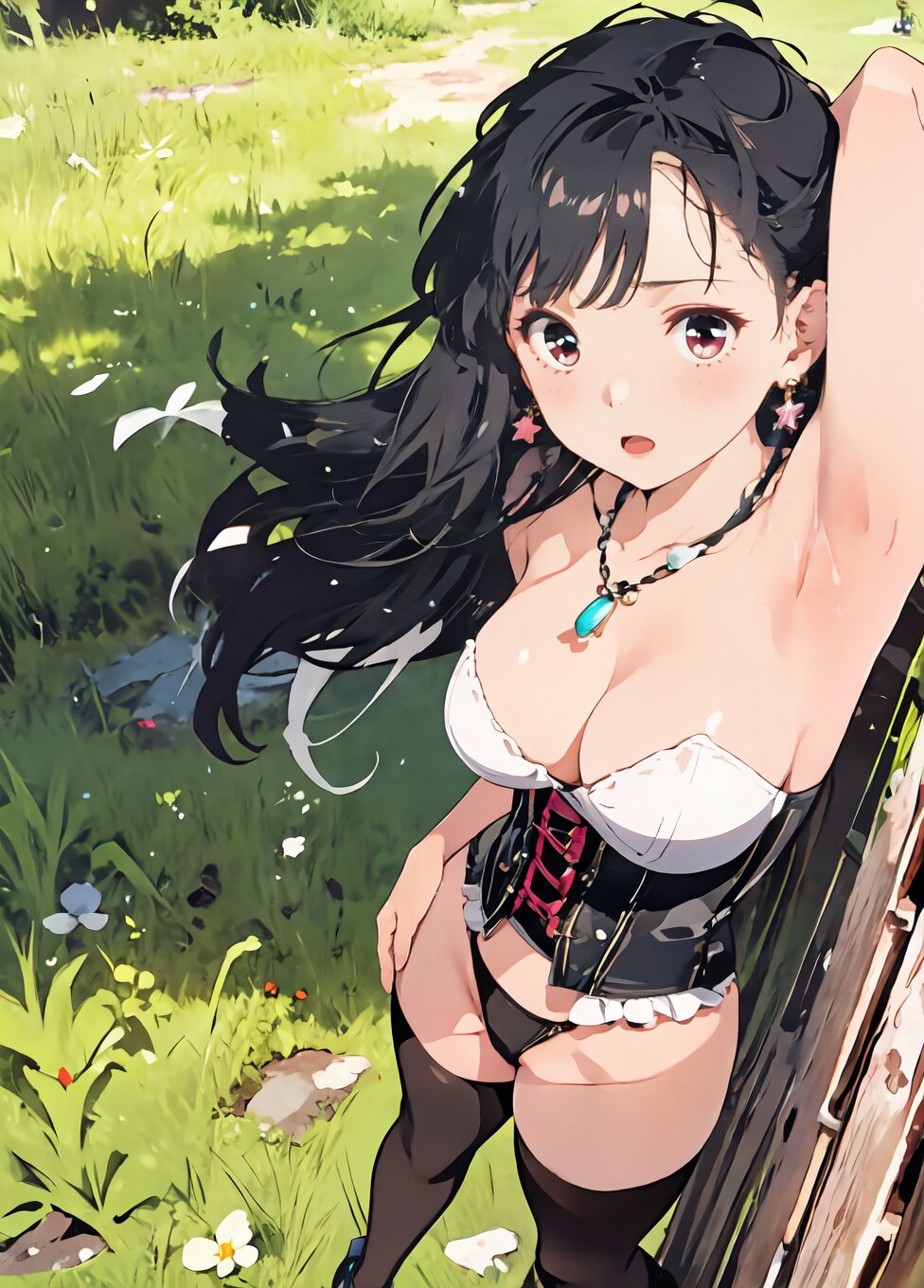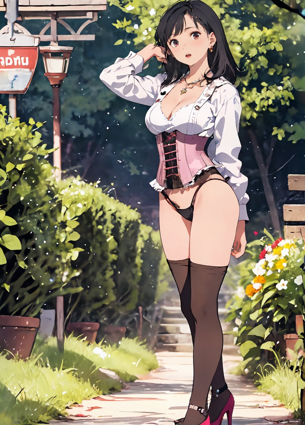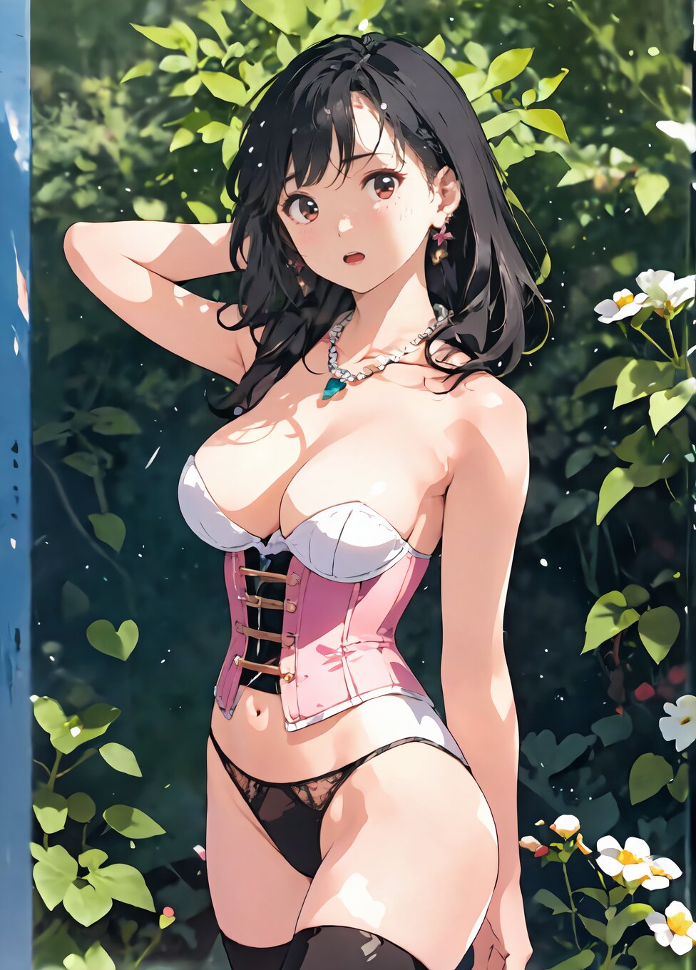 nsfw, from front, (upper body, random sexy posing: 1.6), (8k, best quality, masterpiece:1.4), (realistic, photo-realistic:1.6), HDR, (incredibly absurdres:1.2), (vibrant color:1.2), ultra-detailed, 1girl, 17 years old, (pink corset, black panties and tights, necklace and earrings, black high heels: 1.6), long black hair, (slender, huge breast:1.2), perfect anatomy, beautiful detailed face, perfect skin, detailed skin texture, looking at viewer, (standing: 1.2), on the grassland, <lora:marimori_v01:1.2>