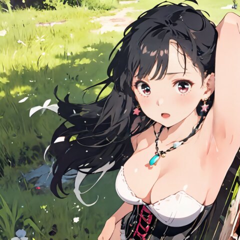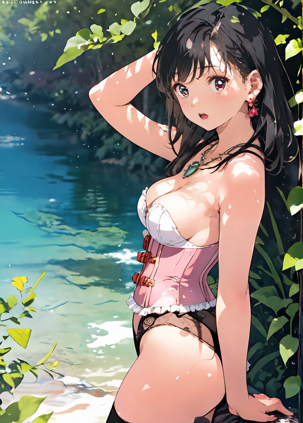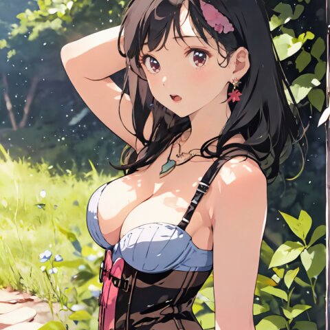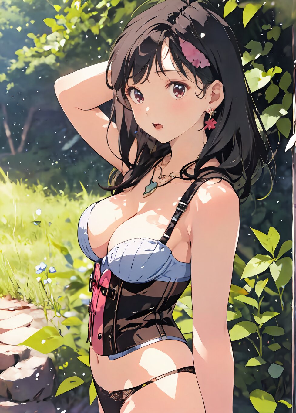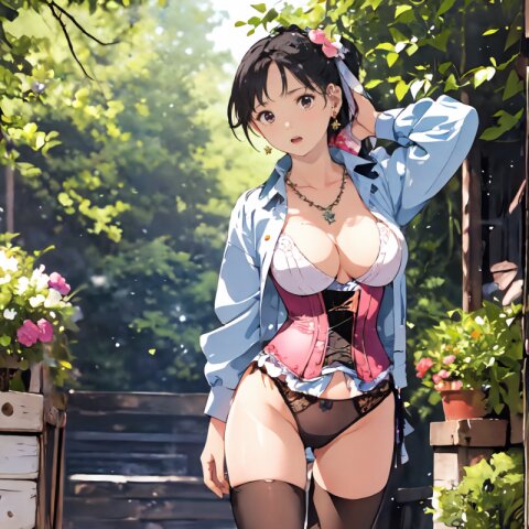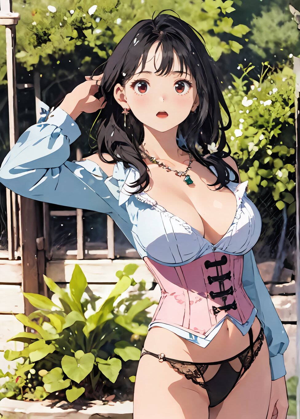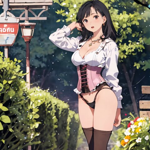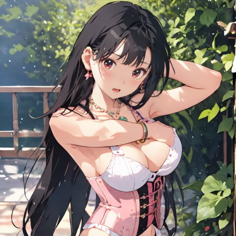 nsfw, from front, (upper body, random sexy posing: 1.6), (8k, best quality, masterpiece:1.4), (realistic, photo-realistic:1.6), HDR, (incredibly absurdres:1.2), (vibrant color:1.2), ultra-detailed, 1girl, 17 years old, (pink corset, black panties and tights, necklace and earrings, black high heels: 1.6), long black hair, (slender, huge breast:1.2), perfect anatomy, beautiful detailed face, perfect skin, detailed skin texture, looking at viewer, (standing: 1.2), on the grassland, <lora:marimori_v01:1.2>