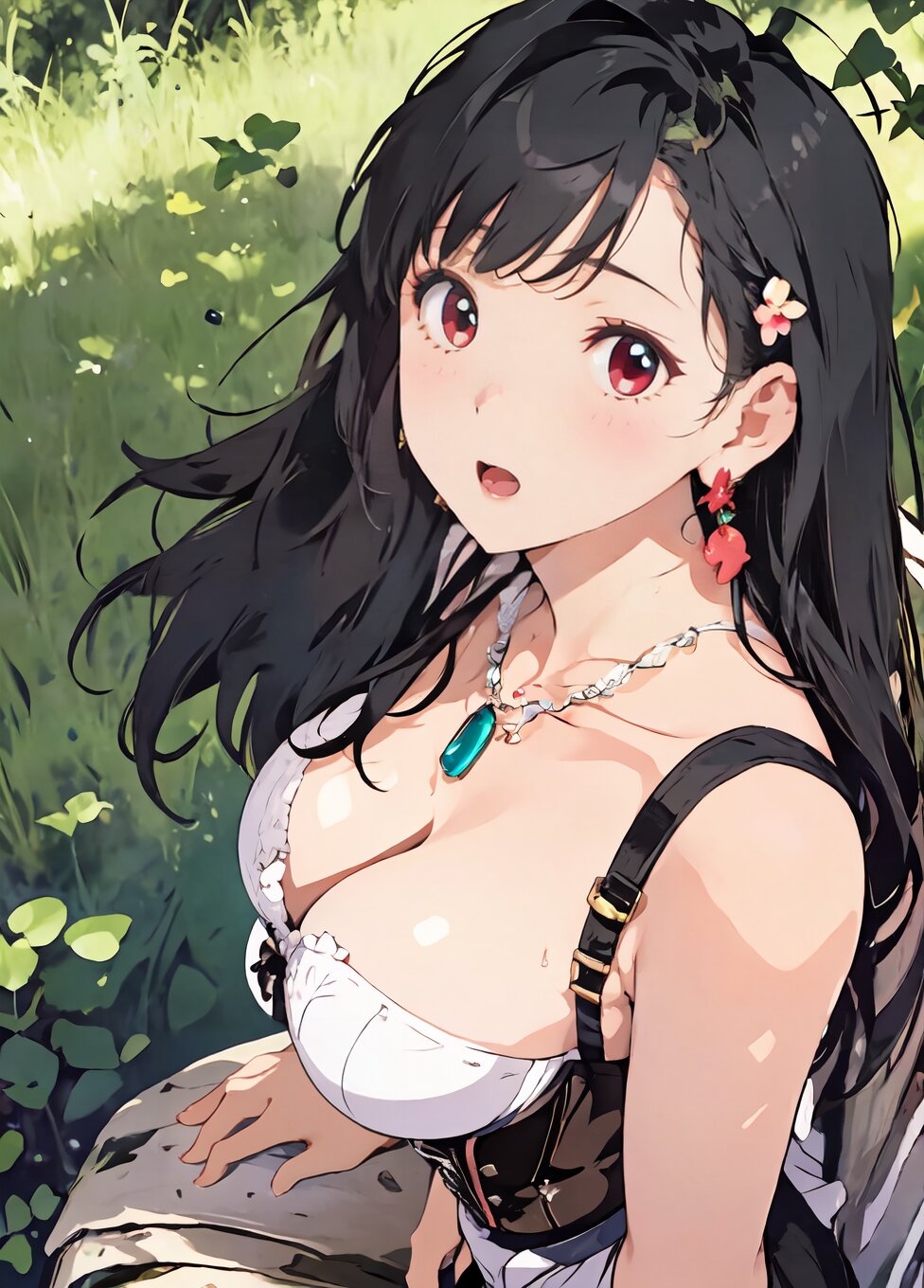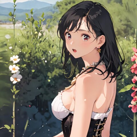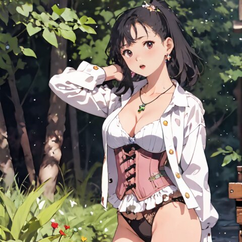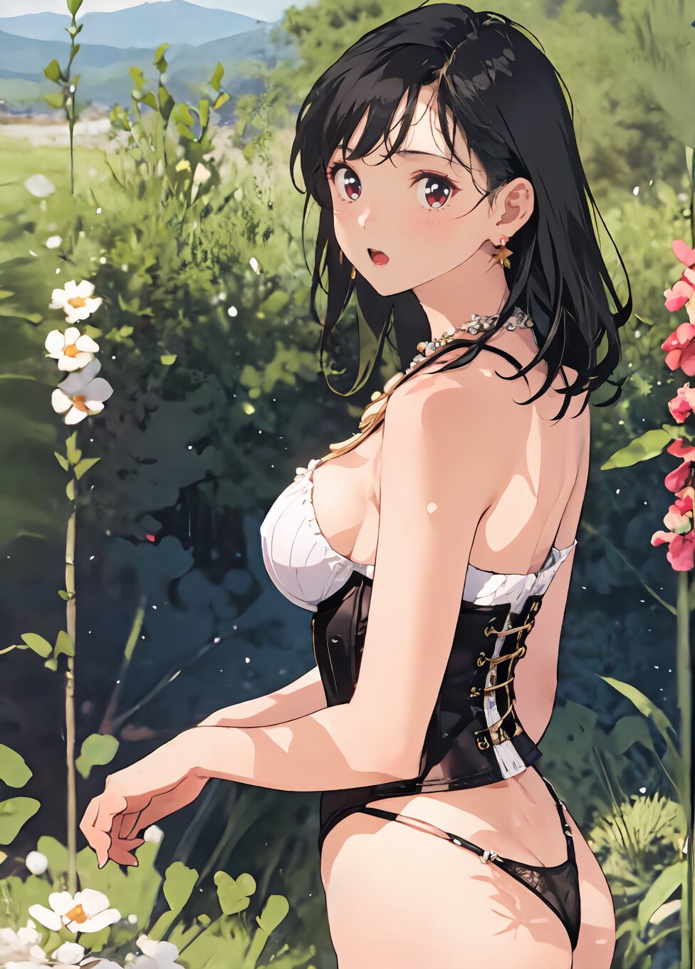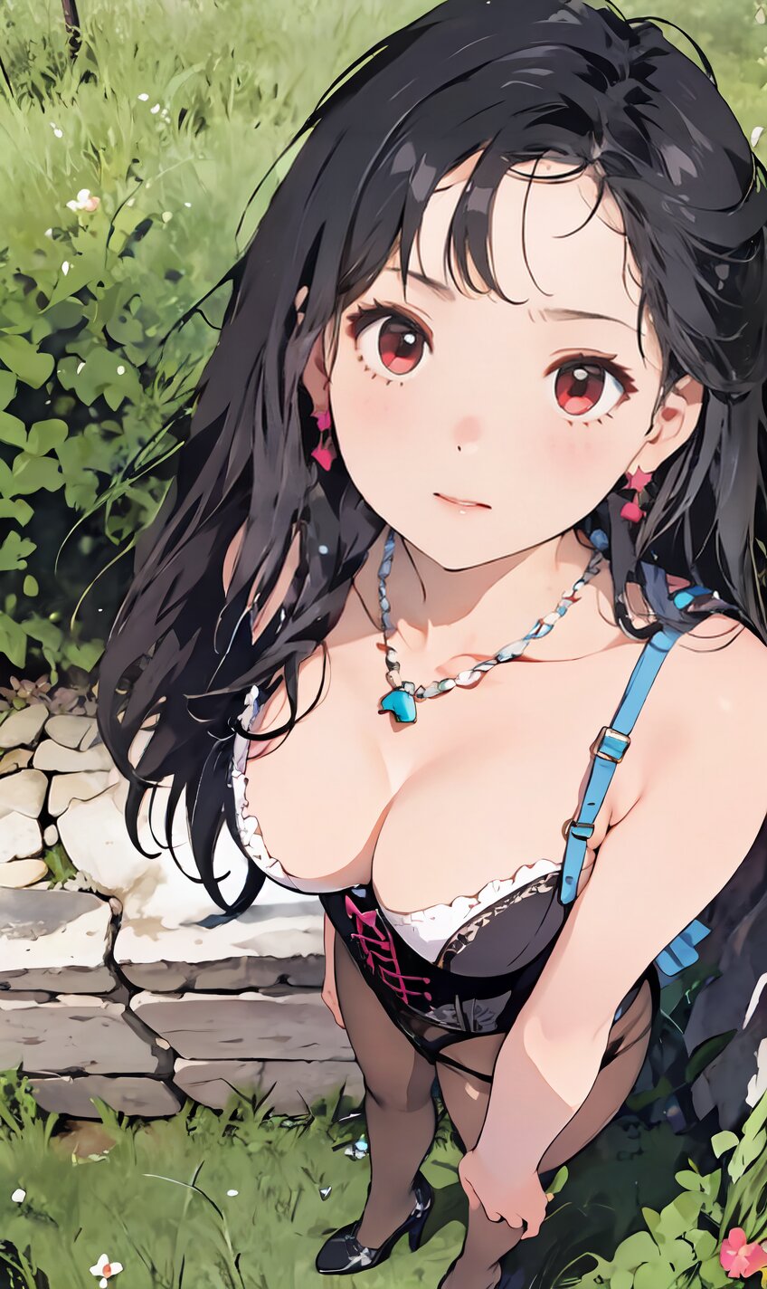nsfw, from front, (full body, random sexy posing: 1.2), (8k, best quality, masterpiece:1.4), (realistic, photo-realistic:1.6), HDR, (incredibly absurdres:1.2), (vibrant color:1.2), ultra-detailed, 1girl, 17 years old, (pink corset, black panties and tights, necklace and earrings, black high heels: 1.6), long black hair, (slender, huge breast:1.2), perfect anatomy, beautiful detailed face, perfect skin, detailed skin texture, looking at viewer, (standing: 1.2), on the grassland, <lora:marimori_v01:1.2>