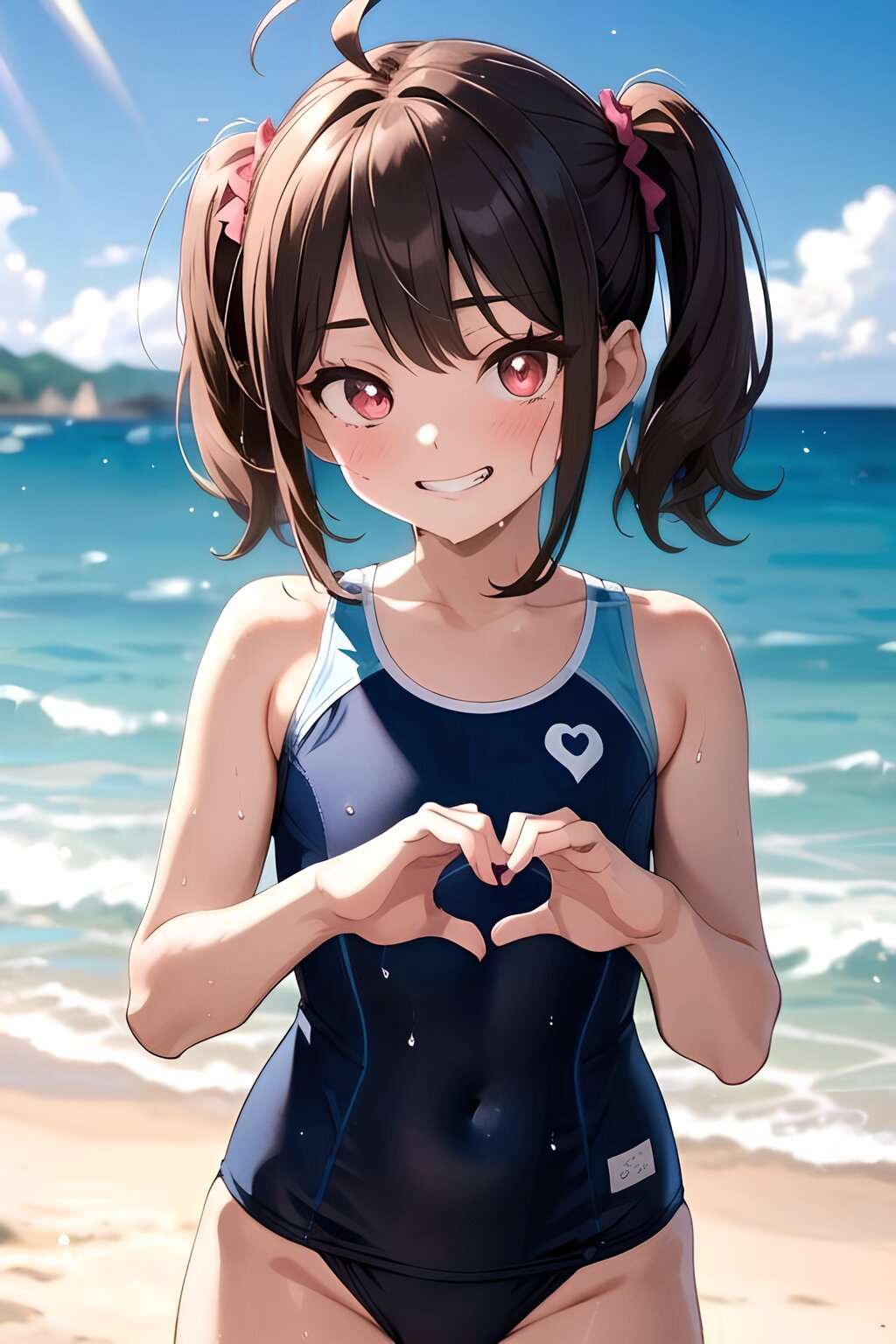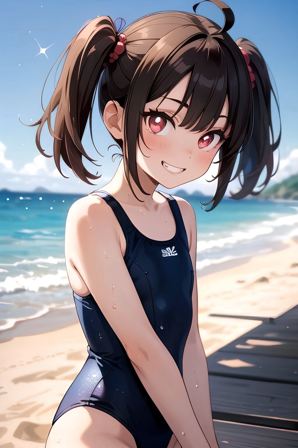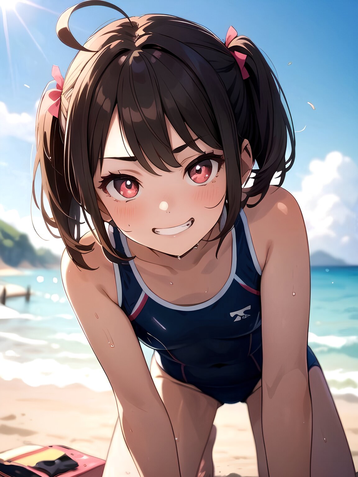 swimwear,wet_swimsuit,old_school_swimsuit,smirk,from_below,depth of field,looking_at_viewer,in summer,day,sun,beach,on the beach,high twintails、best quality, masterpiece, photorealistic, realistic, ultra high definition, ray tracung、1girl、solo、(((loli0.5)))、 blurry background、dark brown hair、short hair、ahoge、evil grin、Red eyes、bangs pinned back、slant eyes、sparkling pupils、cosmetics、cherry pink lip、(ピースサイン)