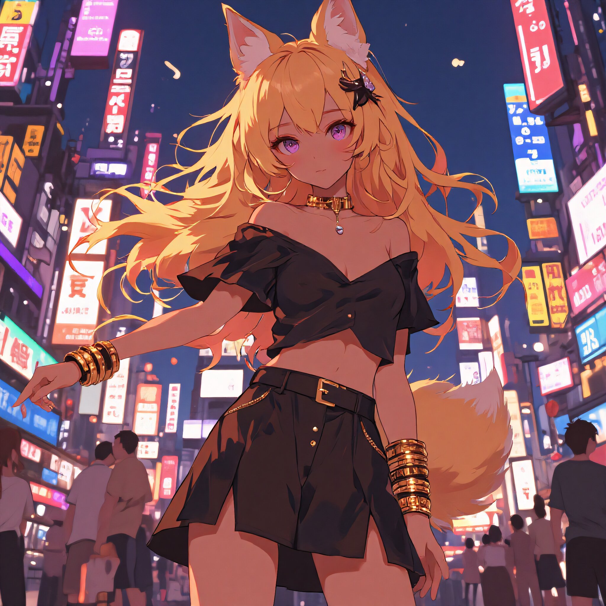 "An anime-style fox-eared girl exuding confidence and charisma, embodying the bold and glamorous style of a kuro-gyaru. Her long, wavy golden-brown hair cascades over her shoulders, and her fox-like ears are adorned with small, sparkling accessories. Her skin has a beautifully tanned tone, glowing under the vibrant city lights. She wears a trendy and eye-catching outfit—perhaps a cropped top paired with a mini skirt, platform heels, and plenty of gold jewelry, including bangles and hoop earrings, reflecting her fashionable and daring personality. Her fluffy tail sways playfully behind her, adding a touch of charm to her striking appearance. The background features a bustling urban nightlife scene with neon signs, towering buildings, and a lively atmosphere, emphasizing her dynamic and stylish vibe. Highly detailed, vibrant, and glamorous tones, blending modern fashion, charm, and fox-like beauty."
