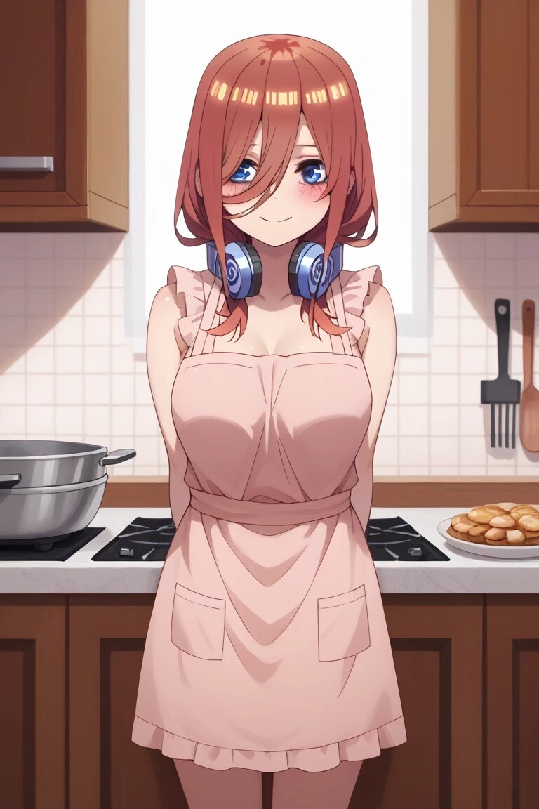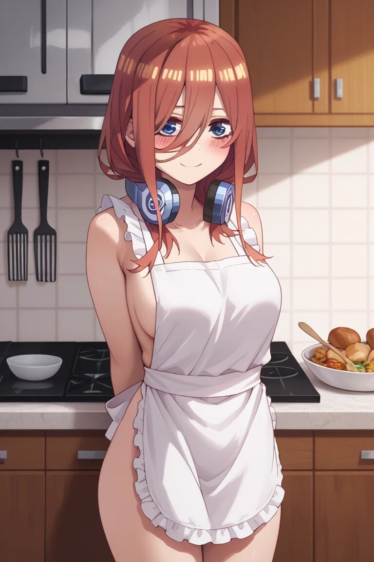 Miku Nakano 5-toubun no Hanayome | Miku Nakano (PDXL), High quality, one woman only, standing completely nude (wearing only an apron), arms folded behind her back, smiling shyly, blushing, kitchen background, front view from the knees up ※LoRa併用