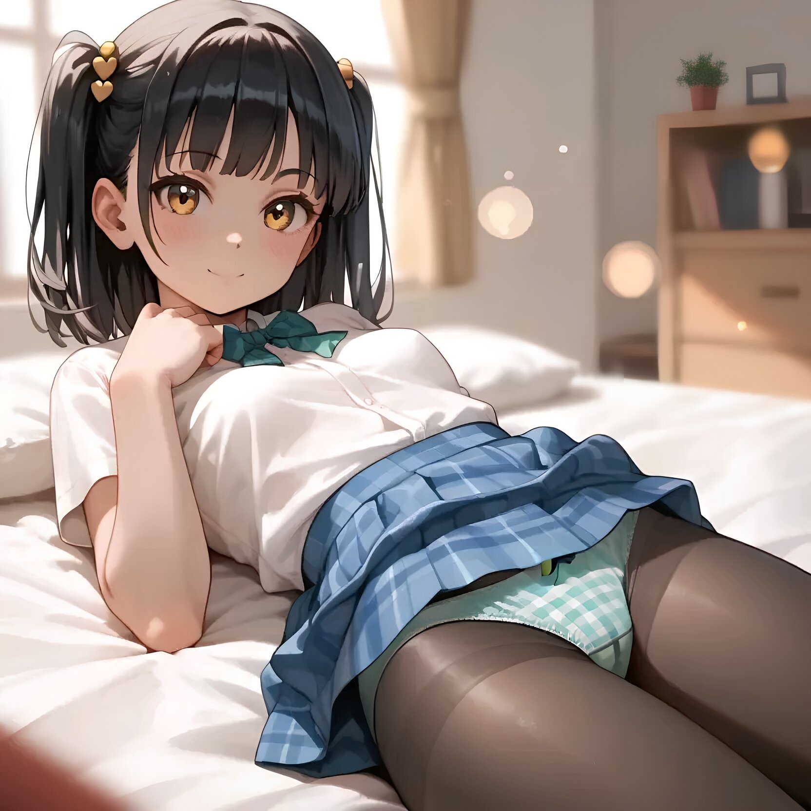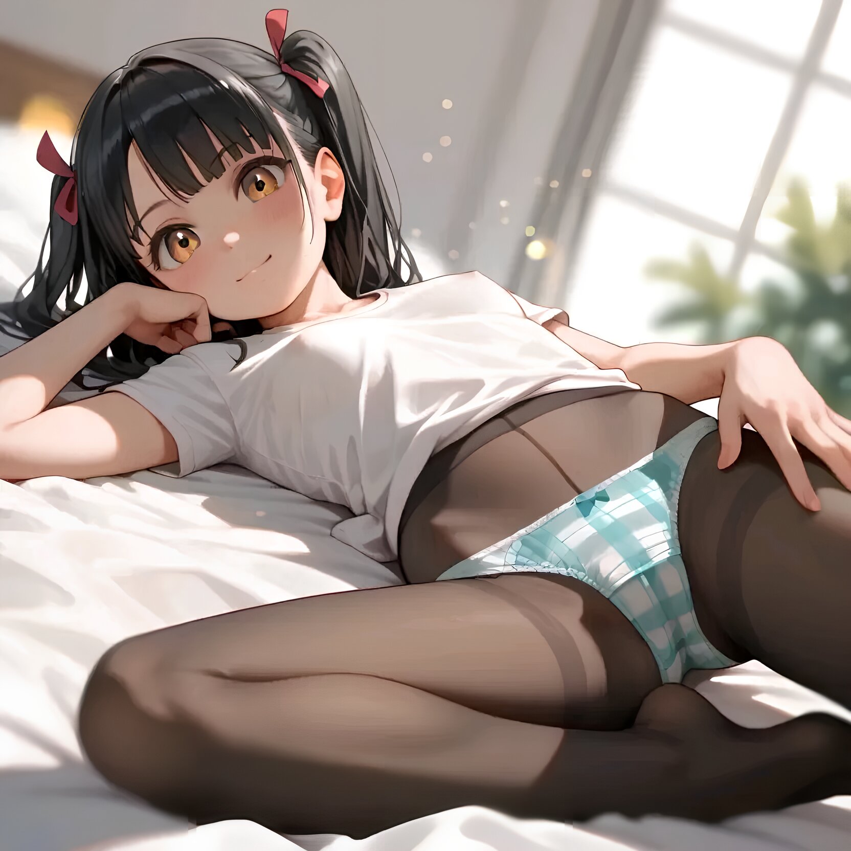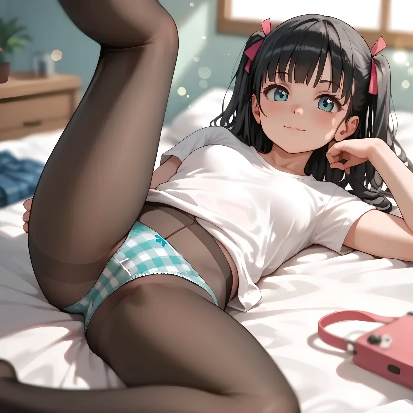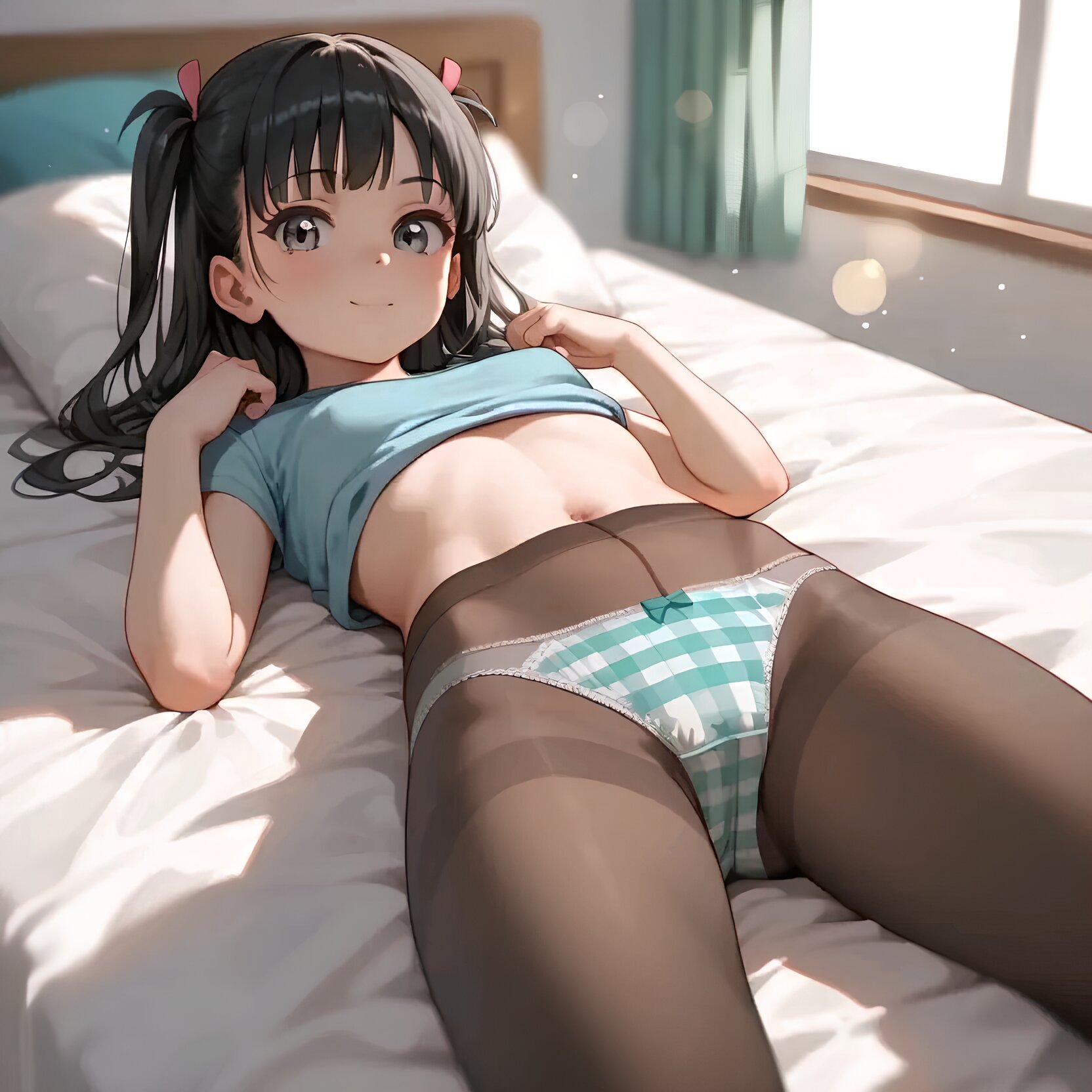 Two Side Up Hair,1girl,loli,bishoujo,mesugaki,underage,black hair,small_breasts,slender_waist,plaid panties,nsfw,pubic hair,(Flat Color: 0.4), (Medium Watercolor: 0.44), (Sketch: 0.2), Cute Girl, Cute, (Pastel Theme: 0.5), (Depth of Field: 1.3), (Bokeh: 1.3), (Perspective: 0.2), Observe the Beholder, Sophisticated, (Contrapposto: 0.6), (Pastel Color: 0.2),lying,panties under pantyhose,panties_Focus