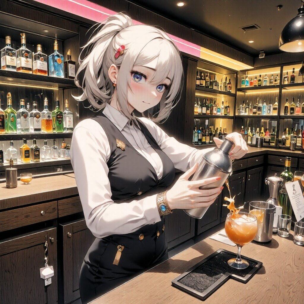[Opening Scene Description] In a modern Japanese cocktail bar with vibrant lighting, a 22-year-old female bartender (jozaki-hina, height 166cm, slender model-like body) is energetically mixing a colorful cocktail with flair and excitement. She stands at the same polished wooden bar counter as in the reference image, but the right side features more colorful accent lighting and trendy decorations, showcasing her vibrant gyaru style in a private, off-duty moment. [Character Details] She has shoulder-length hair that's been styled and colored with trendy blonde highlights, arranged in her signature right side ponytail with colorful decorative hair clips and accessories. Her makeup is glamorous and trendy with winged eyeliner, false lashes, shimmering eyeshadow, and glossy lips. She wears a customized bartender uniform that's been styled to be more fashionable - the white shirt has decorative details, the vest is fitted with stylish modifications, and she's added colorful accessories, trendy jewelry, and decorative nails. [Character Specifics] Her face shows an energetic, bright expression with a wide smile and excited eyes, displaying her natural enthusiasm and youthful spirit. Her posture is dynamic and full of energy, creating a silhouette of confident self-expression. Her hands move with stylish flair and creative flourish as she enthusiastically crafts her cocktail with trendy techniques. Her upturned cat-like eyes sparkle with excitement, and her whole demeanor radiates fun and energy. [Environment and Mood] The right side of the bar setting features the same backdrop of bottles as the reference image but with added colorful accent lighting, trendy decorative elements, and a more playful atmosphere. A small anime character charm dangles from her phone visible at the edge of the counter, and colorful cocktail recipe cards are arranged nearby. The atmosphere is energetic and contemporary, emphasizing modern Japanese bar culture and youthful creativity.