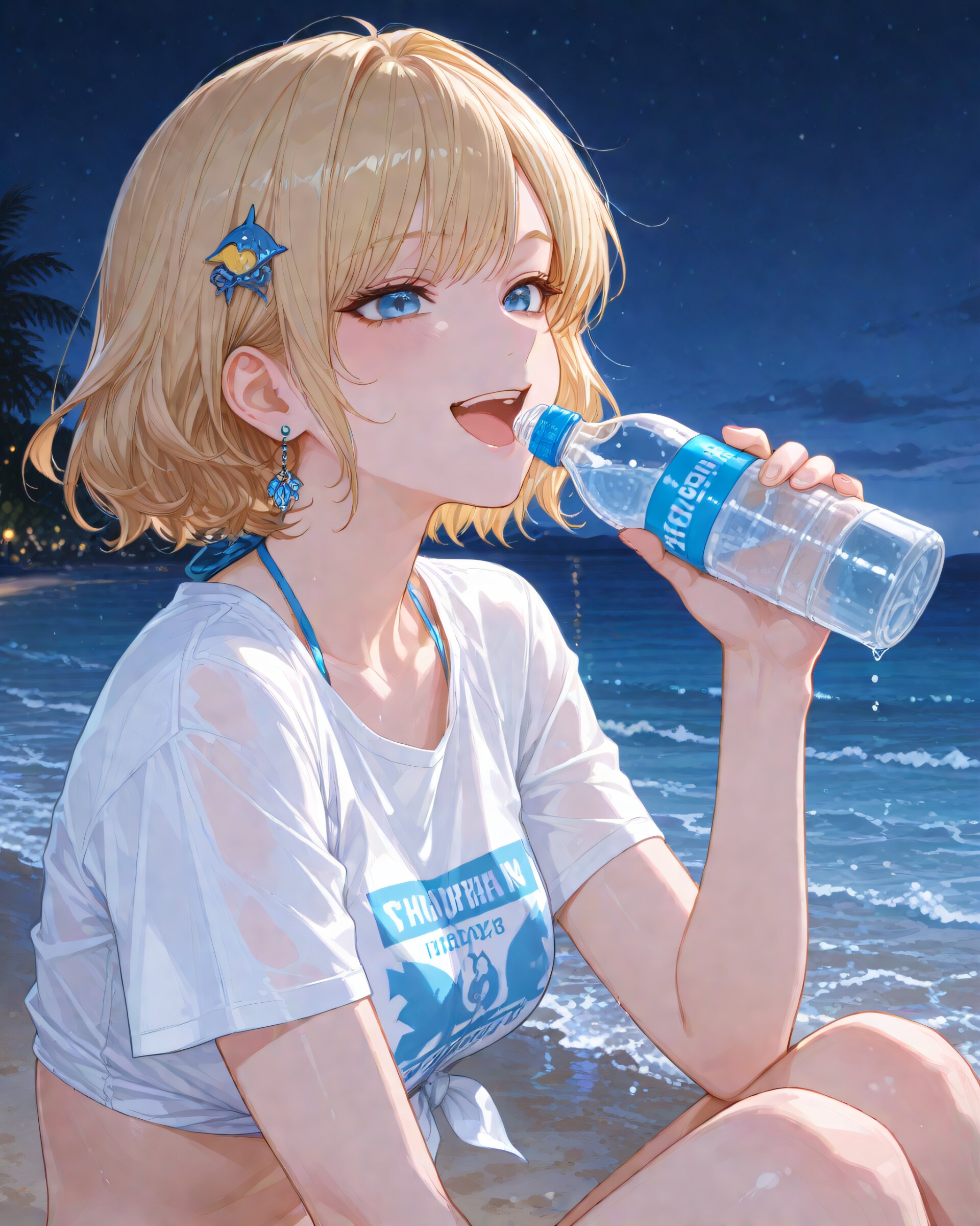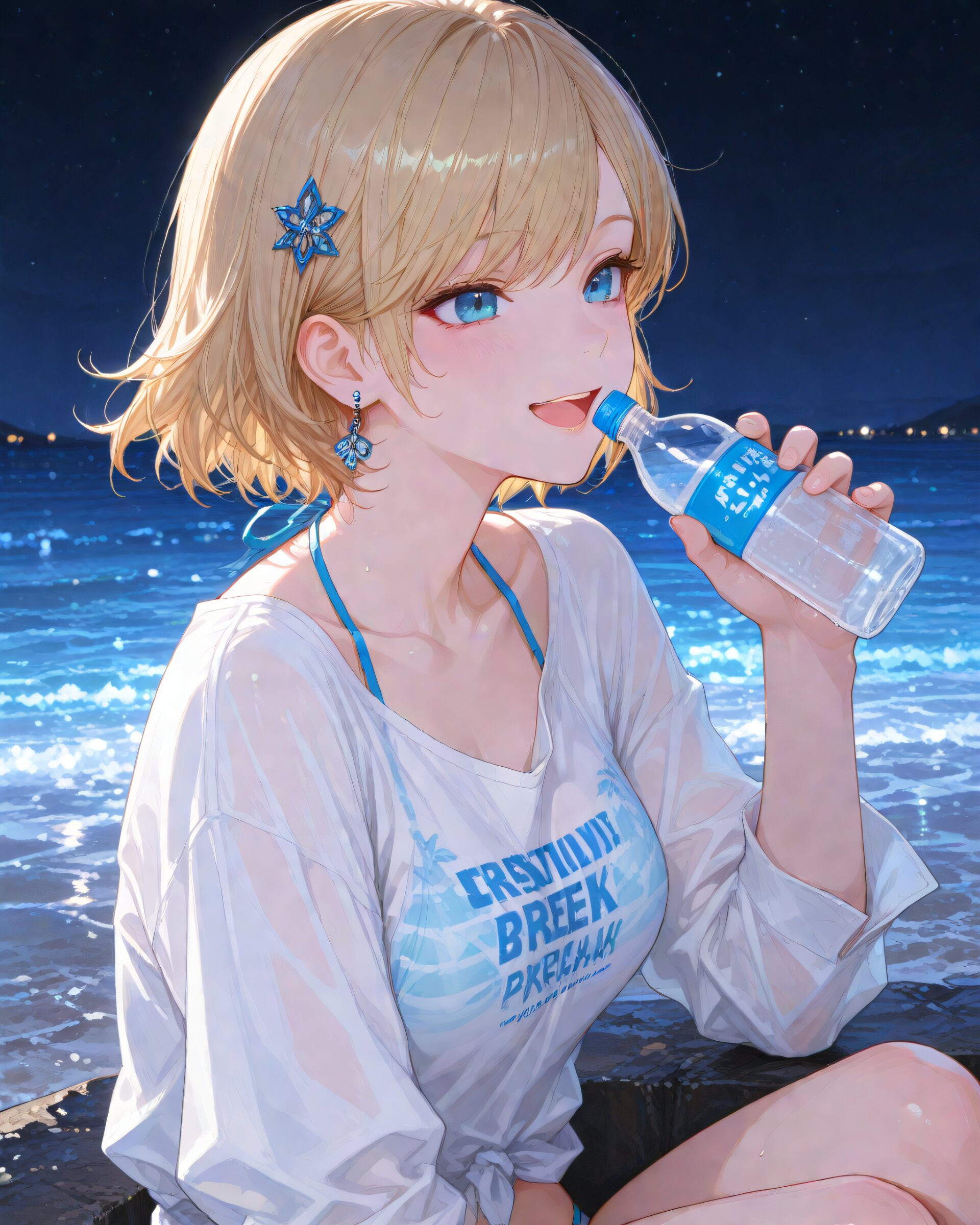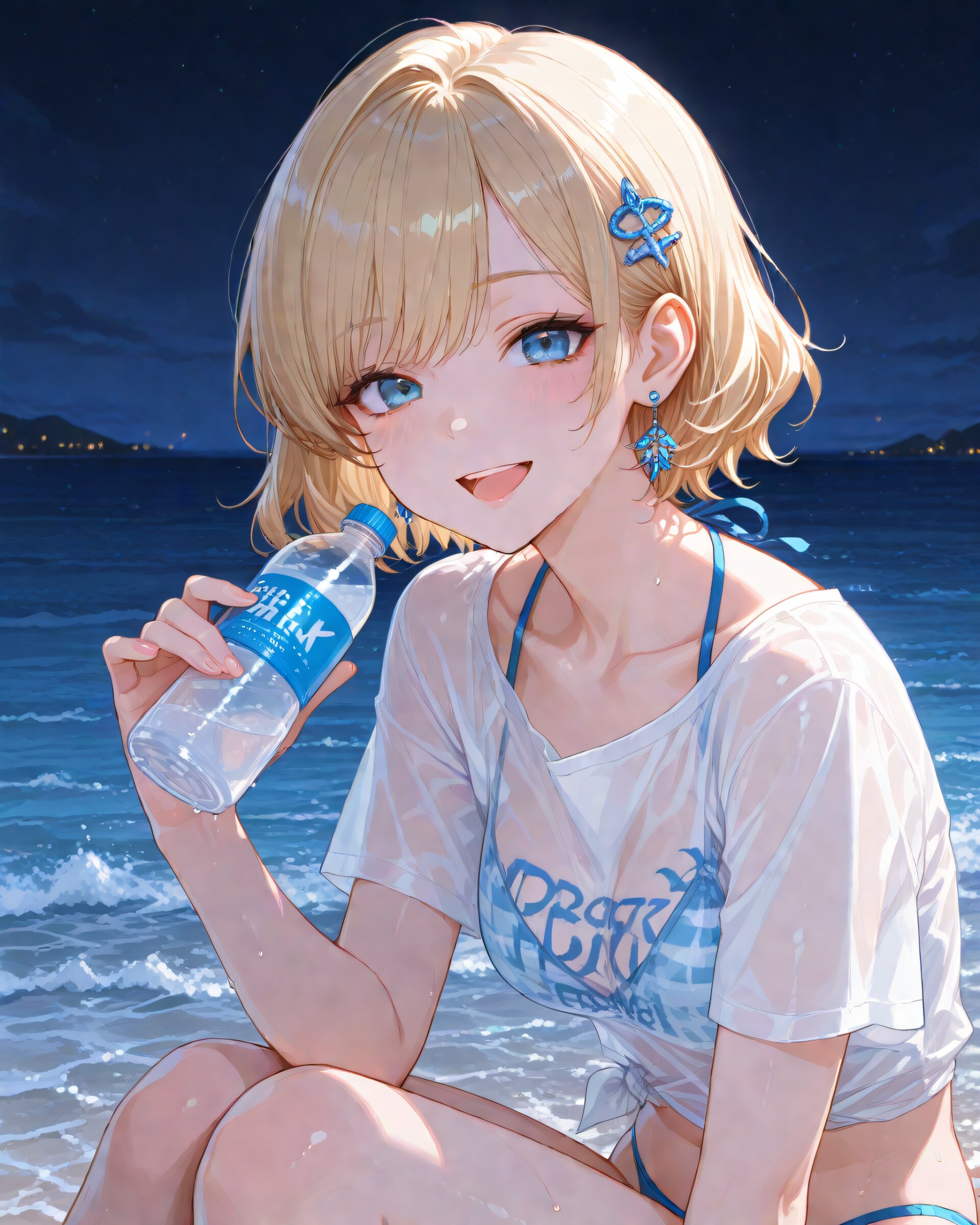 <lora:hyper_sdxl_8_step_lora_f16:1>,, 1girl, sitting, drinking bottle, focus face, upper body, sea side, night BREAK 18 years old, girl, short hair, wavy blonde hair, swept bangs, medium breasts, slender, frosty blue eyes, bikini, shirt, collarbone, see through, smile, open mouth, earrings hair ornament, BREAK masterpiece, amazing quality, best quality, very aesthetic, ultra-detailed, 8K, newest, vivid,