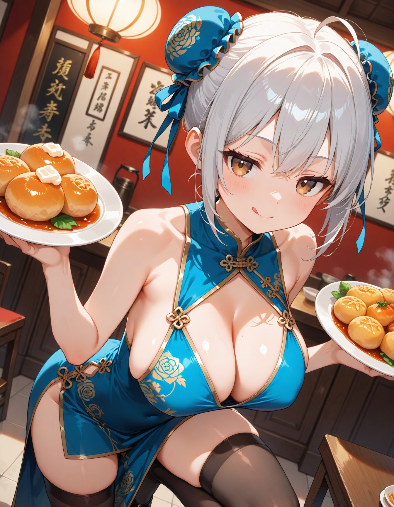 Masterpiece, best quality, high quality, ultra-detailed, ultra-high resolution, best beauty 8K, 1girl, solo, 18 yo, licking lips, braided bun, chignon, updo, bun, half updo, two buns, (hair between eyes:0.6), gray hair, medium large breasts, hanging breasts, cleavage, brown eyes, (jitome:1.4), (eyelashes:1.2), bad mood, bun cover,china dress, long dress,tight mini skirt, gold decoration dress, sleeveless, ultra detailed dress,cleavage, cleavage cutout, clothing cutout, over-kneehighs, holding a plate of steaming dumplings in her right hand, in a Chinese restaurant, lunge, raise one leg, dutch angle, from side,