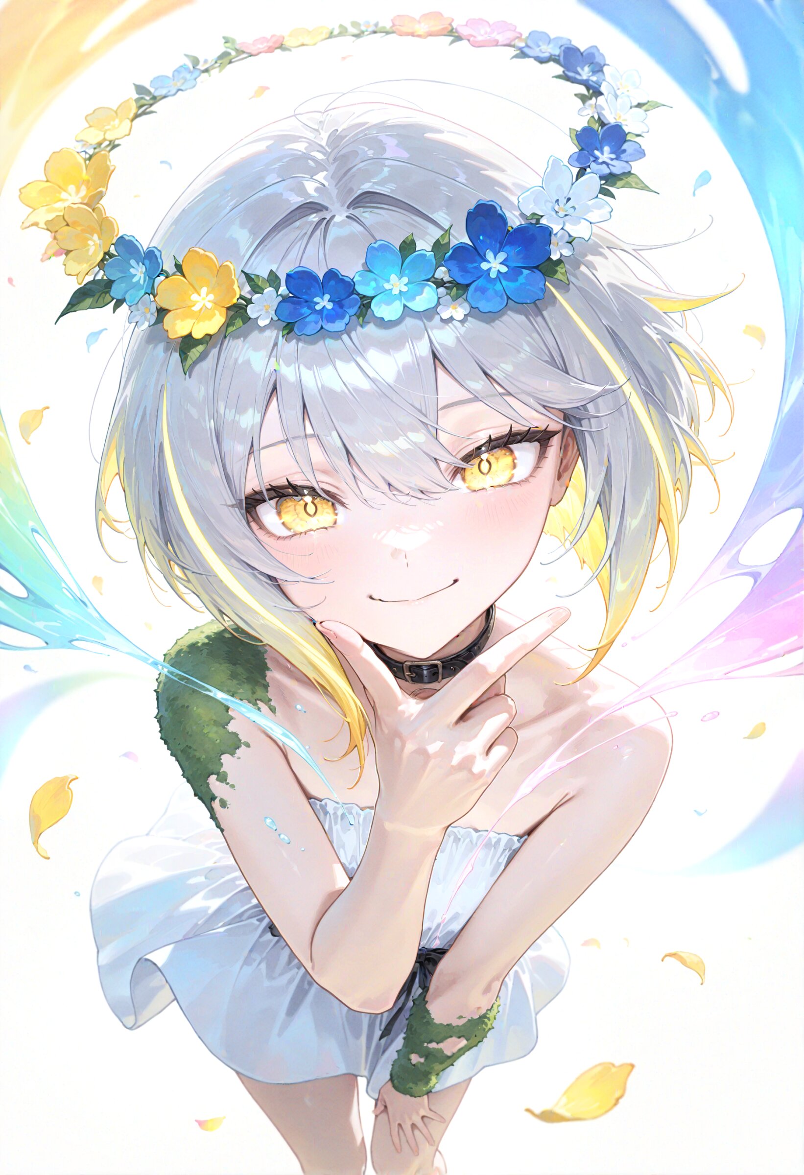 foreshortening, dynamic angle looking at viewer, white background, watercolor \(medium\), 1girl, ((inverted bob)), (((detailed anime face))),((beautiful detailed face)), gray hair, ((colorful hair)),((streaked hair)), beautiful citrine eyes,(citrine eyes:1.3), multiple-colored hair, (colorful hair:1.4), cute face, sparking eyes, eye shadow,, flower halo, collar, white cloth, (extremely delicate and beautiful fabric), detailed clothes,, cool, angel smile haughty face smile (emotional:1.1), (gently smile:1.1),(closed mouth:1.0), (moss phlox:1.2), (surrounded by moss phlox:1.0), moss phlox petals, (high saturation:1.0), dim lighting, An illustration with line art drawn using a brush, featuring dynamic movement lines expressed with thick sumi ink strokes. super fine concept art, hard surface, 8K, unreal engine, masterpiece, best quality, amazing quality, very aesthetic, absurdres, you can add scenery, (volumetric lighting), To make the background more distinctive. professional art lots of details, , overexposure, sumie effect style, <lora:noline (1):-0.5> <lora:sdxl2-flat2-512b:-0.5> <lora:facelightup_xl_v10:0.5>