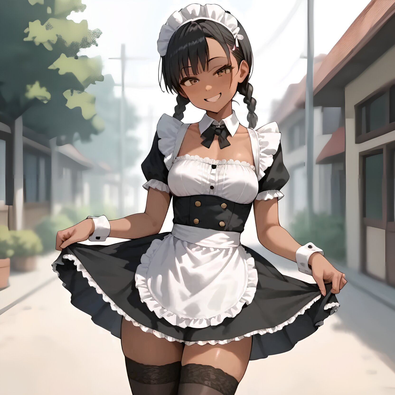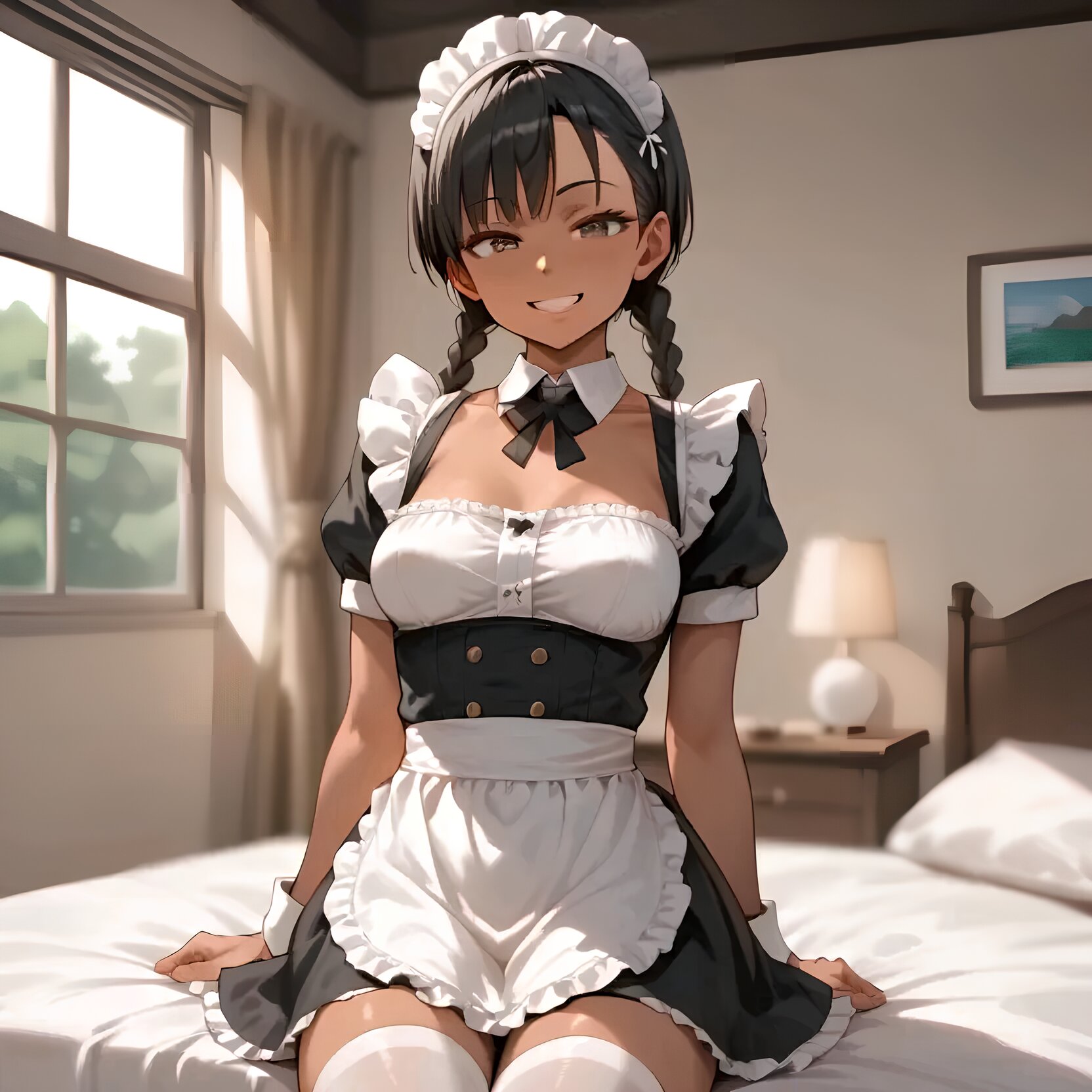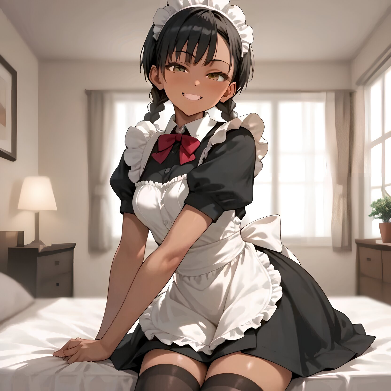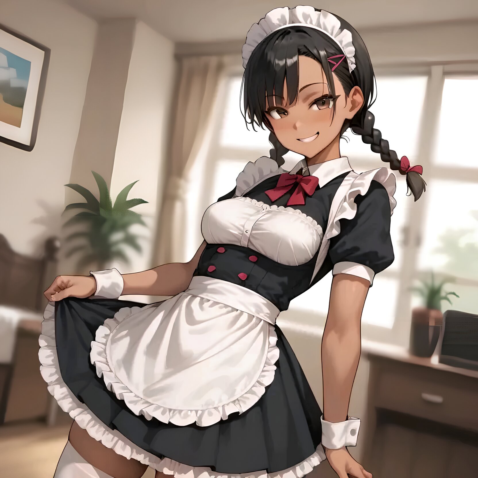 maid,:d,long_dress,black_thighhighs,twin braids,bishoujo,early teen, black hair short cut, blurry background.tan., naughty face, tareme.brown_skin,early teen,curvy,Medium breasts,slender_waist,twin braids,bishoujo,early teen, black hair short cut, blurry background.tan., naughty face, tareme.brown_skin,early teen,curvy,Medium breasts,slender_waist,bedroom