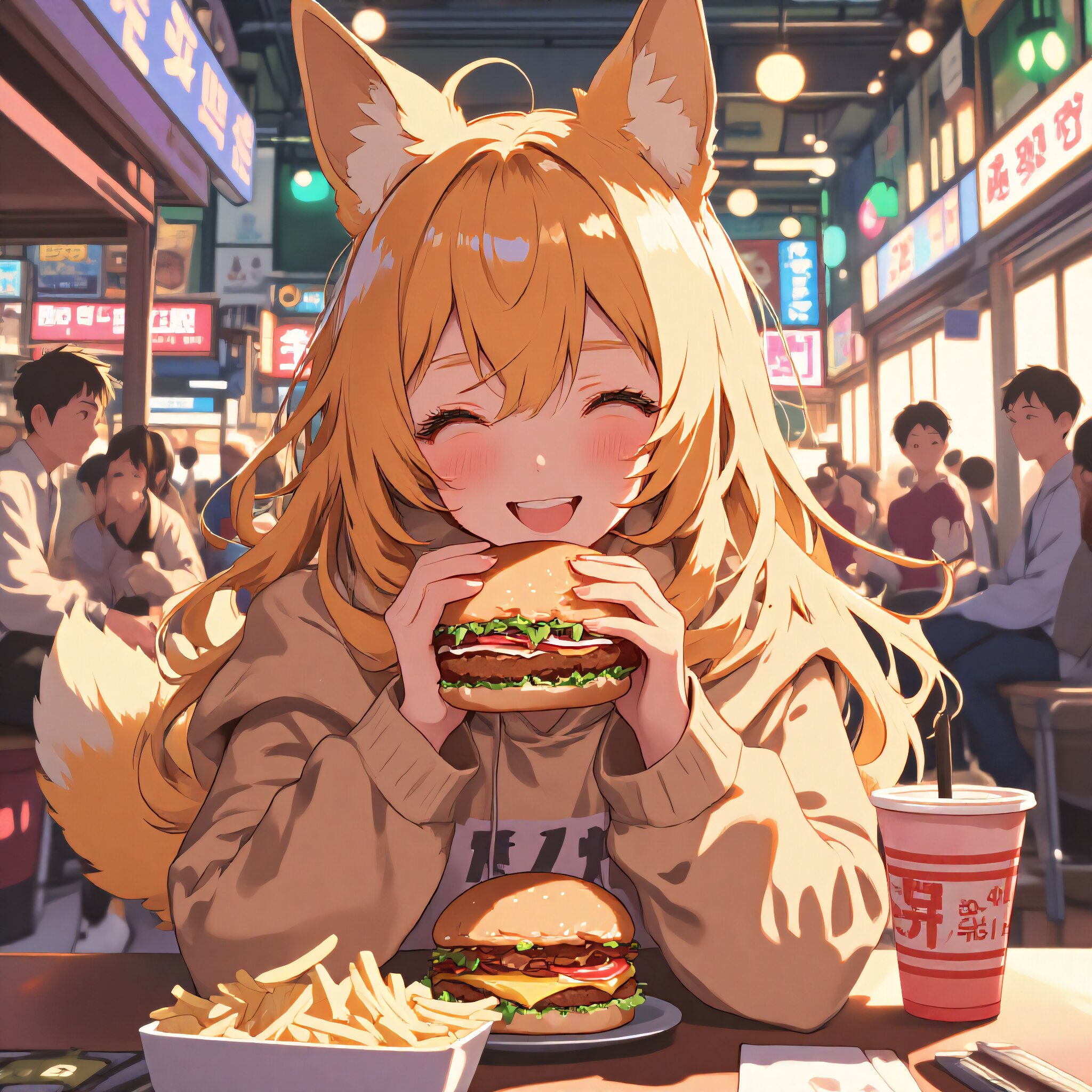 "An anime-style fox-eared girl sitting cheerfully at a bustling food court, savoring a delicious hamburger and crispy fries. Her long, wavy golden hair glows under the bright overhead lights, and her fox-like ears twitch slightly in excitement as she takes a bite of her juicy burger. She wears a casual yet stylish outfit—a cozy hoodie or a fashionable jacket paired with a skirt, perfectly suited for a fun outing. Her fluffy tail curls playfully behind her, reflecting her relaxed and happy mood. The background features a lively food court atmosphere—colorful neon signs, trays of various fast-food delights, and groups of people chatting over their meals, adding a dynamic and vibrant ambiance to the scene. Highly detailed, warm and inviting tones, blending charm, playfulness, and fox-like beauty."
