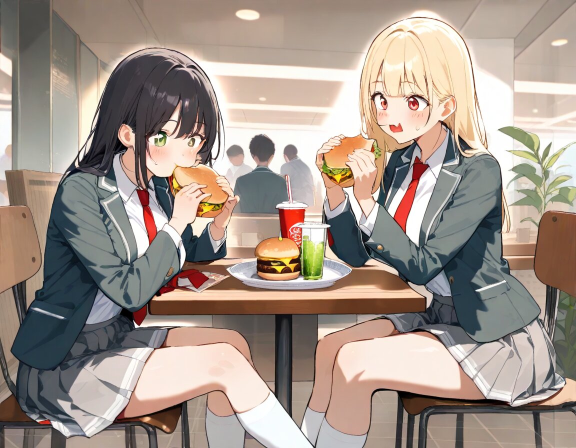 2girls, sitting at table, food court, modern shopping mall, bright and lively atmosphere, indoor, soft daylight through large windows, crowded background with people, colorful food trays, plates with burgers, fries, and sodas, detailed food, wooden table, plastic chairs, casual and relaxed vibe, girl_1: (short blonde hair, red eyes, large breasts, smooth skin, 17-year-old vibe, wearing white blouse, red necktie, gray pleated skirt, white high socks, medium green-gray blazer, eating a burger, smiling softly, holding a soda cup, natural pose) BREAK girl_2: (long black hair, straight hair, green eyes, medium breasts, smooth skin, 18-year-old vibe, wearing black sailor suit, short-sleeved, white neckerchief, black pleated skirt, black high socks, sipping soda through a straw, holding fries, gentle expression) BREAK intimate friendship, soft indirect lighting, clean and tidy environment, detailed background with food court stalls, neon signs, tiled floor, plants in pots, masterpiece, high score, great score, absurdres