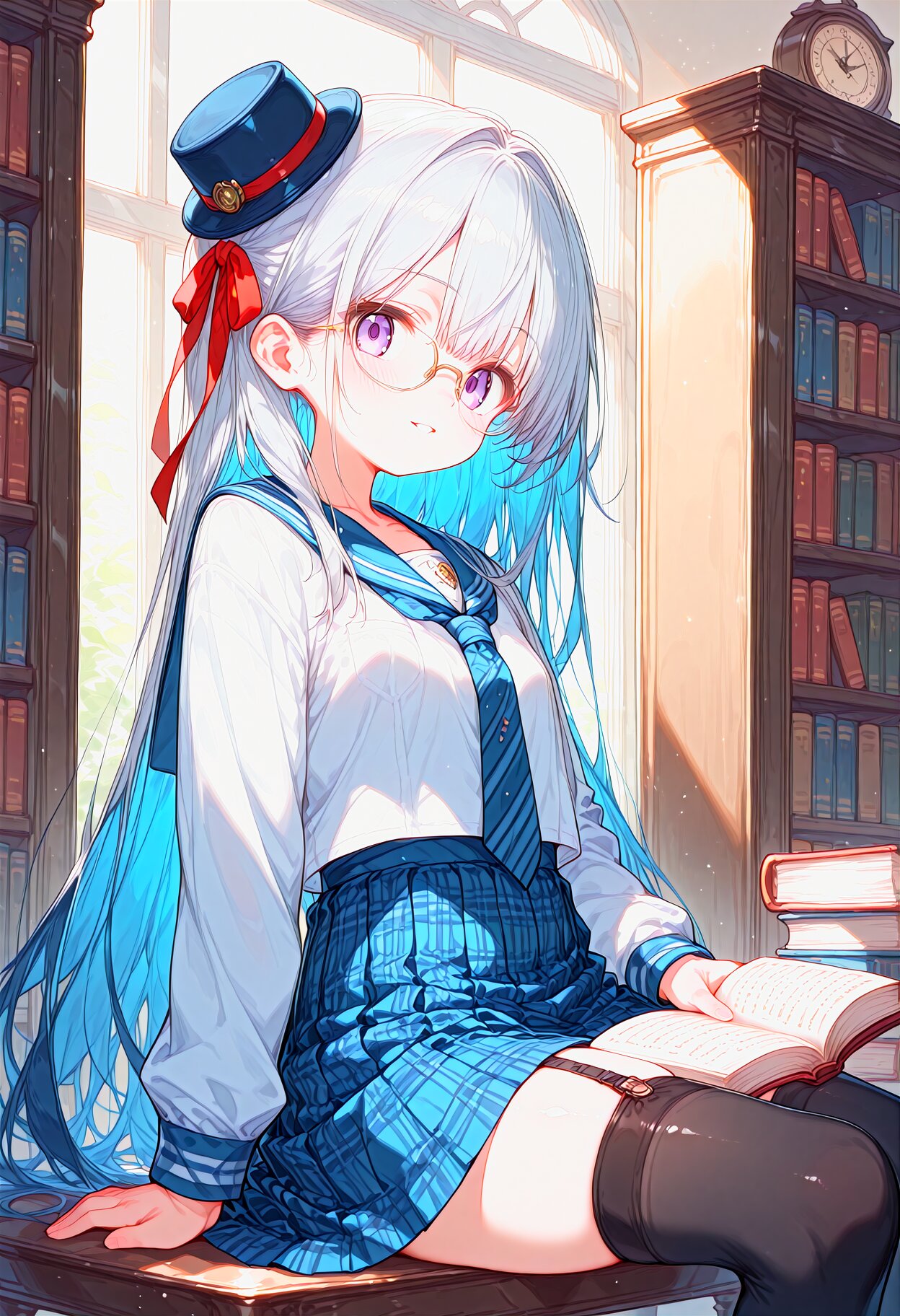 beautiful detailed background, best quality, pale color, (portrait, wide shot:1.2) solo, black legwear,garter straps, collarbone, parted lips,(Expressionless:0.8), big eyes,(half-closed eyes:0.8), tareme, pale purple eyes, thighhighs, (silver hair:1.1), (dark blue hair colored inner hair:0.8), long hair,very long hair eyebrows visible through hair, mini hat, black legwear,garter straps, hair ribbon, long sleeves, plaid blue necktie, plaid blue skirt, ribbon,red ribbon, school uniform,white shirt, glasses, holding open book, wall clock, temptation, library, table, reading book, indoors, sitting, from side, <lora:sdxl2-flat2-512b:-1.4> <lora:noline-16oa:-1.85>