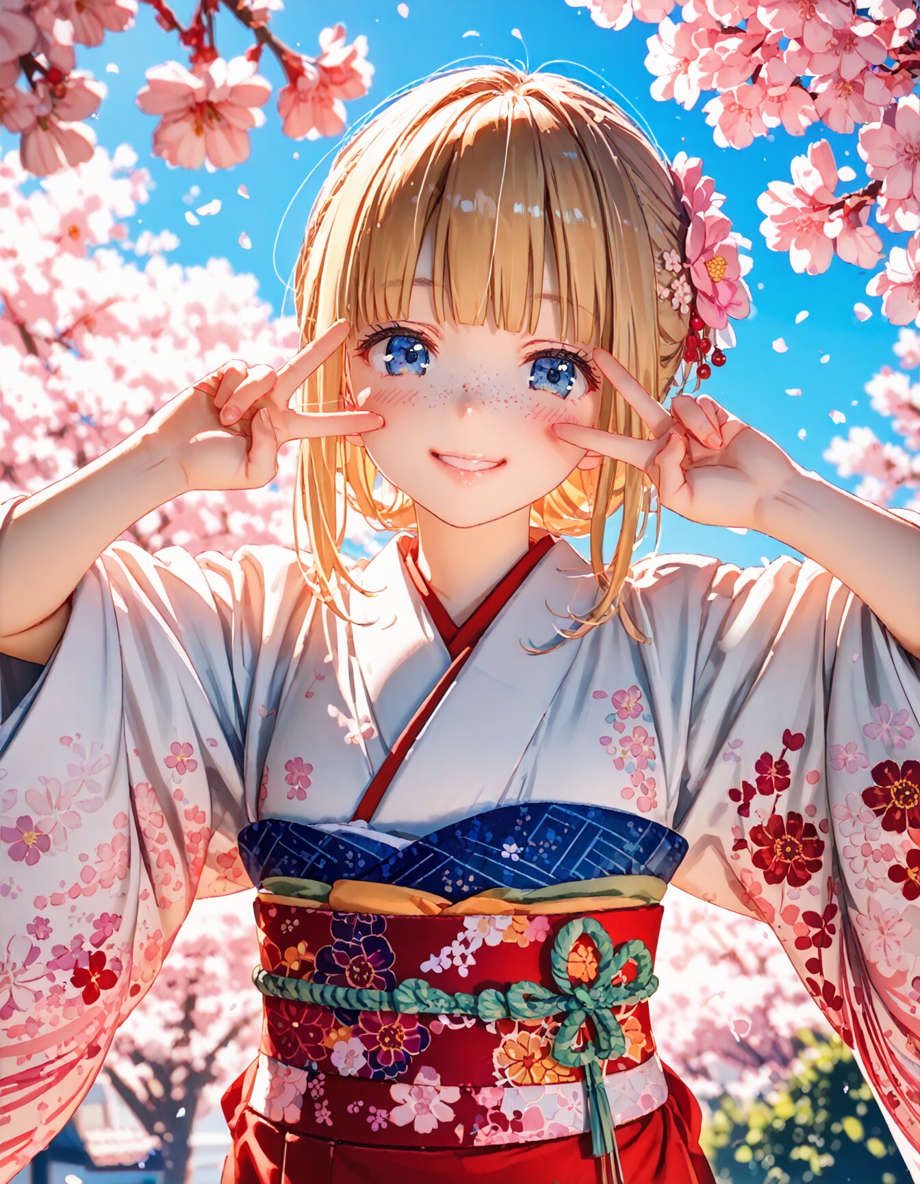 score_9, score_8_up, score_7_up, score_6_up, score_5_up, score_4_up, rating_safe, best quality, ultra hi res, detailed drawings, exquisite depictions, (abstract surrealism), dynamic angle, cowboy shot, 1 beautiful girl, detailed face, light blue eyes, freckles, detailed mouth, Glossy lips, natural make up, blond hair, blunt bangs, hair up, small breast, (Flower float pattern designed red furisode kimono), (long sleeve), (Beautiful embroidery), (beautiful obi), (Nishikiori obi), (kanzashi), (Flower Hair Ornaments), happy smile, blush, V sign, arms up, (Hands near face:1.3), look at viewer, Beautiful Japanese Gardens, (outdoor), (beautiful blooming Cherry Blossoms), (detailed Cherry Blossoms), day time, clear blue sky, sun lighting, beautiful lighting, perfect lighting, <lora:Fixhands_anime_bdsqlsz_V1:1>