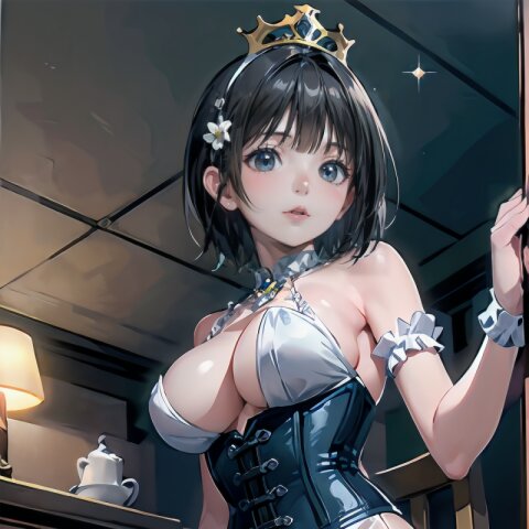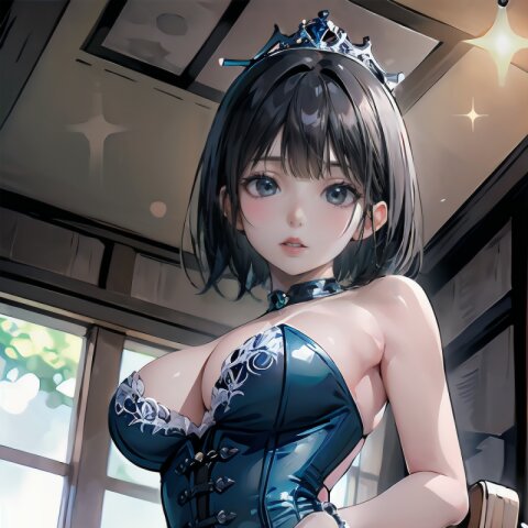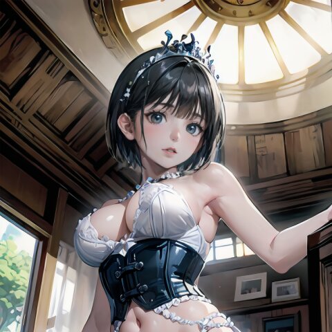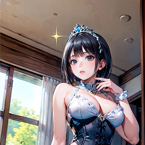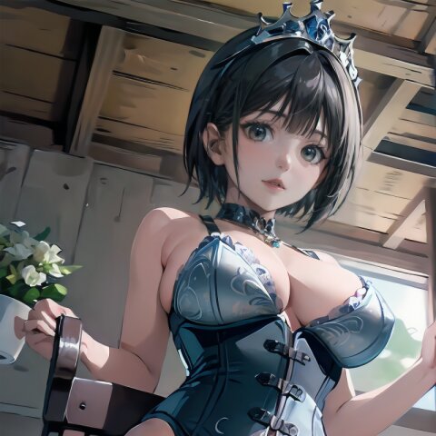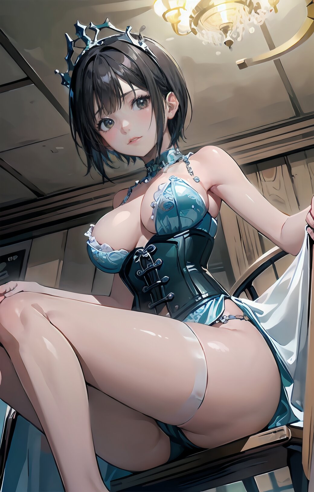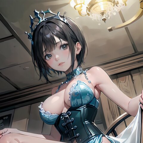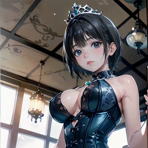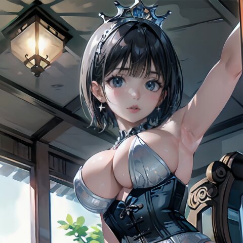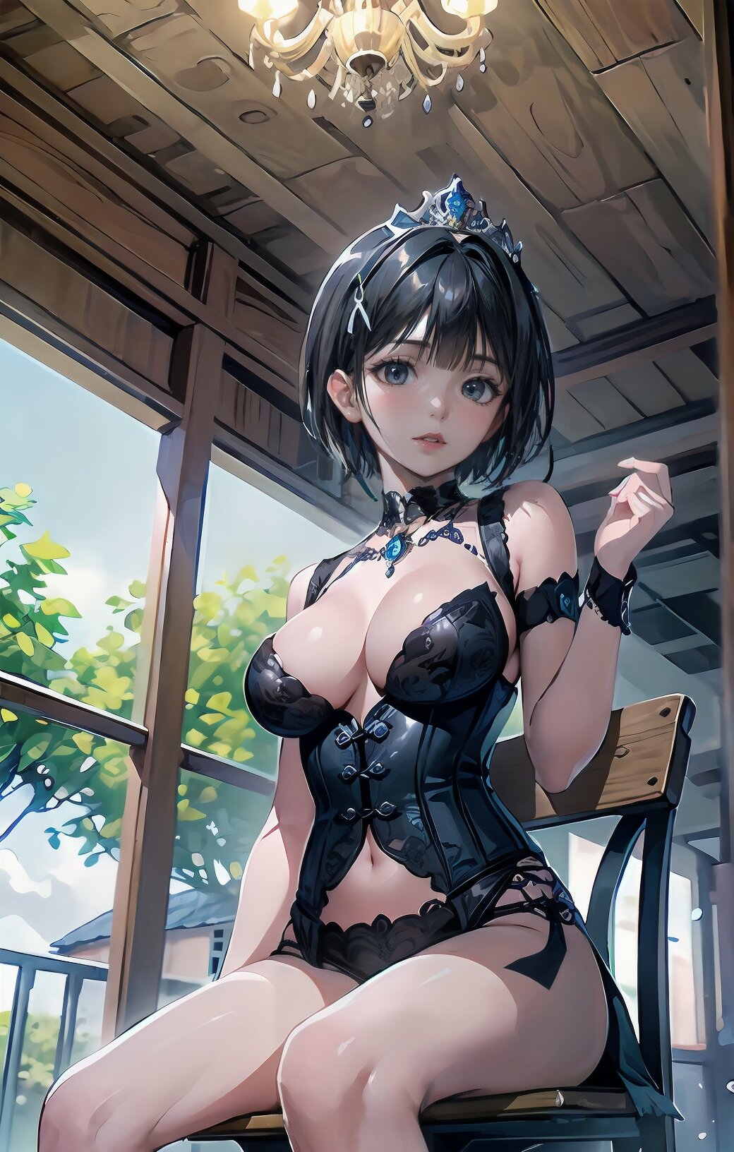(((from below))), photography, (masterpiece:1.3), (best quality:1.3), (ultra-detailed:1.2), 8K, HDR, (incredibly absurdres:1.2), Kodak portra 400, film grain, lens flare, (vibrant color:1.2), ray tracing, dynamic angle, cinematic angle, 1girl, solo, 18 years old, (((style-princess))), (perfect body), (((face))), black hair, short hair, (cowboy shot, sitting on wood chair: 1.2), huge breasts, highly detailed, beautiful detailed eyes, beautiful detailed glow, detailed light, Japanese old house, <lora:amiMi_v01:0.8>