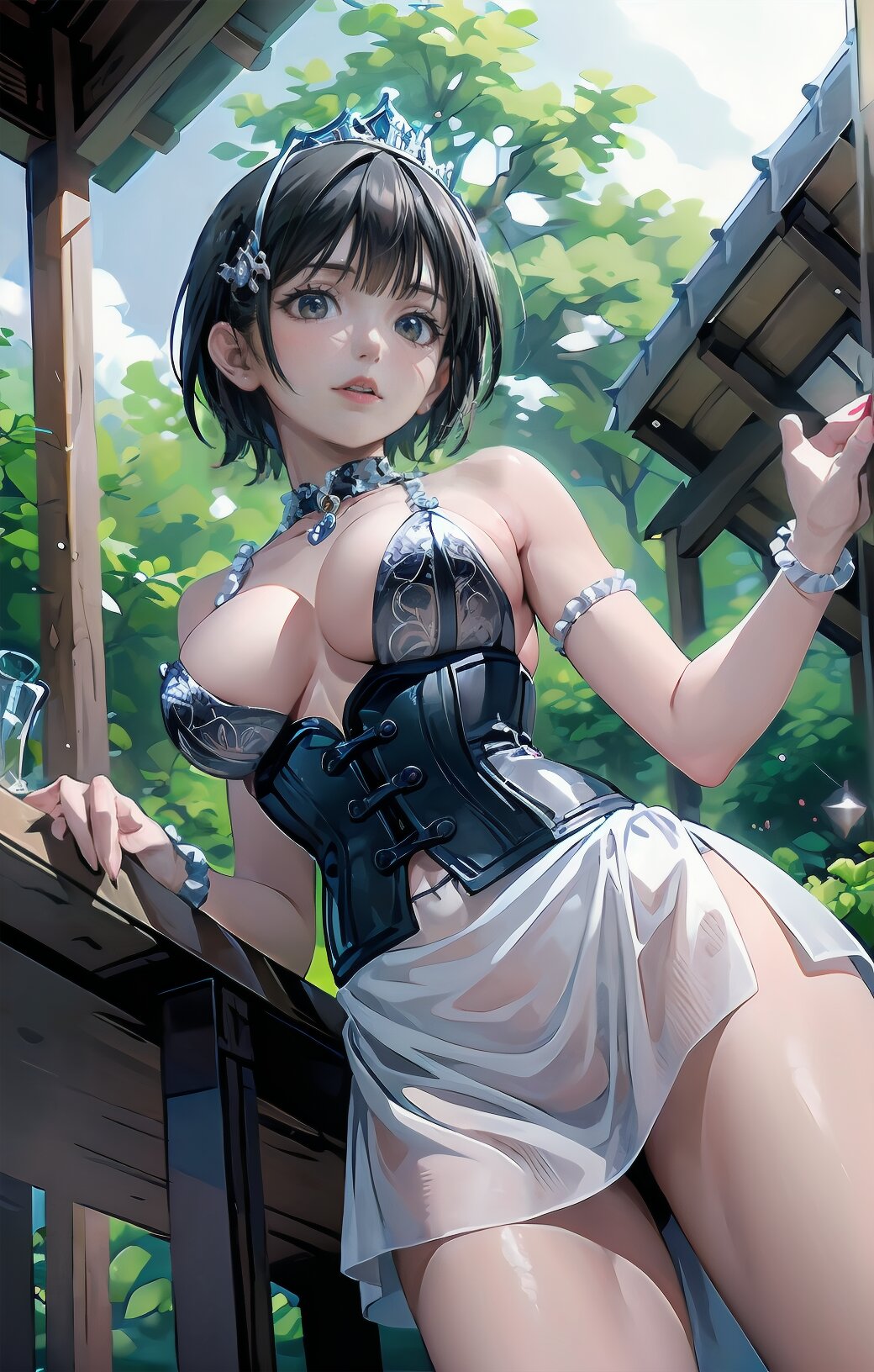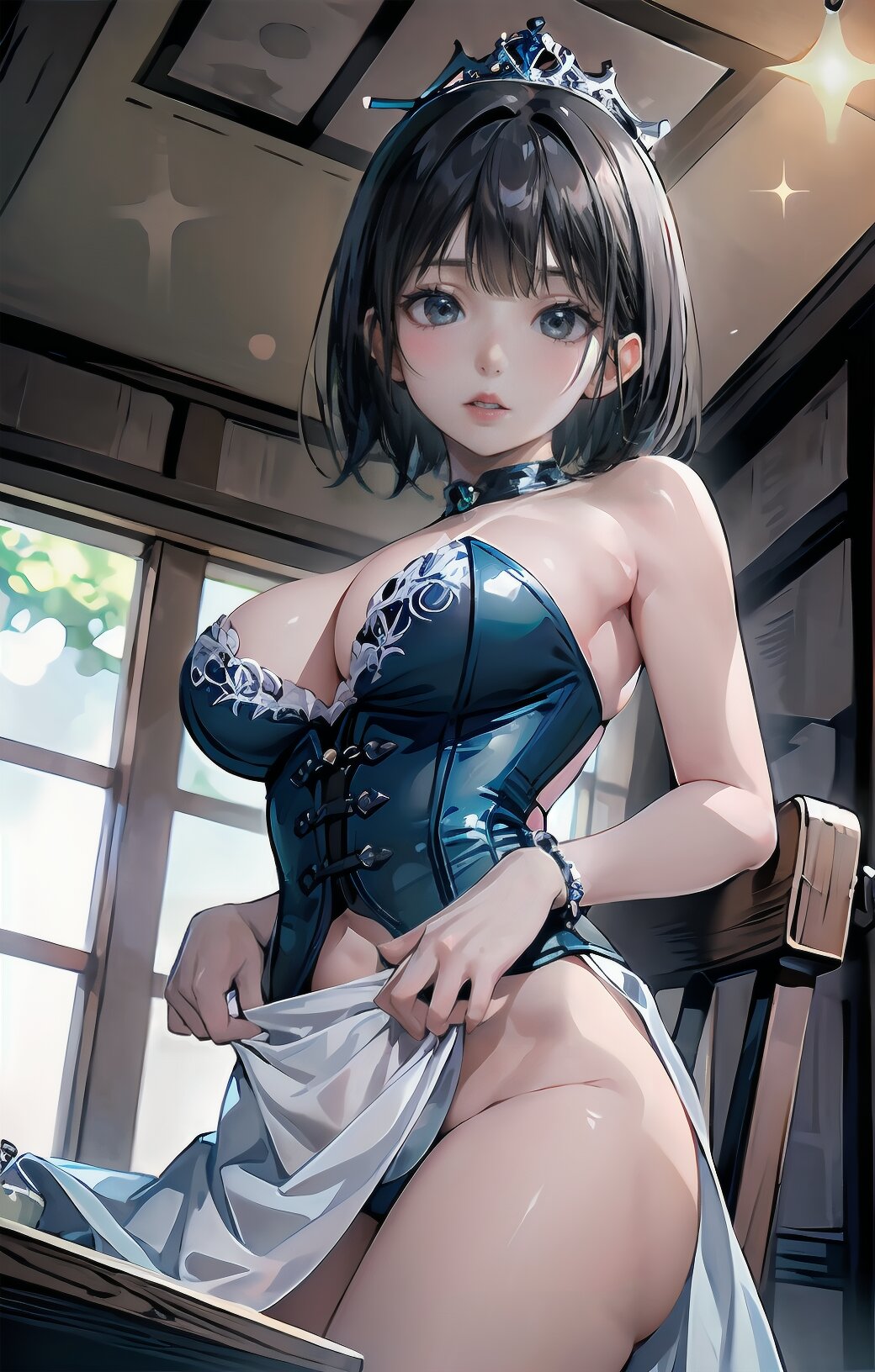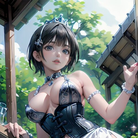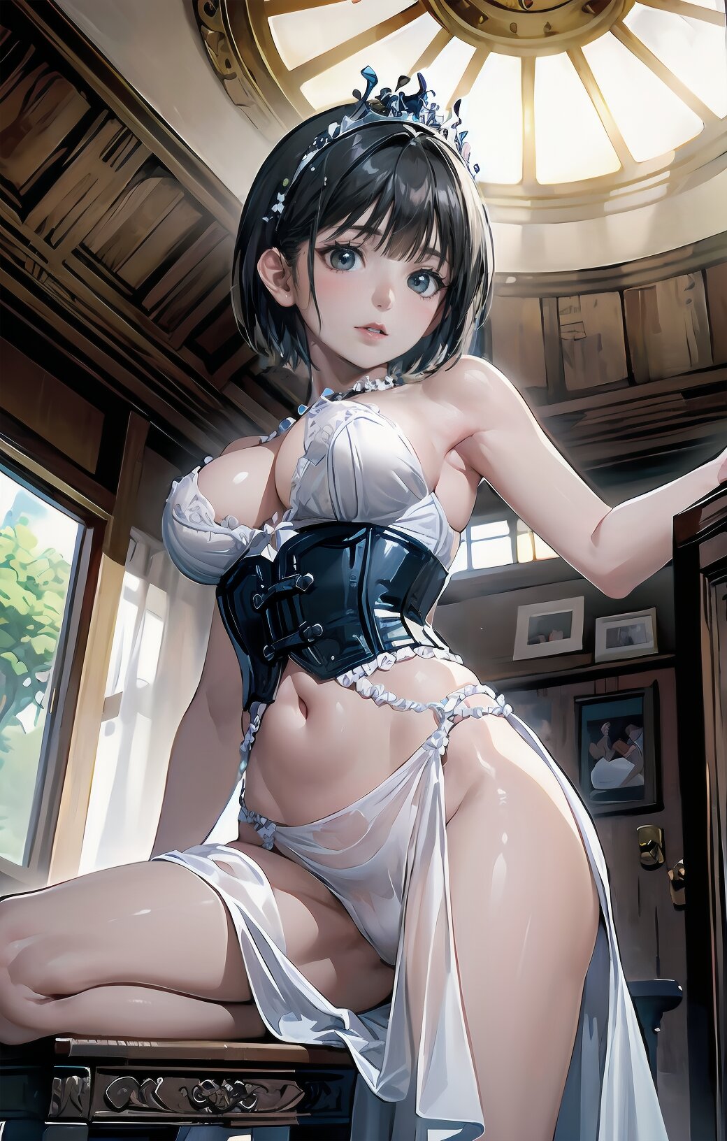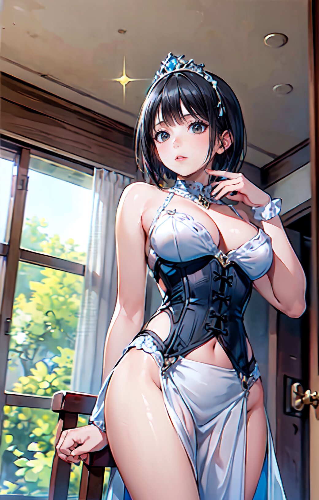 (((from below))), photography, (masterpiece:1.3), (best quality:1.3), (ultra-detailed:1.2), 8K, HDR, (incredibly absurdres:1.2), Kodak portra 400, film grain, lens flare, (vibrant color:1.2), ray tracing, dynamic angle, cinematic angle, 1girl, solo, 18 years old, (((style-princess))), (perfect body), (((face))), black hair, short hair, (cowboy shot, sitting on wood chair: 1.2), huge breasts, highly detailed, beautiful detailed eyes, beautiful detailed glow, detailed light, Japanese old house, <lora:amiMi_v01:0.8>