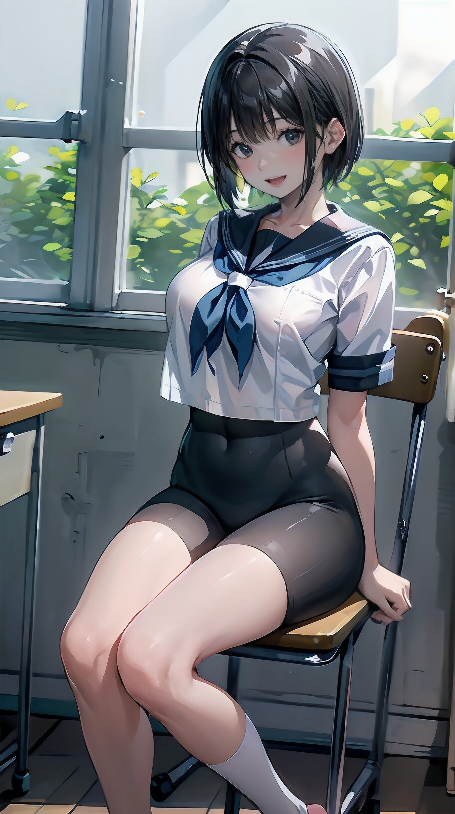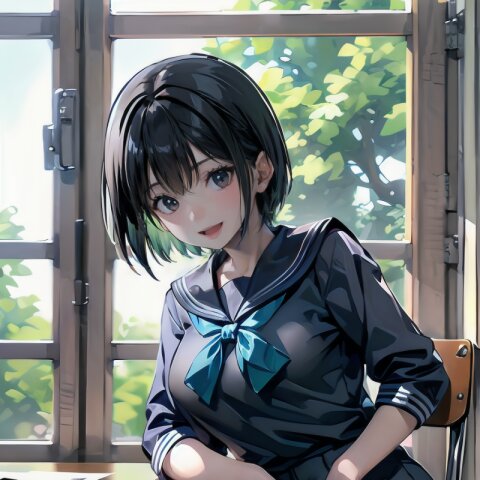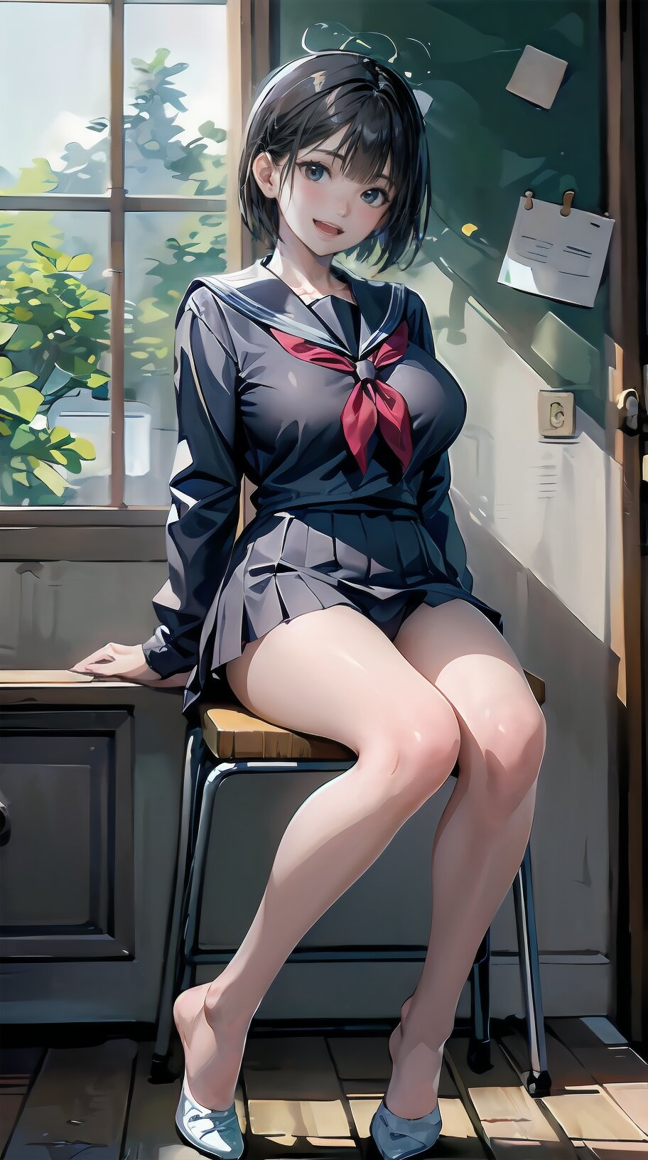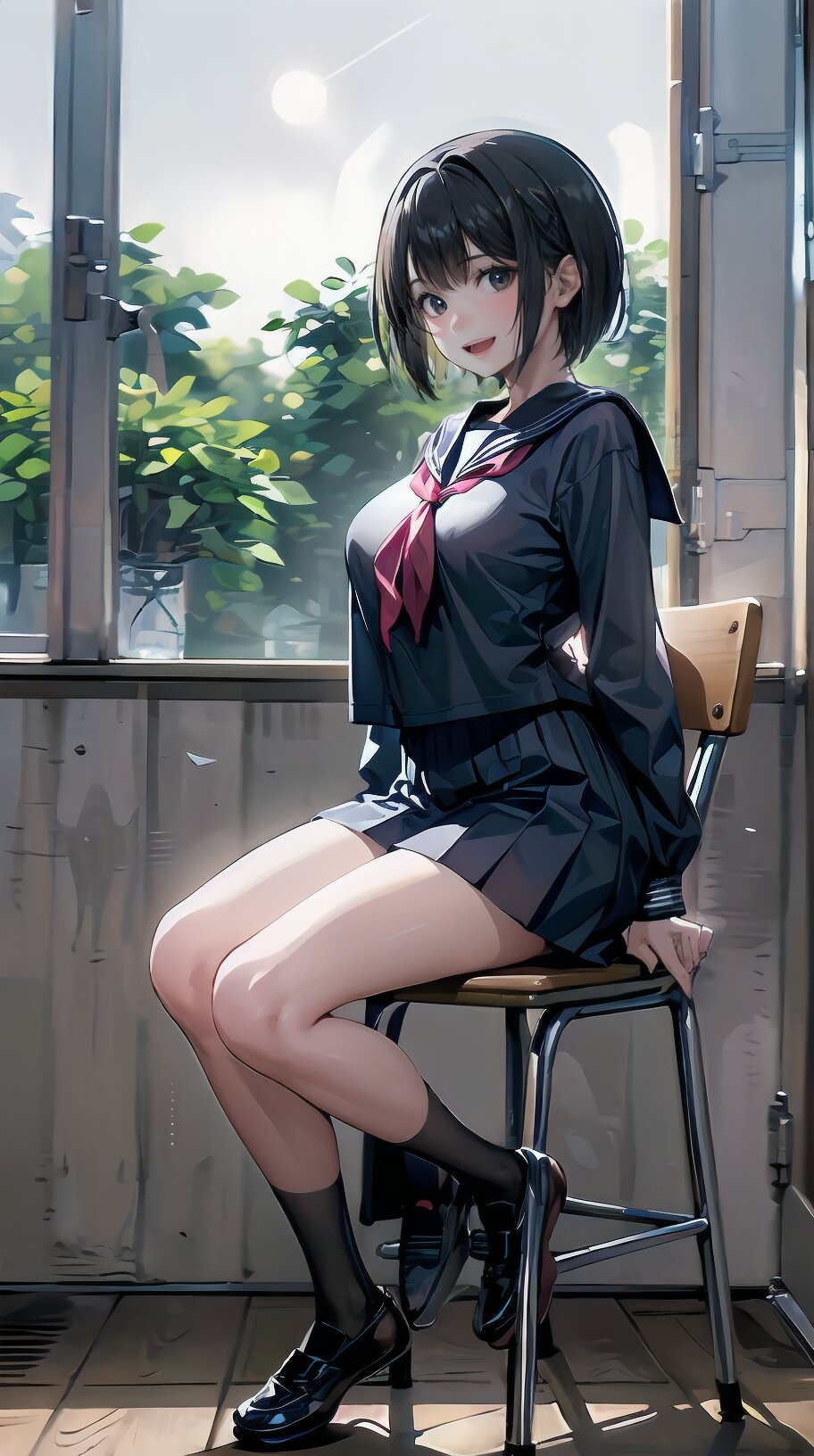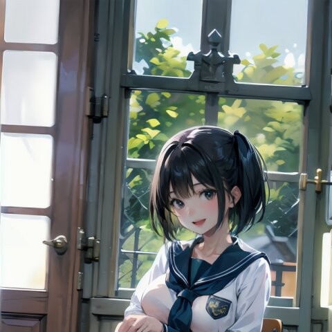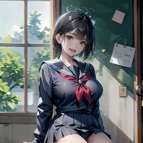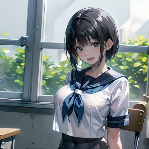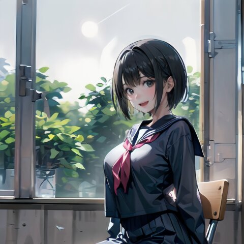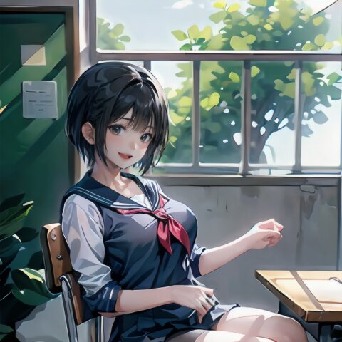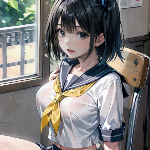 (((from front))), photography, (masterpiece:1.3), (best quality:1.3), (ultra-detailed:1.2), 8K, HDR, (incredibly absurdres:1.2), Kodak portra 400, film grain, lens flare, (vibrant color:1.2), ray tracing, dynamic angle, cinematic angle, 1girl, solo, 18 years old, (((student))), perfect body, (((school uniform, sailor suit))), black hair, short hair, (full body, sitting on wood chair: 1.2), huge breasts, highly detailed, beautiful detailed eyes, beautiful detailed glow, detailed light, Japanese old house, <lora:amiMi_v01:0.8>