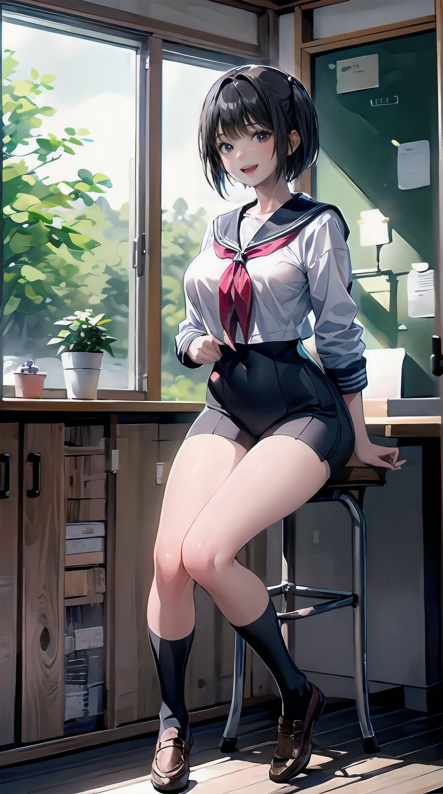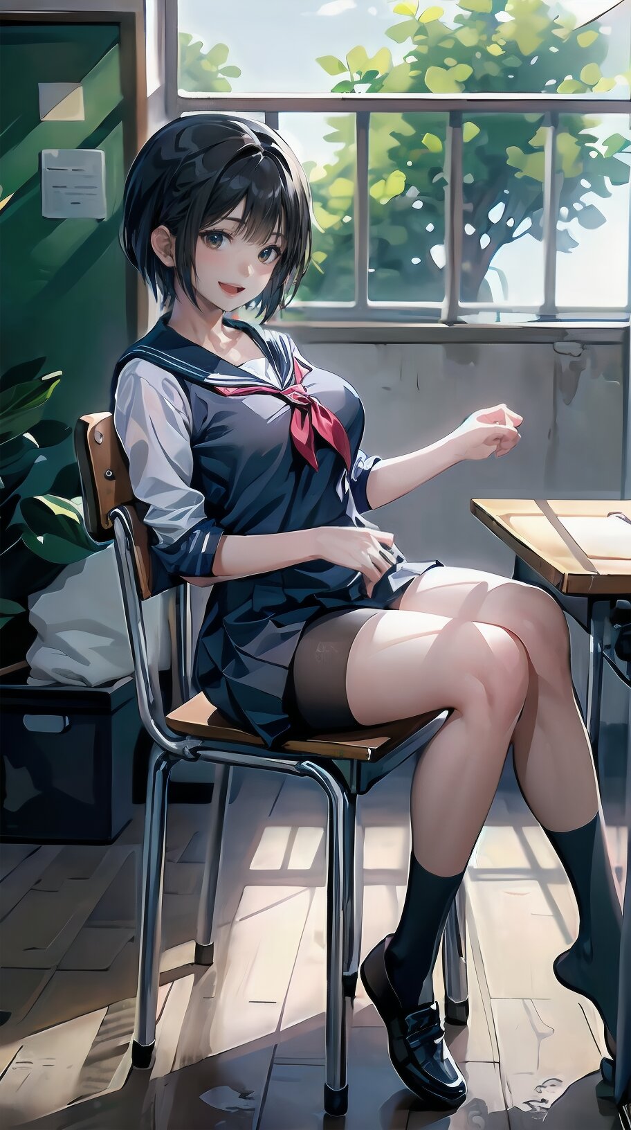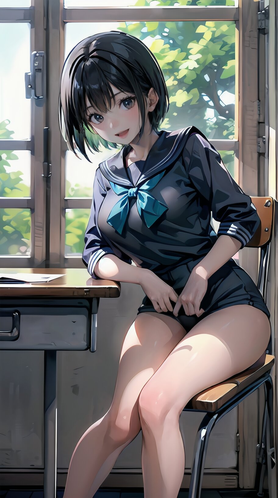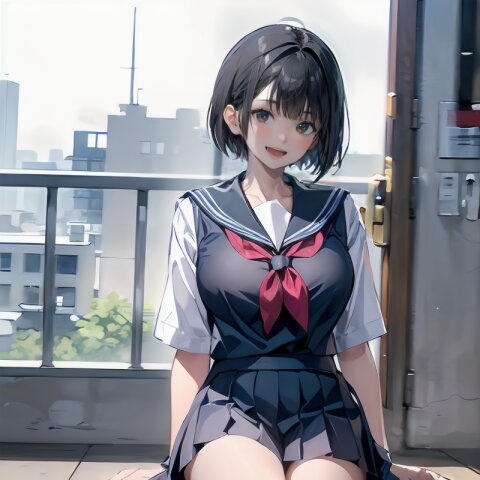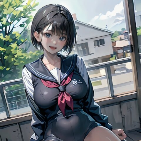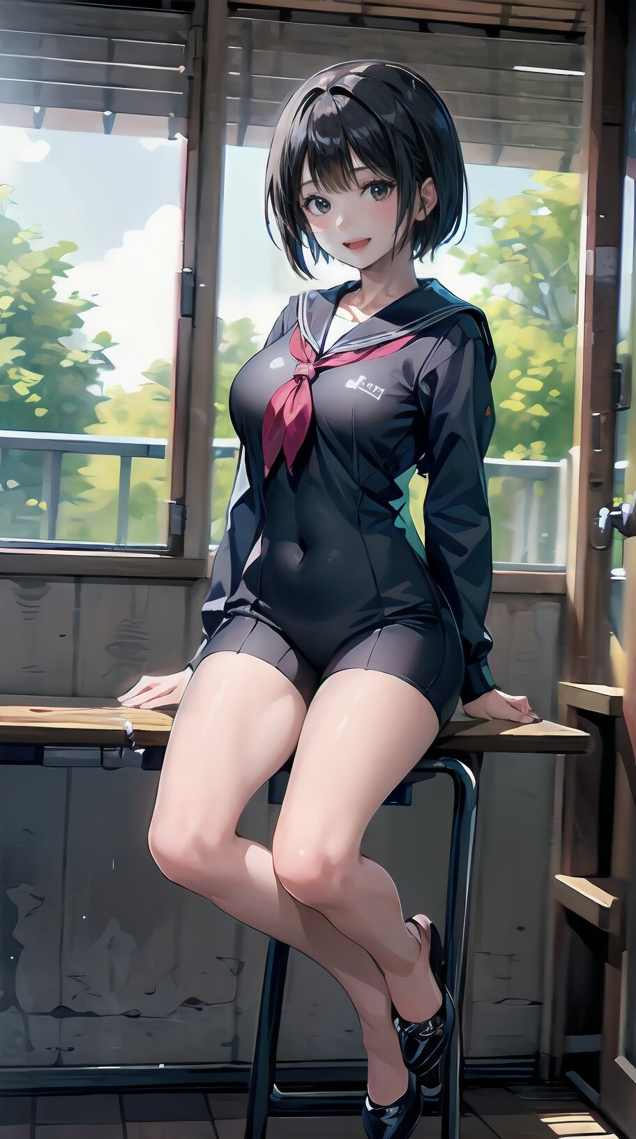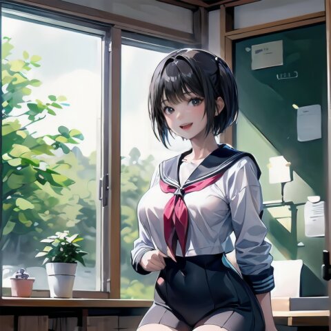 (((from front))), photography, (masterpiece:1.3), (best quality:1.3), (ultra-detailed:1.2), 8K, HDR, (incredibly absurdres:1.2), Kodak portra 400, film grain, lens flare, (vibrant color:1.2), ray tracing, dynamic angle, cinematic angle, 1girl, solo, 18 years old, (((student))), perfect body, (((school uniform, sailor suit))), black hair, short hair, (full body, sitting on wood chair: 1.2), huge breasts, highly detailed, beautiful detailed eyes, beautiful detailed glow, detailed light, Japanese old house, <lora:amiMi_v01:0.8>