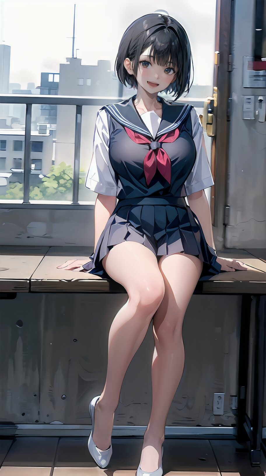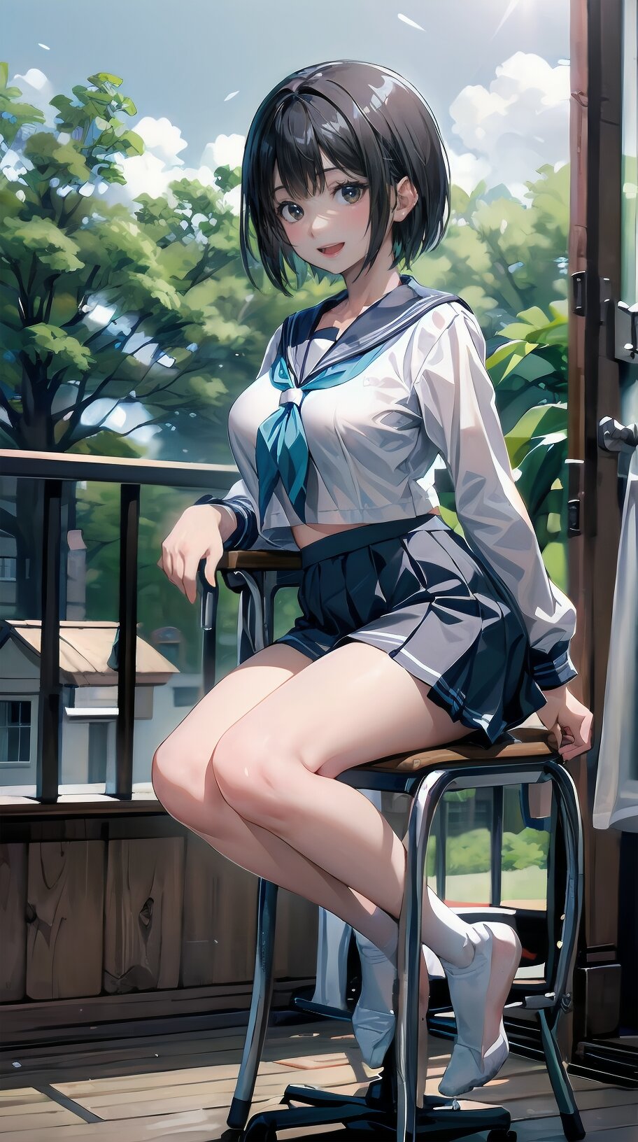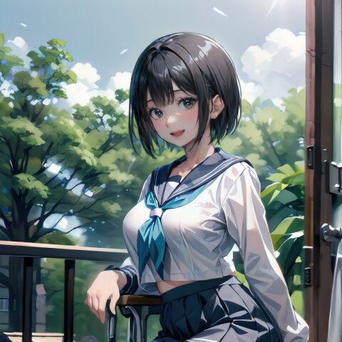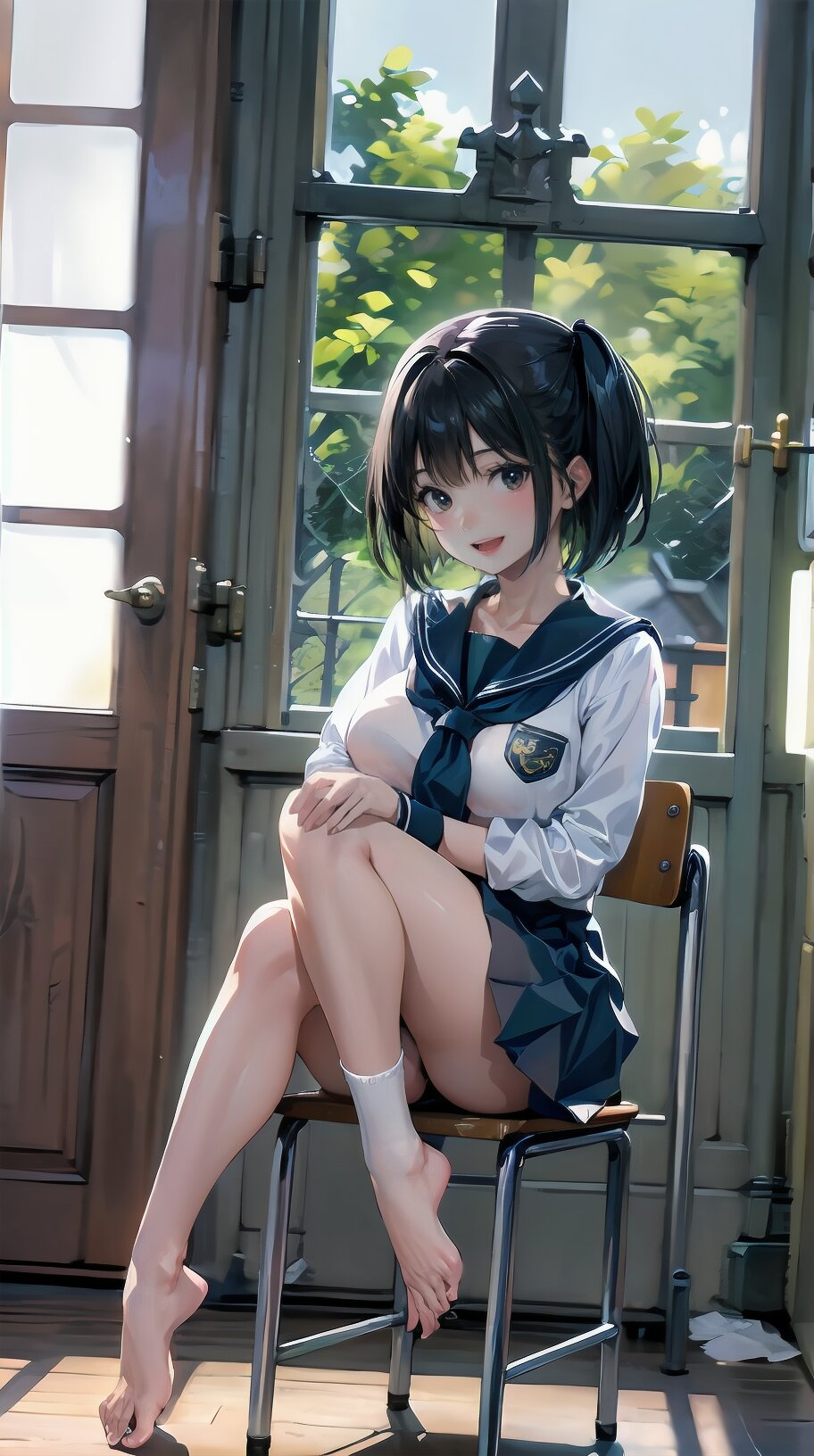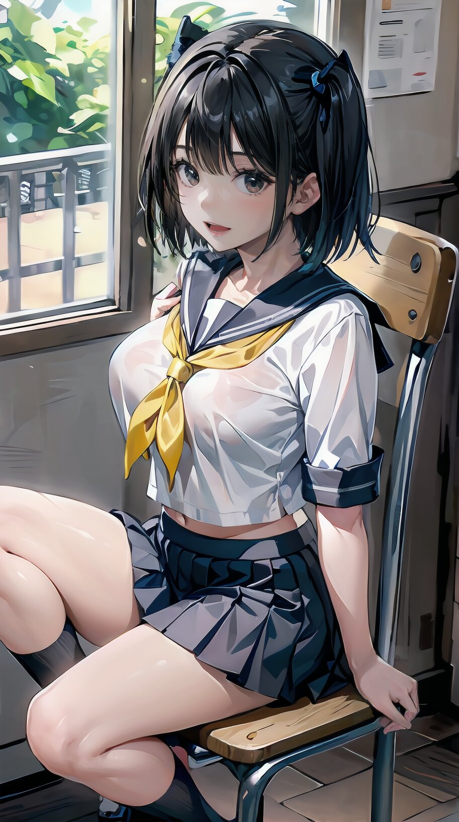 (((from front))), photography, (masterpiece:1.3), (best quality:1.3), (ultra-detailed:1.2), 8K, HDR, (incredibly absurdres:1.2), Kodak portra 400, film grain, lens flare, (vibrant color:1.2), ray tracing, dynamic angle, cinematic angle, 1girl, solo, 18 years old, (((student))), perfect body, (((school uniform, sailor suit))), black hair, short hair, (full body, sitting on wood chair: 1.2), huge breasts, highly detailed, beautiful detailed eyes, beautiful detailed glow, detailed light, Japanese old house, <lora:amiMi_v01:0.8>