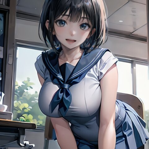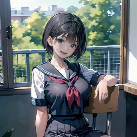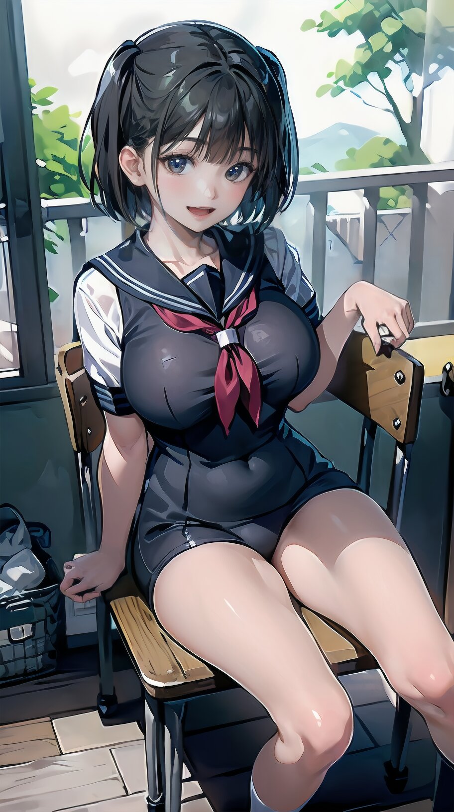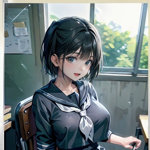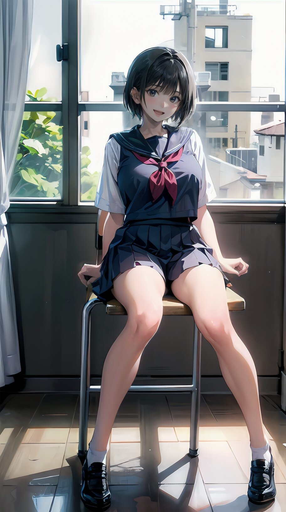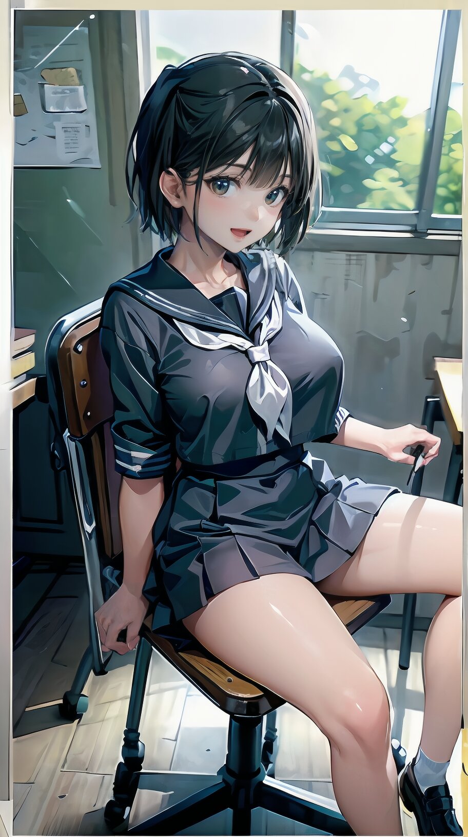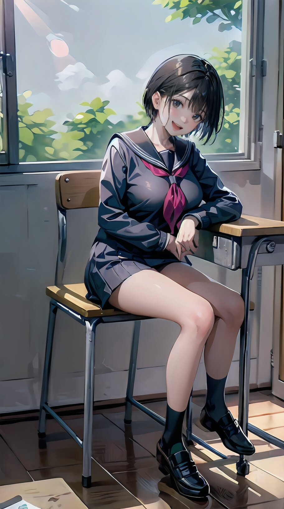 (((from front))), photography, (masterpiece:1.3), (best quality:1.3), (ultra-detailed:1.2), 8K, HDR, (incredibly absurdres:1.2), Kodak portra 400, film grain, lens flare, (vibrant color:1.2), ray tracing, dynamic angle, cinematic angle, 1girl, solo, 18 years old, (((student))), perfect body, (((school uniform, sailor suit))), black hair, short hair, (full body, sitting on wood chair: 1.2), huge breasts, highly detailed, beautiful detailed eyes, beautiful detailed glow, detailed light, Japanese old house, <lora:amiMi_v01:0.8>