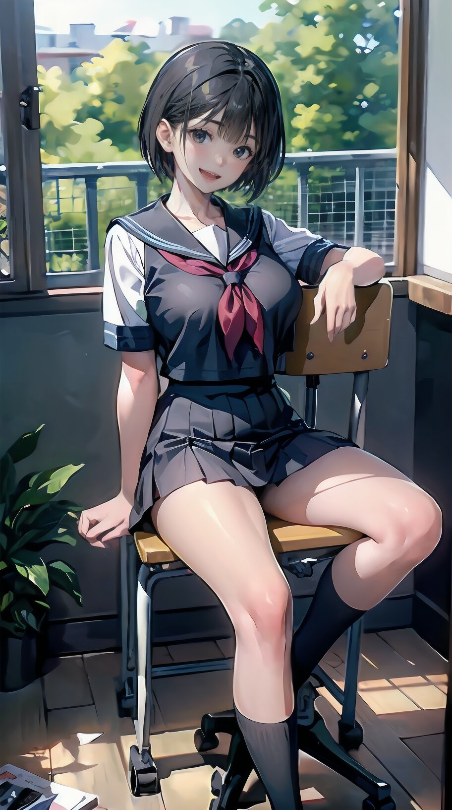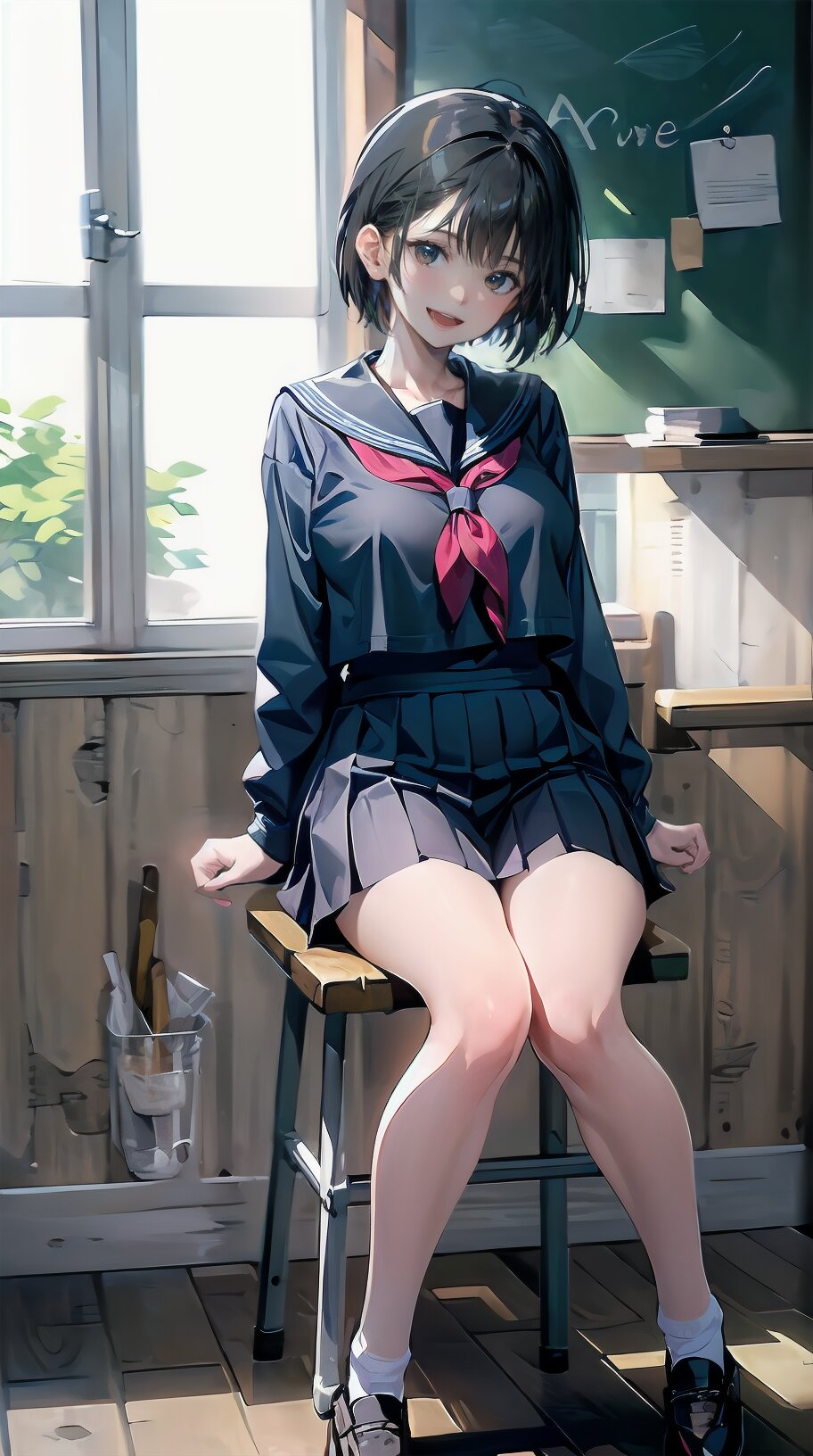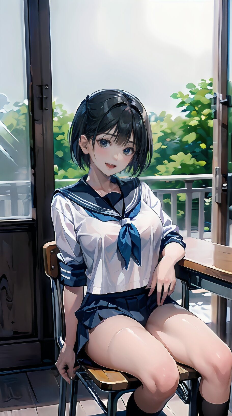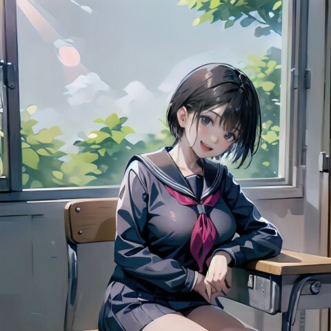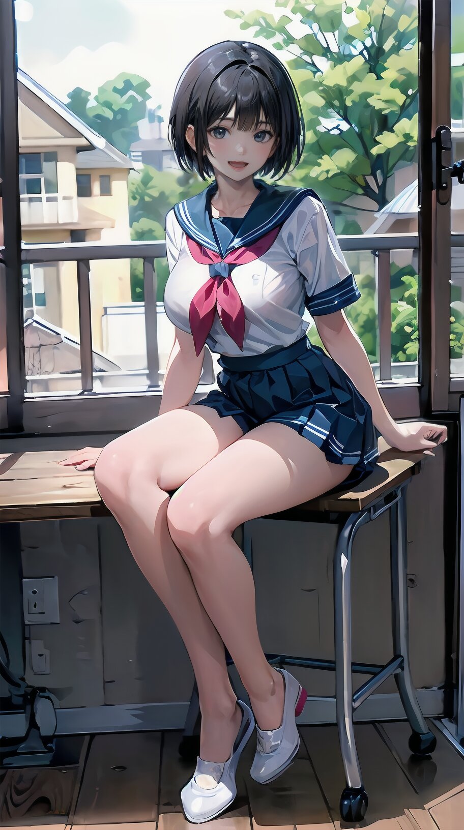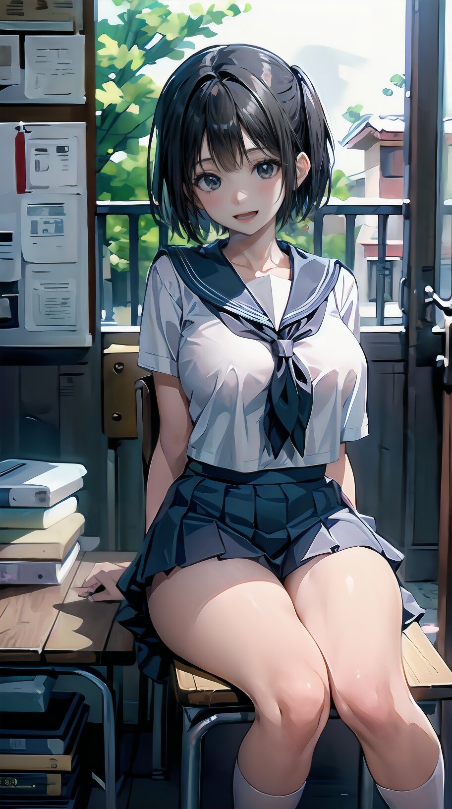(((from front))), photography, (masterpiece:1.3), (best quality:1.3), (ultra-detailed:1.2), 8K, HDR, (incredibly absurdres:1.2), Kodak portra 400, film grain, lens flare, (vibrant color:1.2), ray tracing, dynamic angle, cinematic angle, 1girl, solo, 18 years old, (((student))), perfect body, (((school uniform, sailor suit))), black hair, short hair, (full body, sitting on wood chair: 1.2), huge breasts, highly detailed, beautiful detailed eyes, beautiful detailed glow, detailed light, Japanese old house, <lora:amiMi_v01:0.8>
