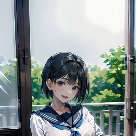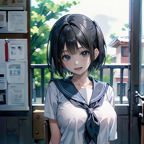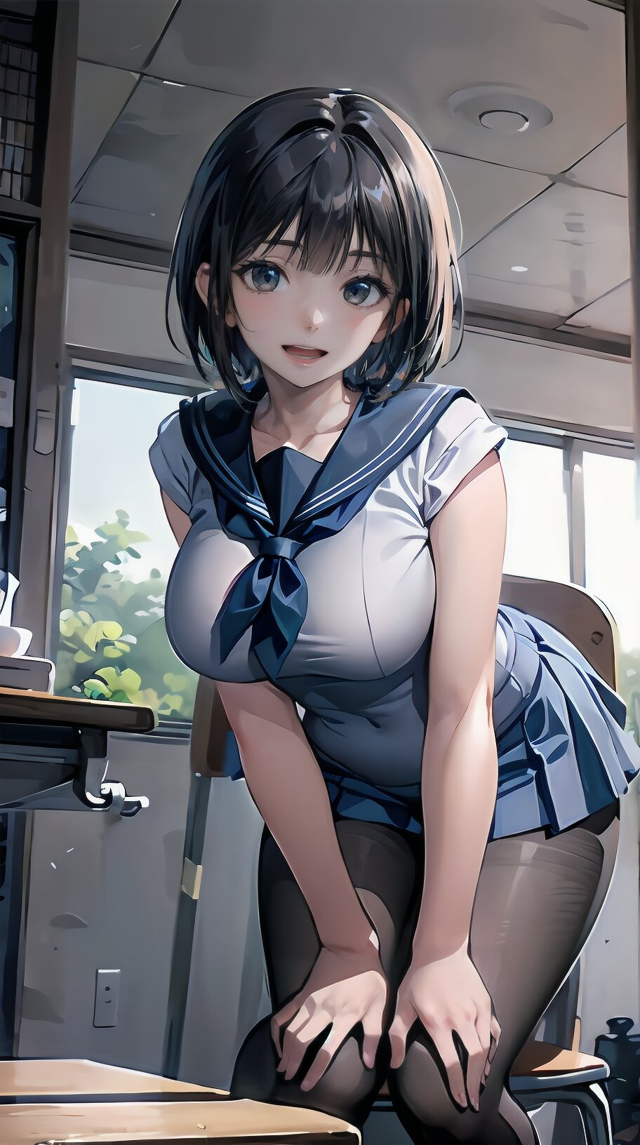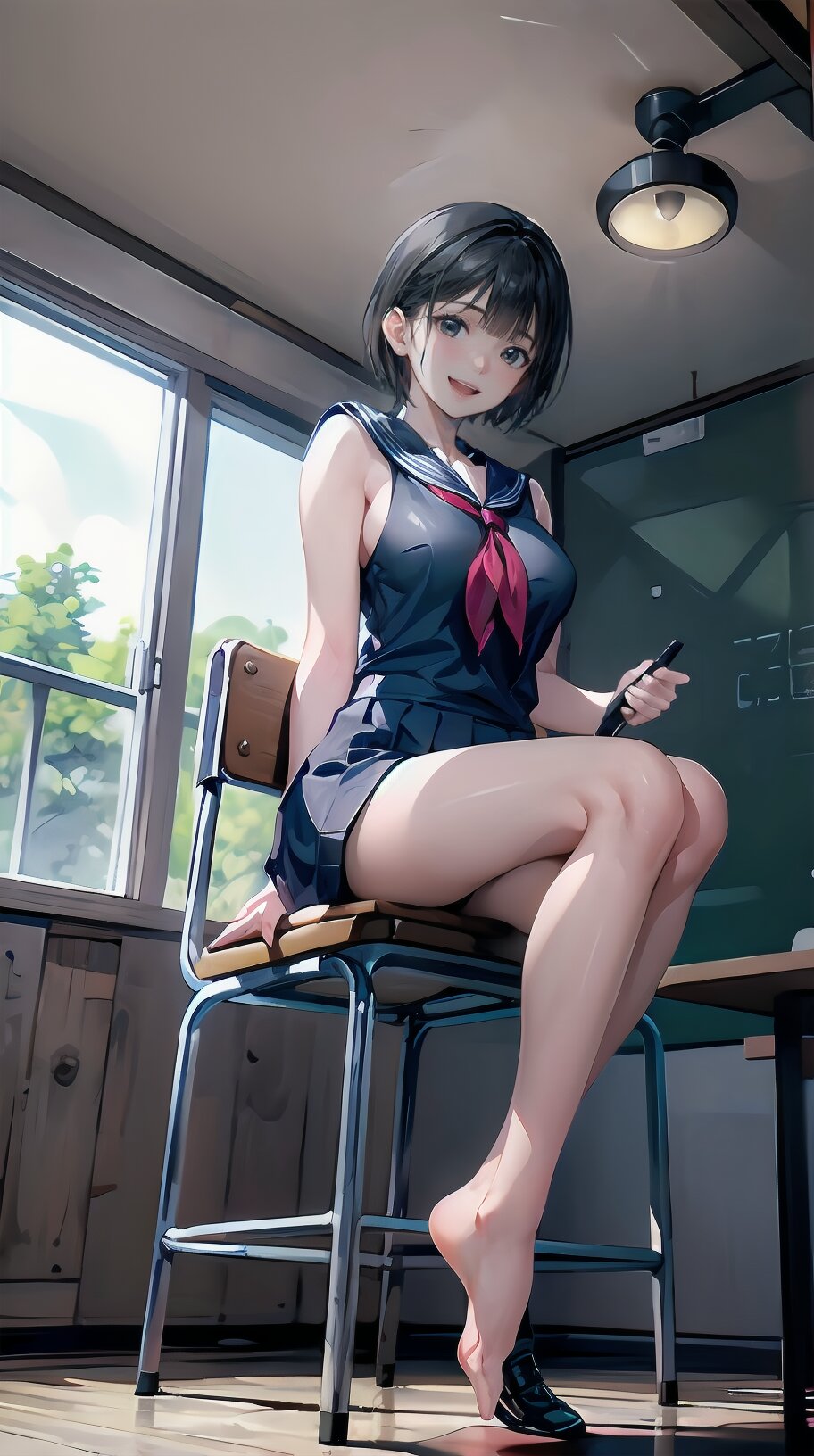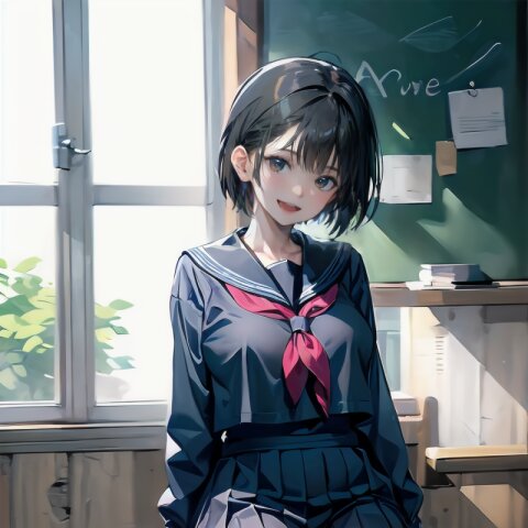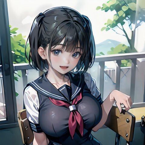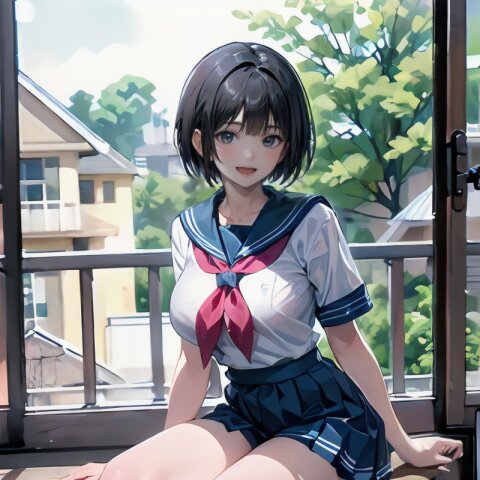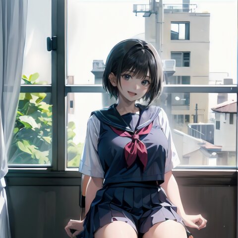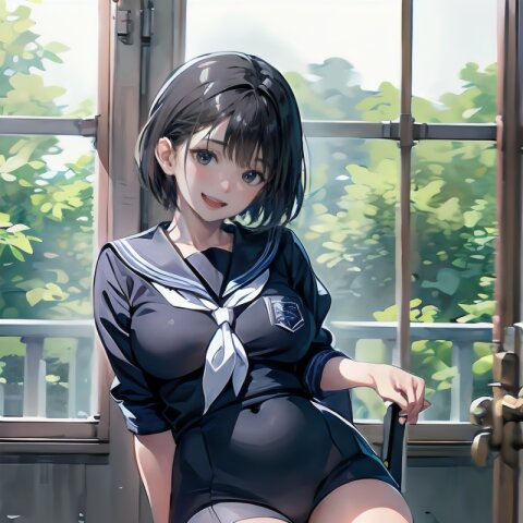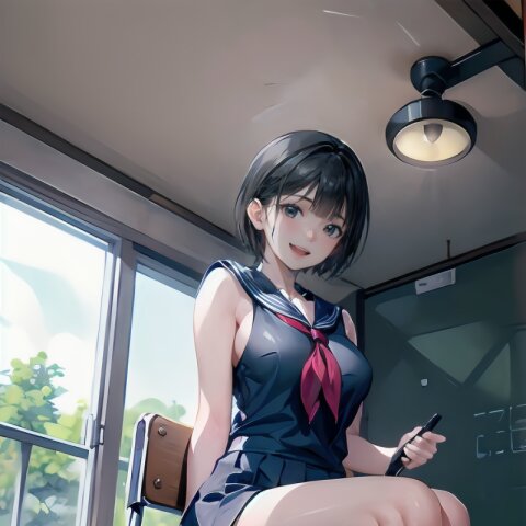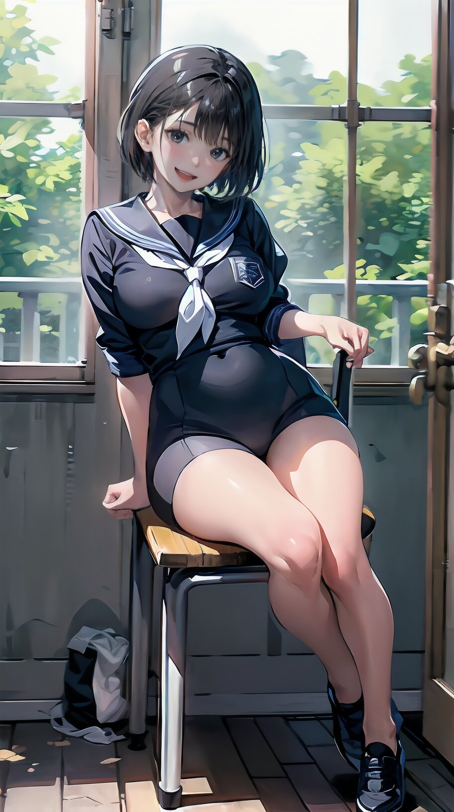 (((from front))), photography, (masterpiece:1.3), (best quality:1.3), (ultra-detailed:1.2), 8K, HDR, (incredibly absurdres:1.2), Kodak portra 400, film grain, lens flare, (vibrant color:1.2), ray tracing, dynamic angle, cinematic angle, 1girl, solo, 18 years old, (((student))), perfect body, (((school uniform, sailor suit))), black hair, short hair, (full body, sitting on wood chair: 1.2), huge breasts, highly detailed, beautiful detailed eyes, beautiful detailed glow, detailed light, Japanese old house, <lora:amiMi_v01:0.8>