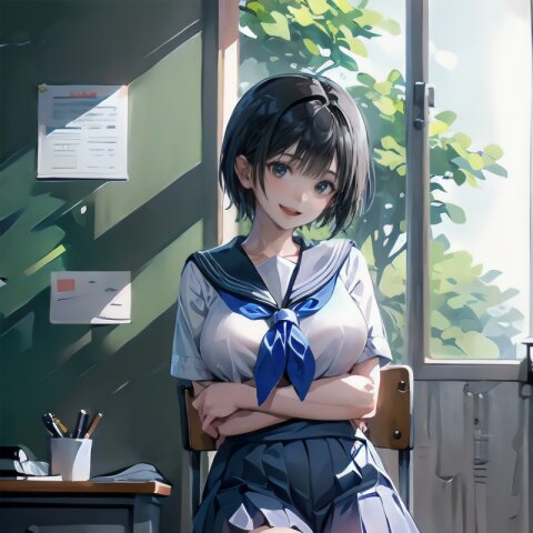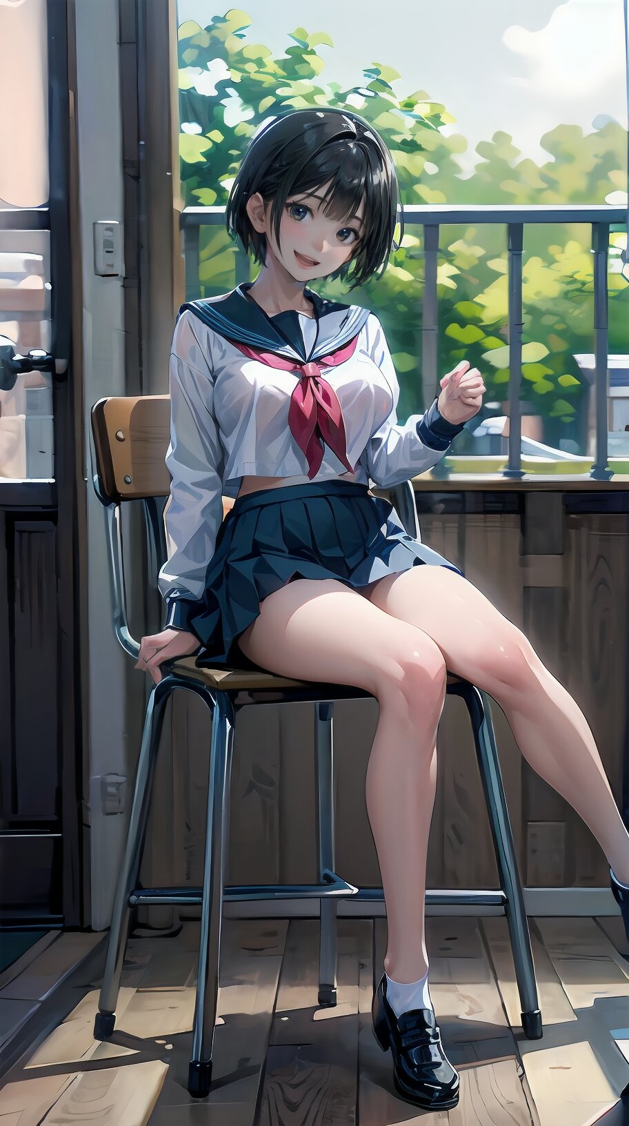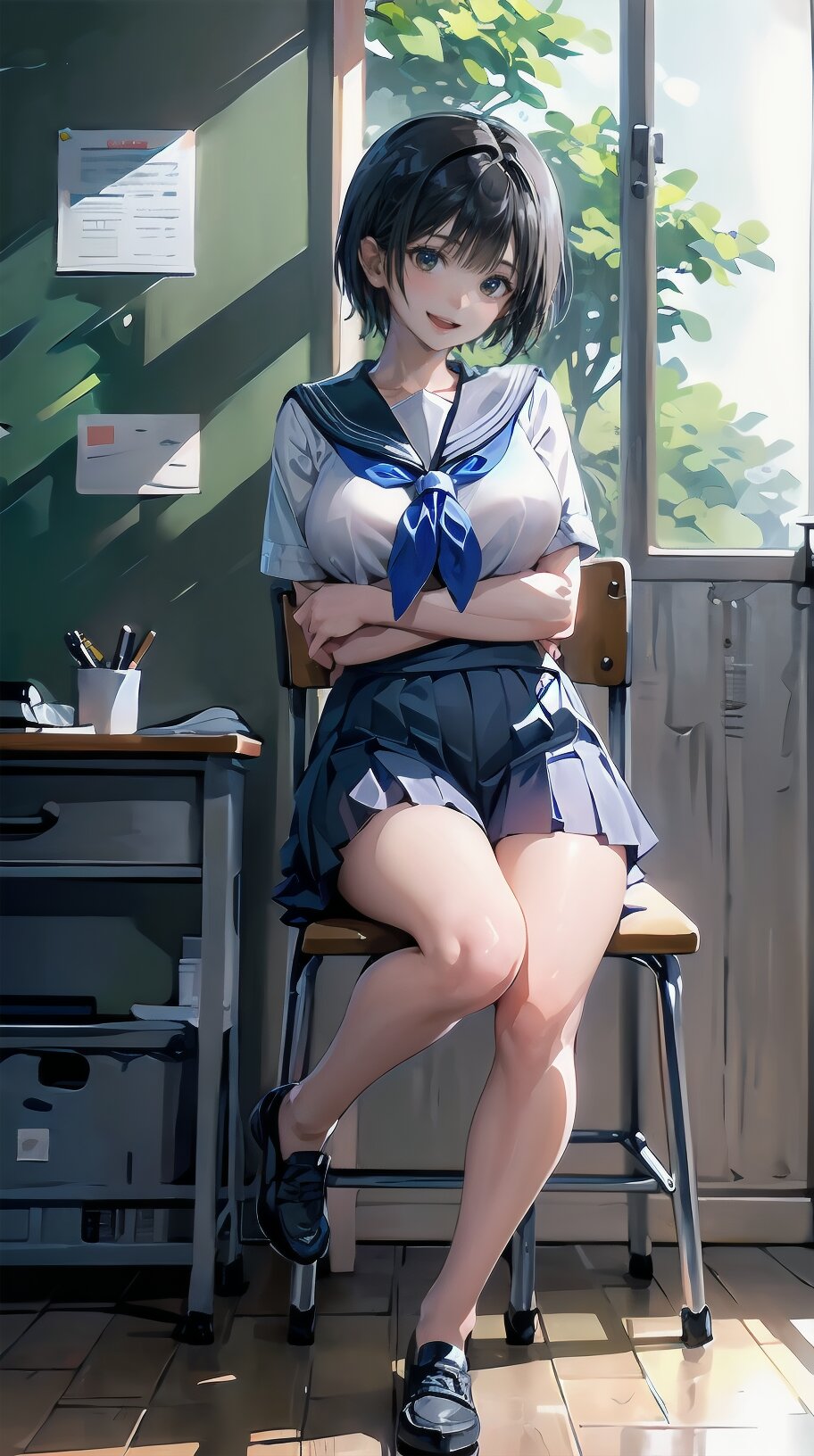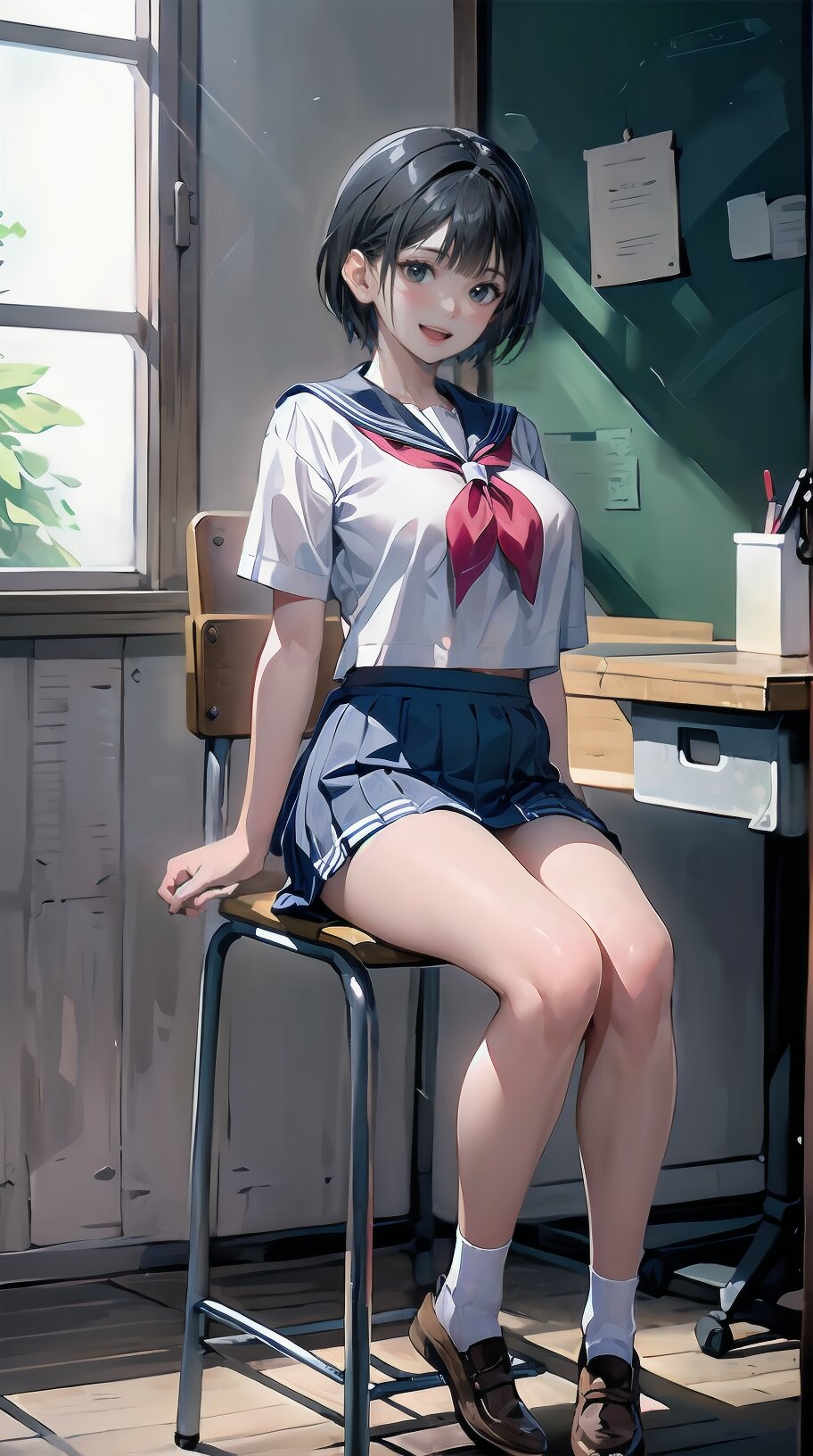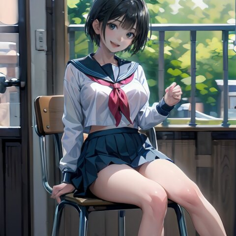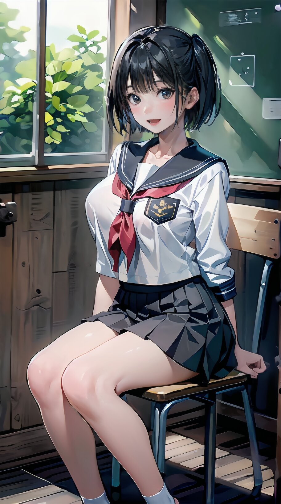 (((from front))), photography, (masterpiece:1.3), (best quality:1.3), (ultra-detailed:1.2), 8K, HDR, (incredibly absurdres:1.2), Kodak portra 400, film grain, lens flare, (vibrant color:1.2), ray tracing, dynamic angle, cinematic angle, 1girl, solo, 18 years old, (((student))), perfect body, (((school uniform, sailor suit))), black hair, short hair, (full body, sitting on wood chair: 1.2), huge breasts, highly detailed, beautiful detailed eyes, beautiful detailed glow, detailed light, Japanese old house, <lora:amiMi_v01:0.8>