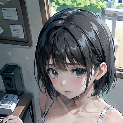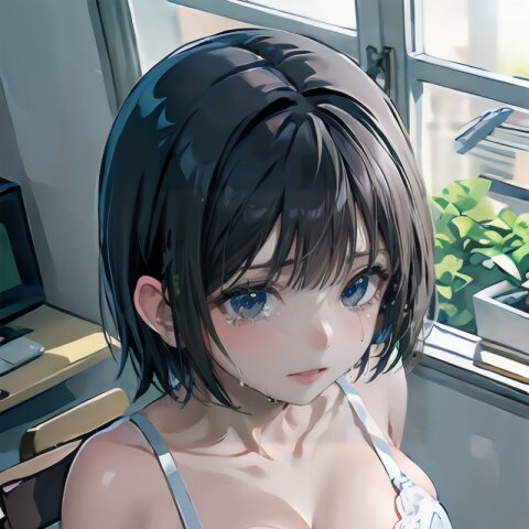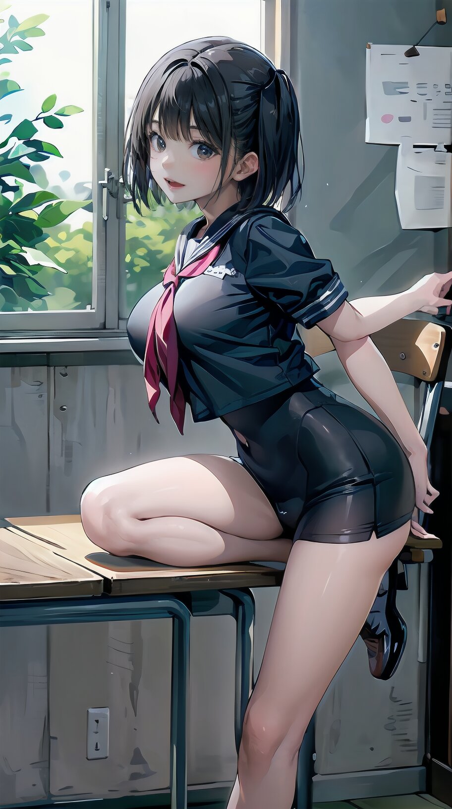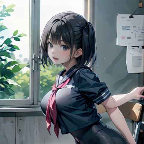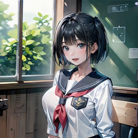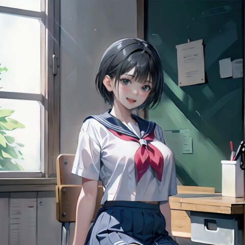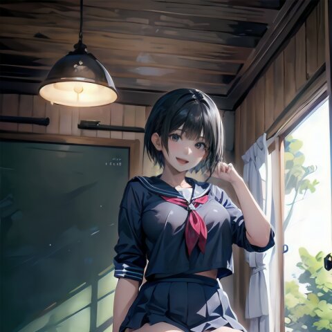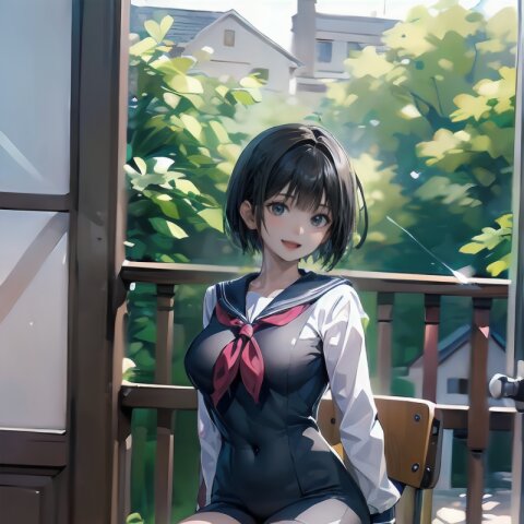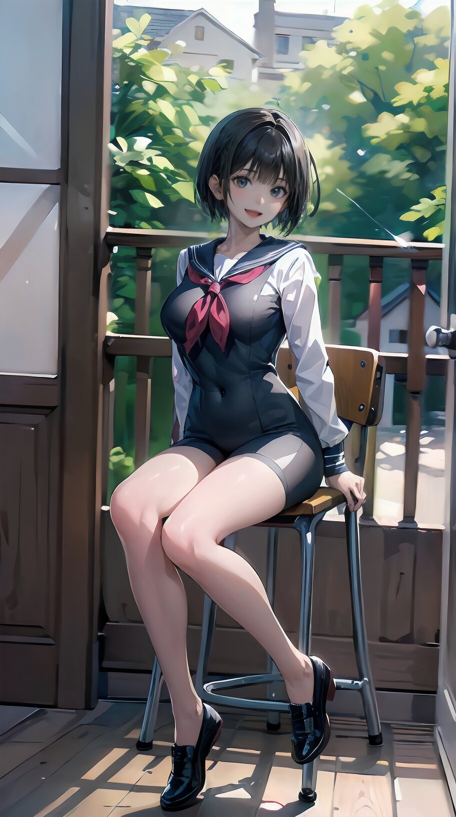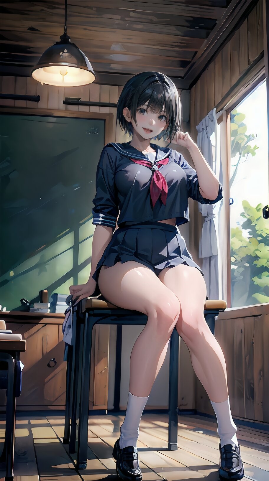 (((from front))), photography, (masterpiece:1.3), (best quality:1.3), (ultra-detailed:1.2), 8K, HDR, (incredibly absurdres:1.2), Kodak portra 400, film grain, lens flare, (vibrant color:1.2), ray tracing, dynamic angle, cinematic angle, 1girl, solo, 18 years old, (((student))), perfect body, (((school uniform, sailor suit))), black hair, short hair, (full body, sitting on wood chair: 1.2), huge breasts, highly detailed, beautiful detailed eyes, beautiful detailed glow, detailed light, Japanese old house, <lora:amiMi_v01:0.8>