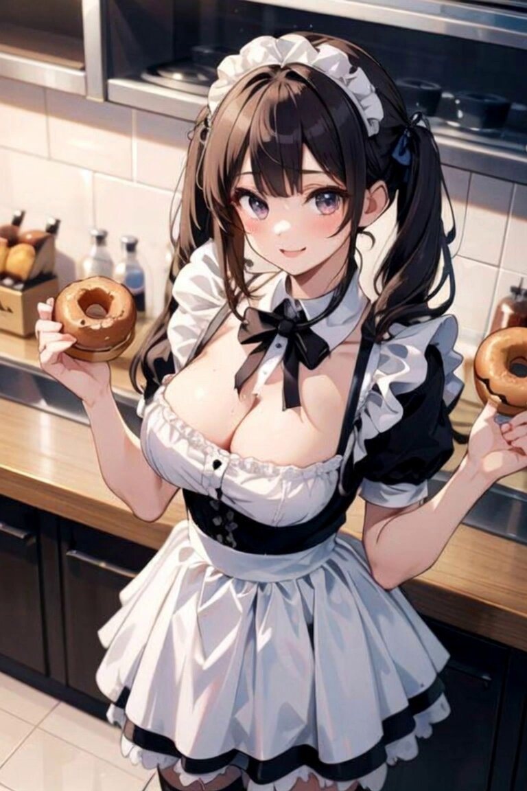 maid,kneehighs,cafeteria,tumbler,coffee,doughnut,standing,beckoning,1girl,bishoujo,waitress,underage,shiny_skin,glamor,twintails,huge breasts,slender_waist,happy,開いた胸元、胸の谷間、(Flat Color: 0.4), (Medium Watercolor: 0.44), (Sketch: 0.2), Cute Girl, Cute, (Pastel Theme: 0.5), (Depth of Field: 1.3), (Bokeh: 1.3), (Perspective: 0.2), Observe the Beholder, Sophisticated, (Contrapposto: 0.6), (Pastel Color: 0.2),zettai_ryouiki