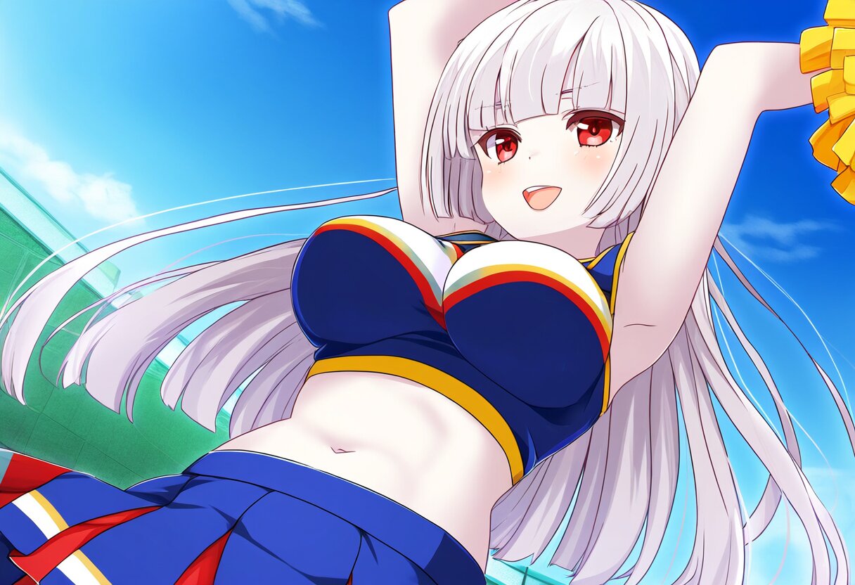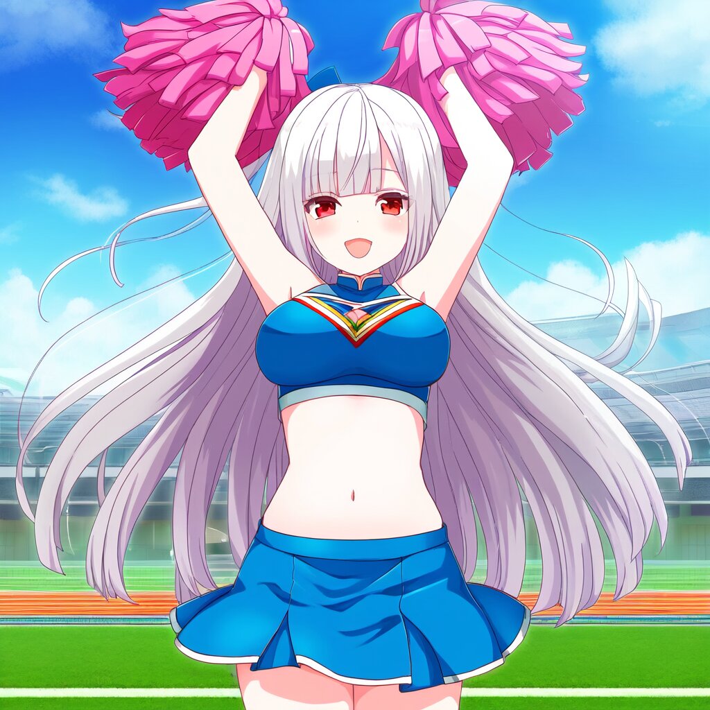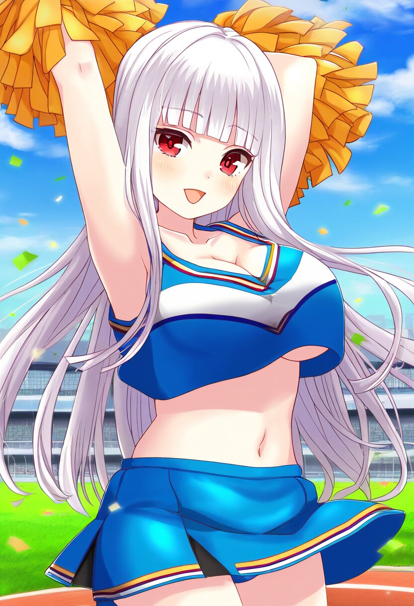 {{{highly detailed}}}, {{official style}}, {{game cg}}, {{intricate}}, {{tenka hyakken, girlfriend (kari)}}, 1girl, solo, red eyes, {{{long hair, straight hair}}}, white hair, blunt bangs, {{{{white skin}}}}, large breasts, light smile, blush, open mouth, navel, {{wearing blue cheerleader costume}}, {{{pompon}}}, {{{arms up}}}, cowboy shot, blue sky, grasslands, school, {{{masterpiece}}}, {{{best quality}}}, {{{very aesthetic}}}, {{{ultra-detailed}}}, {illustration}, {{{extremely detailed}}}, {{{an extremely delicate and beautiful}}}
