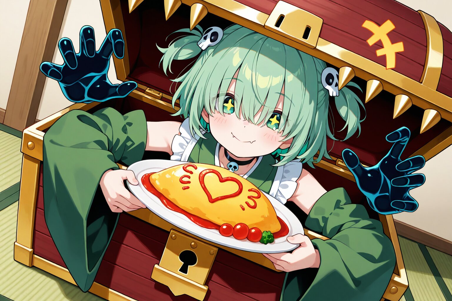 1 little girl, solo, diagonal angle, masterpiece, best quality, amazing quality, very aesthetic, cobalt green hair, short hair, messy hair, (hair over eyes:1.2), green eyes, demon fangs, +_+, closed mouth, smile, cheerful, +++, notice lines, choker, green wa maid outfit, (oversized sleeves:1.2), detached sleeves, (floating black ghosty hands:1.2), skull hair ornament, in mimic chest, omurice, draw on omurice, japanese room,