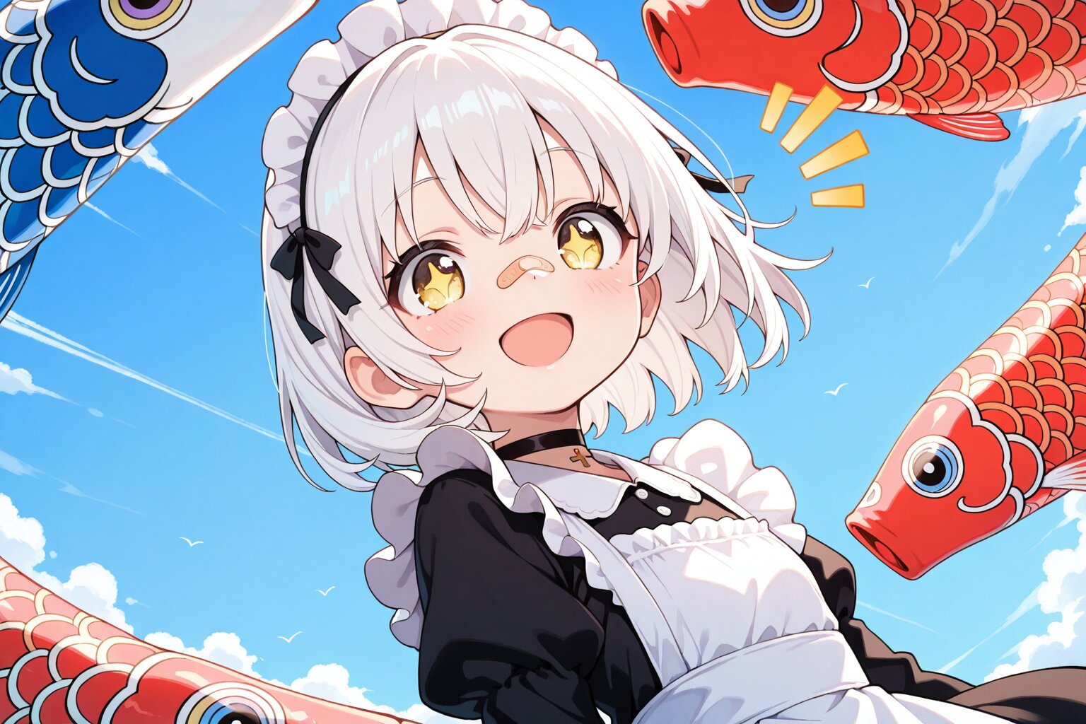 1 little girl, solo, diagonal angle, masterpiece, best quality, amazing quality, very aesthetic, white hair, short hair, yellow eyes, +_+, open mouth, smile, cheerful, +++, notice lines, choker, maid outfit, bandaid on nose, koinobori, clear sky,