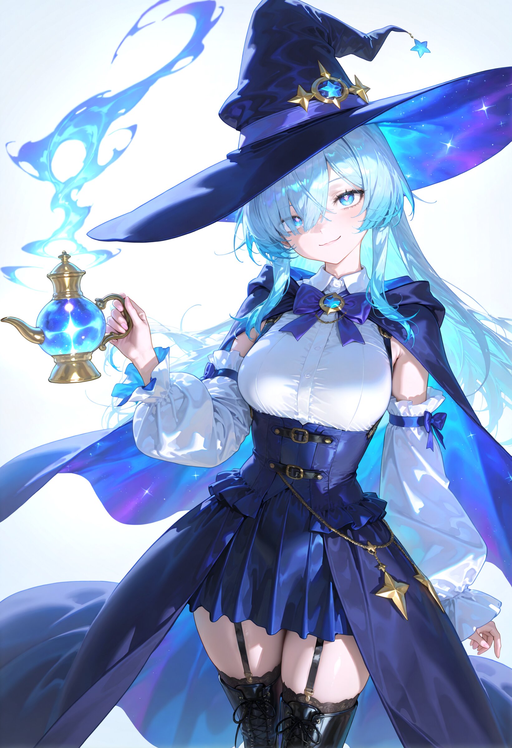 (cowboy shot:1.3), feet out of frame (from above,looking up:1.2) , 1girl, witch girl, blue eyes, beautiful iridescence eyes, beautiful detailed eyes, beautiful light blue hair, long bangs, long disheveled beautiful hair, first-rate female bodies, perfect body, beautiful breasts, framed breasts, cool face, (Beautiful Lips:0.7),, (stylish beautiful witch dress:1.2), detached sleeves, (cute blue and dark blue witch girl costume:0.9), (white blouse:1.3), bow tie, witch long skirt (overskirt:1.1) green cape, (blue galaxy witch hat:1.1), lace-up boots on feet, stockings and suspenders,, mysterious face, light smile,smirk cast a magic, swirling energy,energy magic, holding magic lamp, zombie pose head tilt, super fine concept art, hard surface, 8K, unreal engine, masterpiece, best quality, amazing quality, very aesthetic, absurdres you can add scenery, (volumetric lighting), To make the background more distinctive. professional art lots of details, , overexposure, shiny-glistening, (watercolor style:1.0), (pastel color style:1.0) <lora:noline (1):-0.5> <lora:sdxl2-flat2-512b:-1.0> <lora:facelightup_xl_v10:0.5>