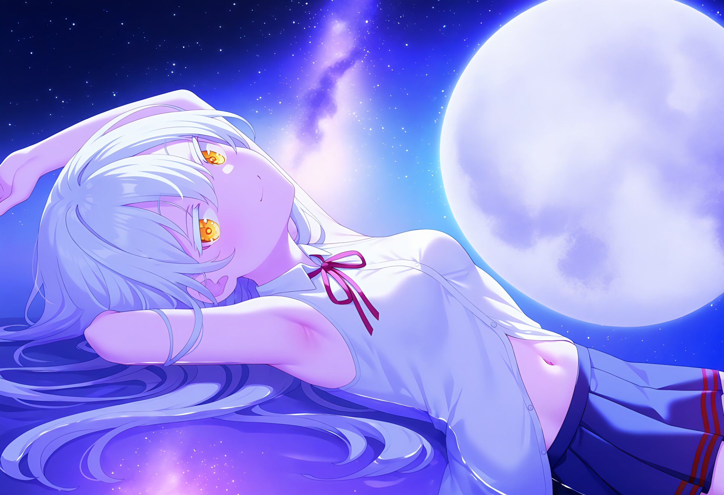 loli, skinny, (petite:1.2), small breasts, blonde eyes, yellow eyes, sterling silver hair, white hair, long hair, hair between eyes, (jitome:1.1), straight hair, colored eyelashes, glowing eyes, sleeveless shirt, collared shirt, neck ribbon, red ribbon, black skirt, pleated skirt, smile, doyagao, navel, arm above head, arm up, upper body, night sky, starry sky, reflective water, reflection, afloat, partially submerged, shallow water, sky, water, dutch angle, on back, looking at viewer, (from side:1.2), looking to the side, full moon, milky way, big moon, transparent,