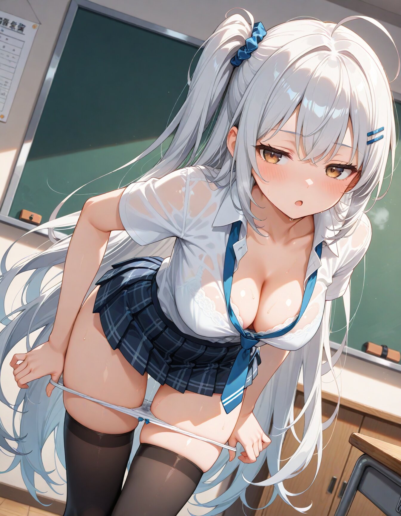 Masterpiece, best quality, high quality, ultra-detailed, ultra-high resolution, best beauty 8K, 1girl, solo, 15 yo, (gray hair), bad mood, wet, perspiration, cute eye, kawaii, bishoujo, blush, brown eyes, medium breasts, bra, ahoge, right side ponytail, white Short sleeve, tie, very short plaid miniskirt, (see-through:0.6), ,thighs, underwear, white panties, standing, bent over, undressing, pulling own white panties, (pussy juice stain), open mouth, embarrassed, blush, heavy breathing, half closed eyes, classroom, cowboy shot, dutch angle,