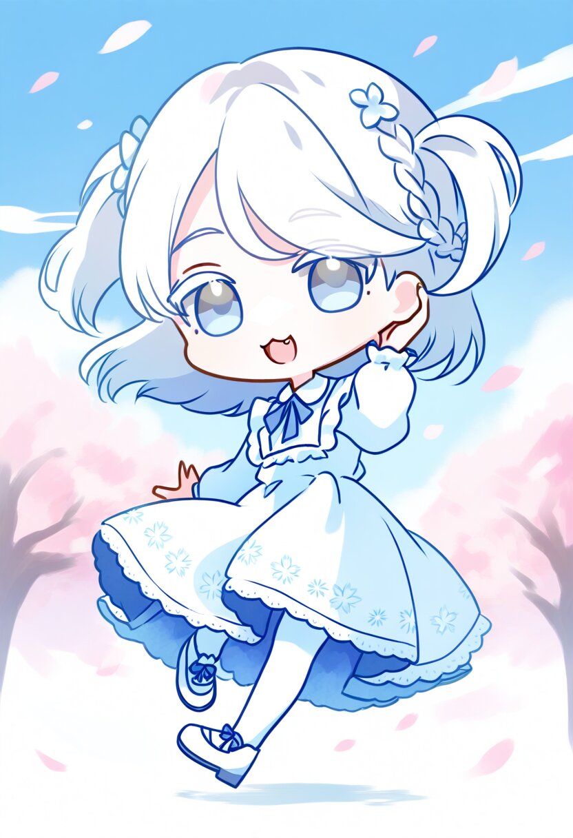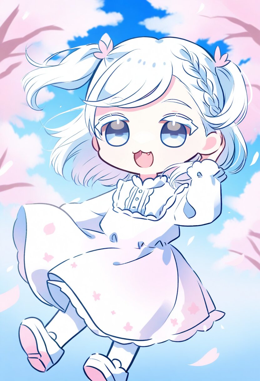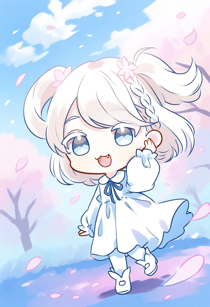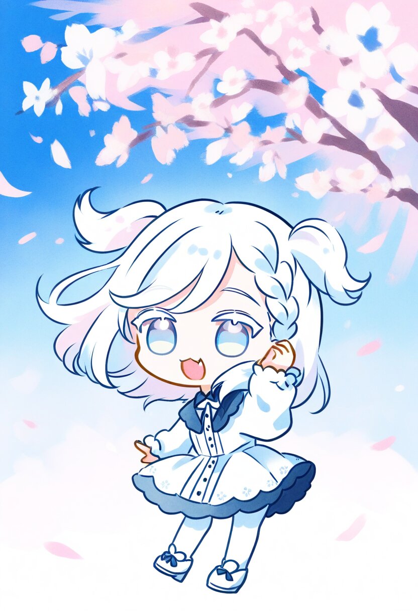 <lora:inmnsylexl4:1>best quality, masterpiece, very aesthetic, watercolor painting, general, pastel colors, chibi, 1girl, white hair, two side up, medium hair, braid bangs, swept bangs, pale blue eyes, white colored eyelashes, :3, smile, open mouth, fang, frilly white dress, long sleeves, white tights, white shoes, hand at own ear, wind blowing, cherry blossom trees, blue sky