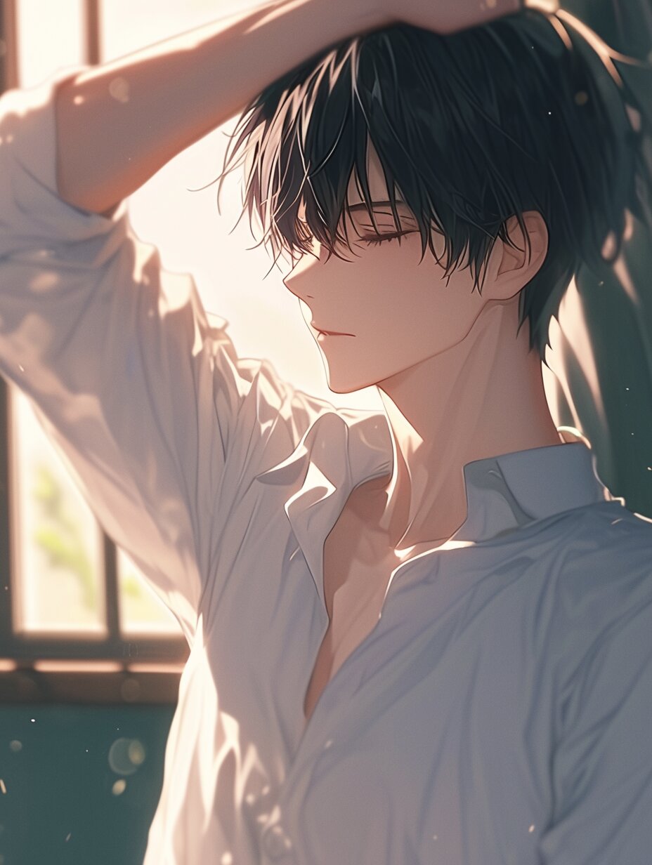 anime style, ultra-detailed, high quality, masterpiece, 8K, young man, short black hair, black eyes, wearing a soft white shirt, stretching both arms upward in a relaxed morning pose, gentle smile on his face, soft morning light,