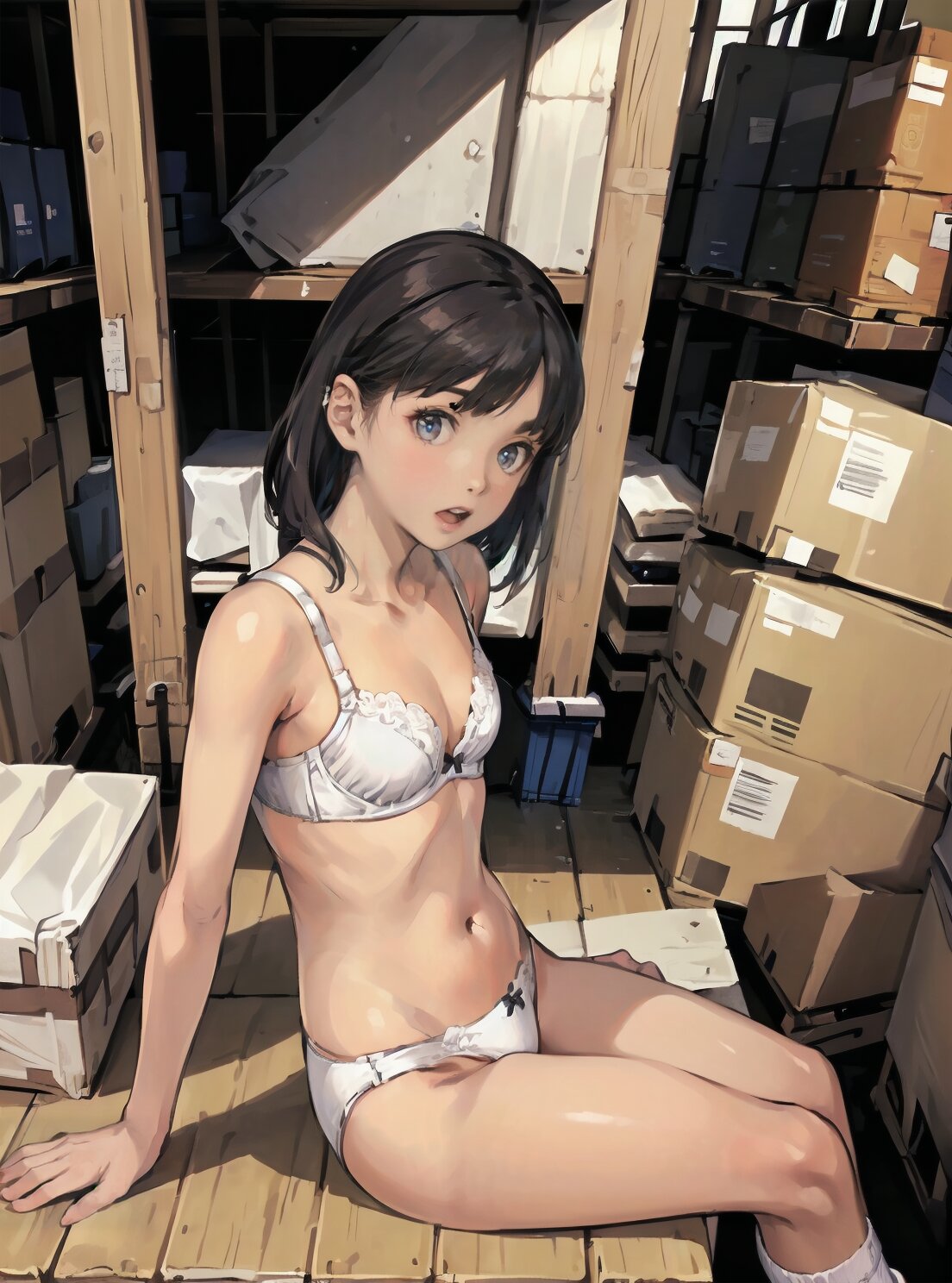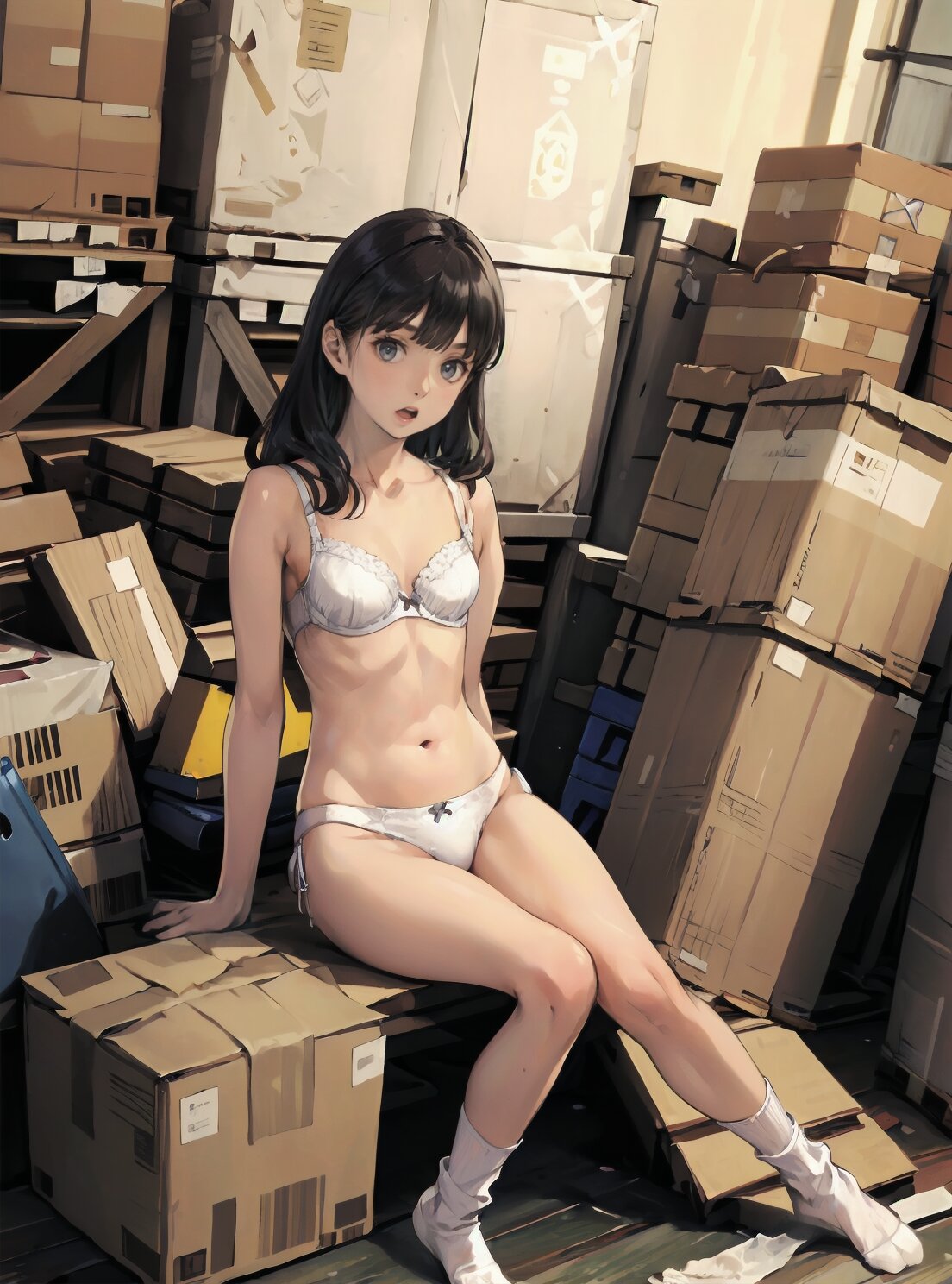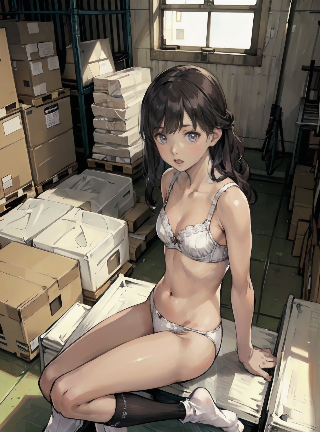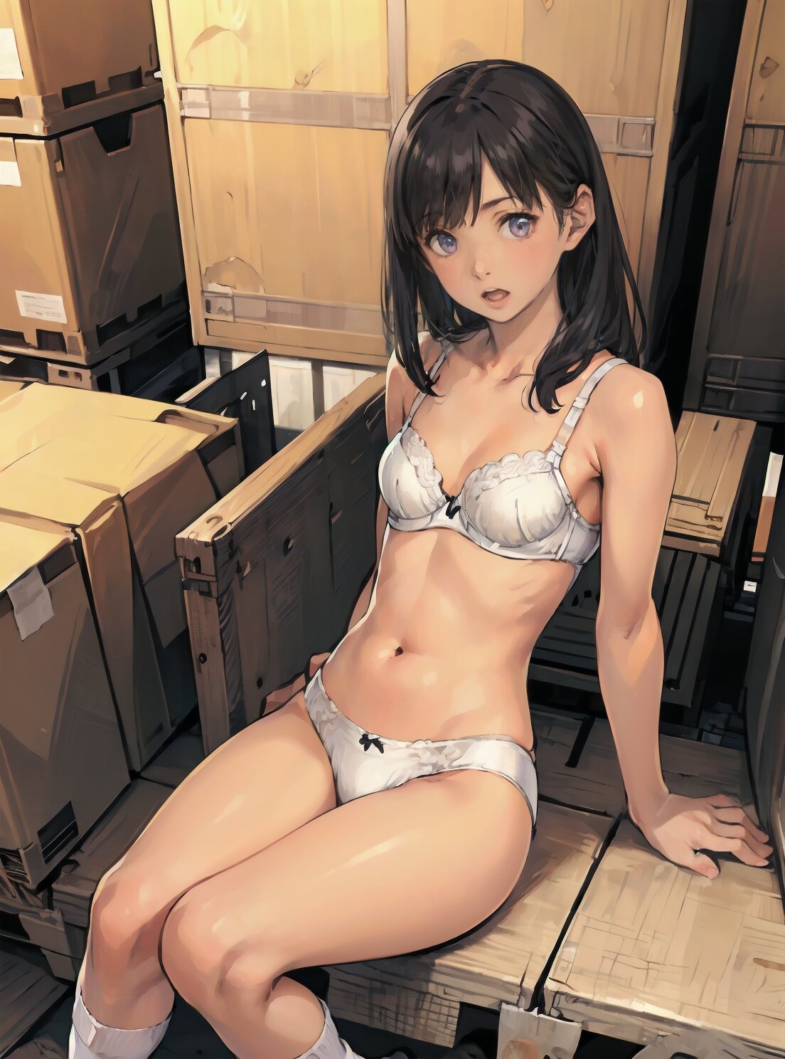 (random pose, random angle: 1.2), (8k, best quality, masterpiece:1.4), (realistic, photo-realistic:1.6), HDR, (incredibly absurdres:1.2), (vibrant color:1.2), ultra-detailed, 1girl, solo, 12years old, solo, small girl, (((petite, small breasts))), long hair,(upper body: 1.6), perfect body, highly detailed, shiny hair, looking at viewer, (white bra and panties, white socks: 1.6), (sitting in the school gymnasium warehouse: 1.6), <lora:KOHINA_V01:0.6>