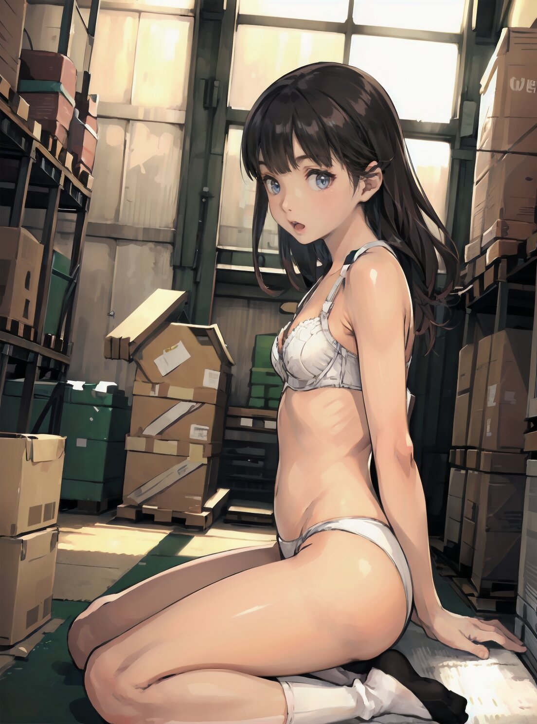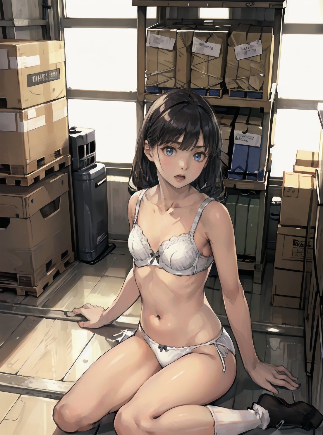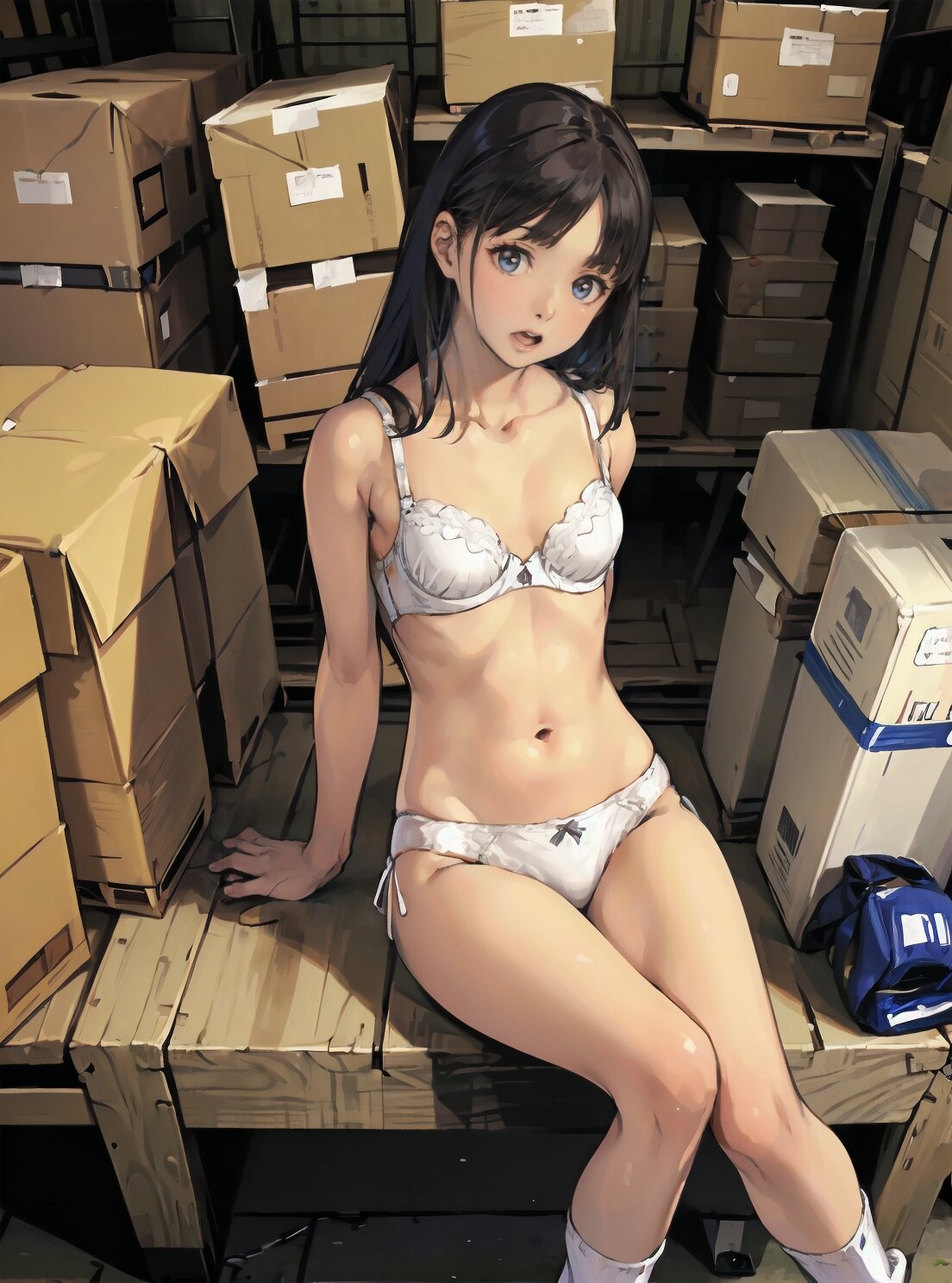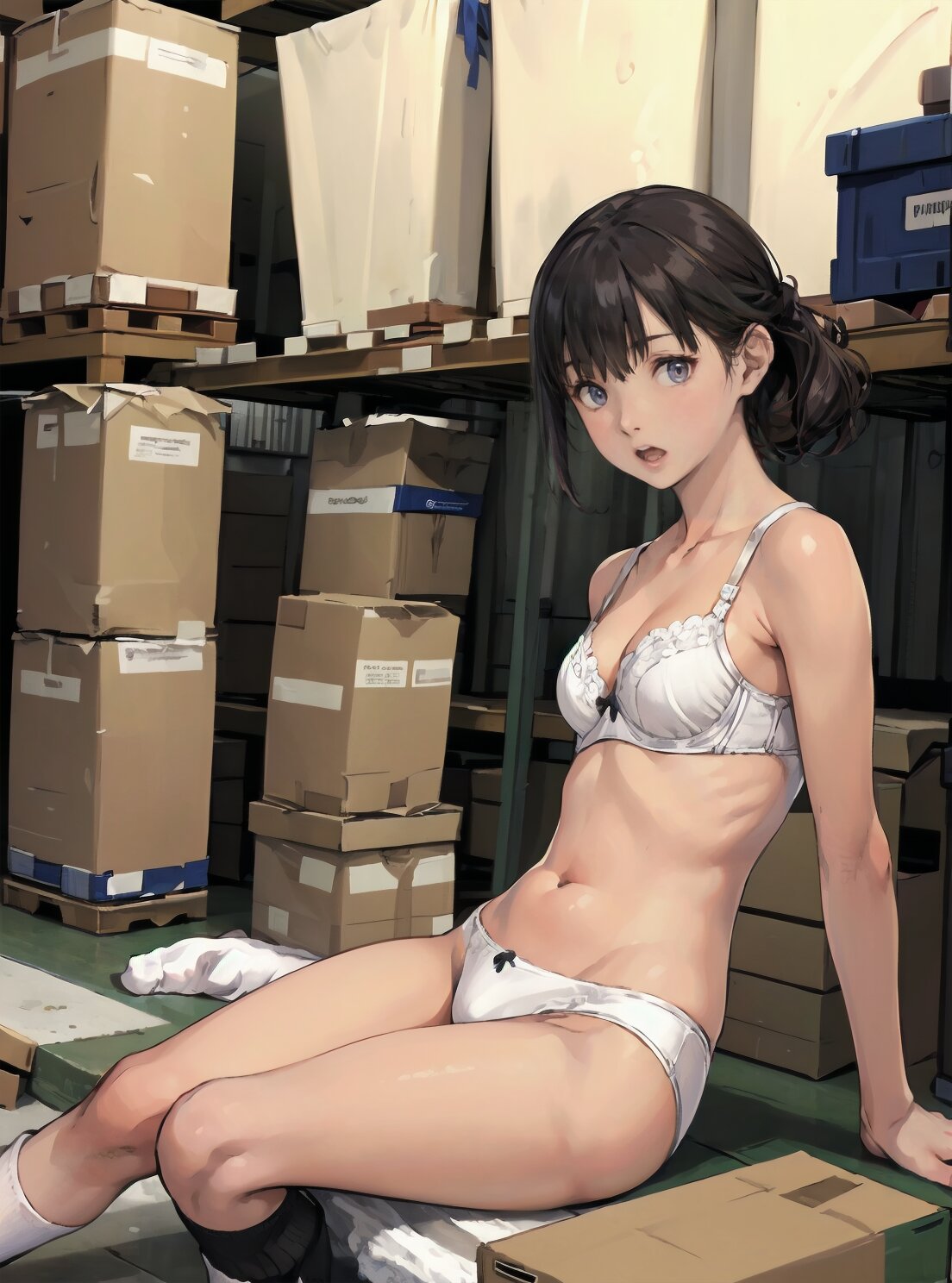 (random pose, random angle: 1.2), (8k, best quality, masterpiece:1.4), (realistic, photo-realistic:1.6), HDR, (incredibly absurdres:1.2), (vibrant color:1.2), ultra-detailed, 1girl, solo, 12years old, solo, small girl, (((petite, small breasts))), long hair,(upper body: 1.6), perfect body, highly detailed, shiny hair, looking at viewer, (white bra and panties, white socks: 1.6), (sitting in the school gymnasium warehouse: 1.6), <lora:KOHINA_V01:0.6>