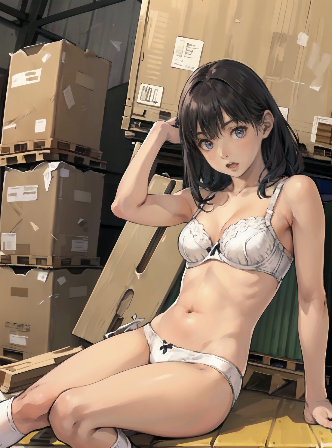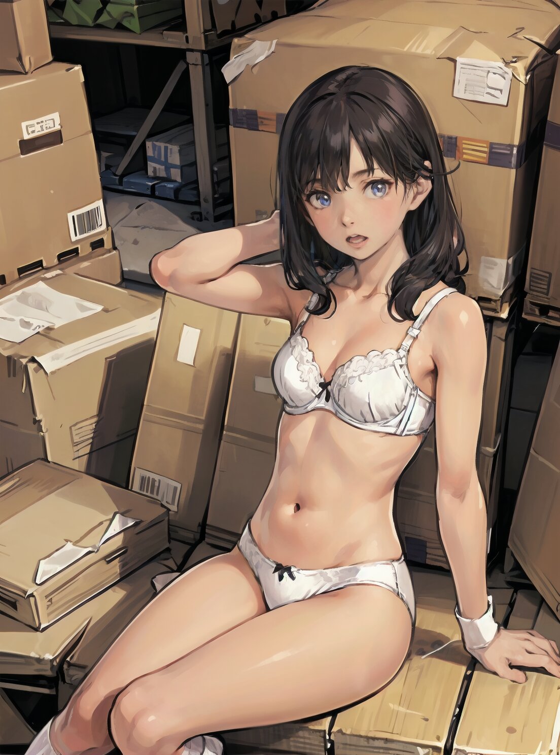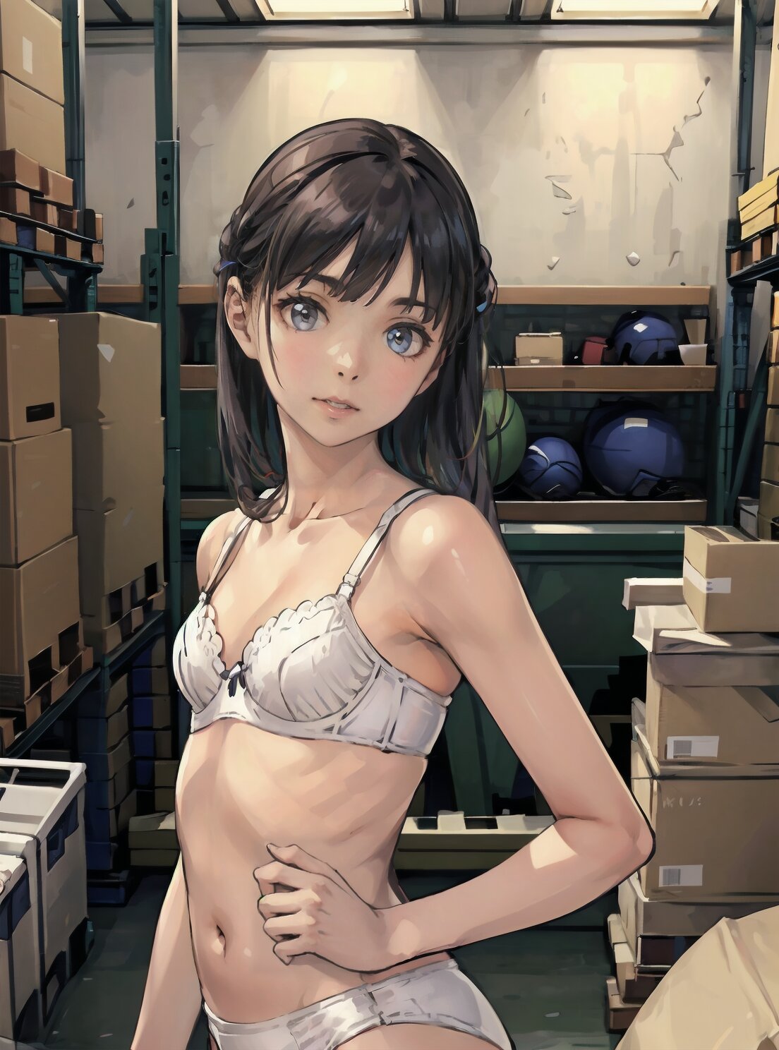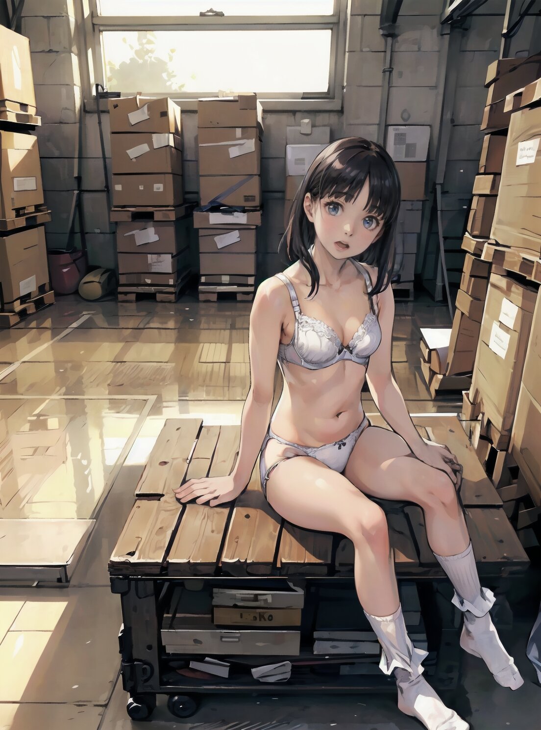 (random pose, random angle: 1.2), (8k, best quality, masterpiece:1.4), (realistic, photo-realistic:1.6), HDR, (incredibly absurdres:1.2), (vibrant color:1.2), ultra-detailed, 1girl, solo, 12years old, solo, small girl, (((petite, small breasts))), long hair,(upper body: 1.6), perfect body, highly detailed, shiny hair, looking at viewer, (white bra and panties, white socks: 1.6), (sitting in the school gymnasium warehouse: 1.6), <lora:KOHINA_V01:0.6>