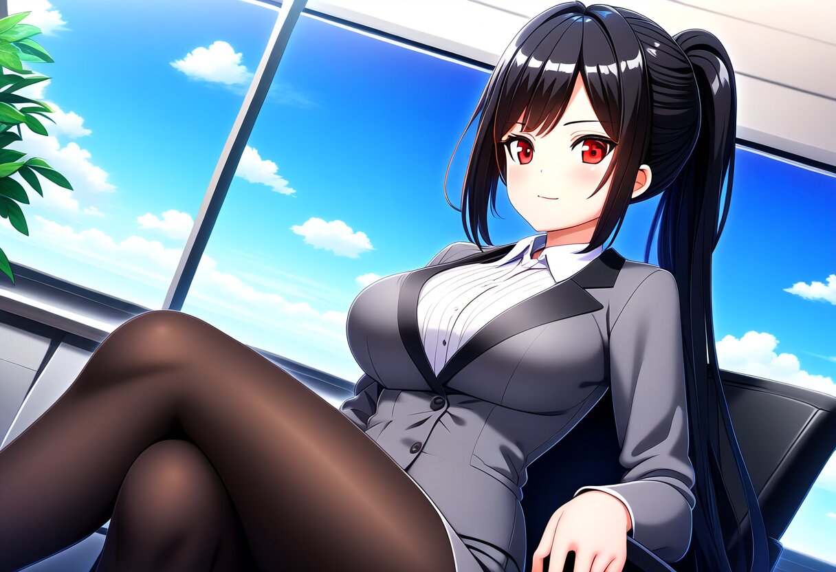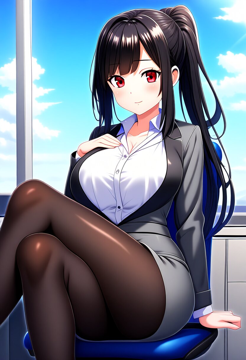 {{{highly detailed}}}, {{official style}}, {{game cg}}, style of ai-generated, {{tenka hyakken, girlfriend (kari)}}, 1girl, solo, red eyes, very long ponytail, black hair, swept bangs, large breasts, collared shirt, {{{business gray suit, grey mini skirt, black tights}}}, {{{office}}}, sitting, chair, computer, blue sky, indoor, {{{masterpiece}}}, {{{best quality}}}, {{{very aesthetic}}}, {{{ultra-detailed}}}, {illustration}, {{{extremely detailed}}}, {{{an extremely delicate and beautiful}}}