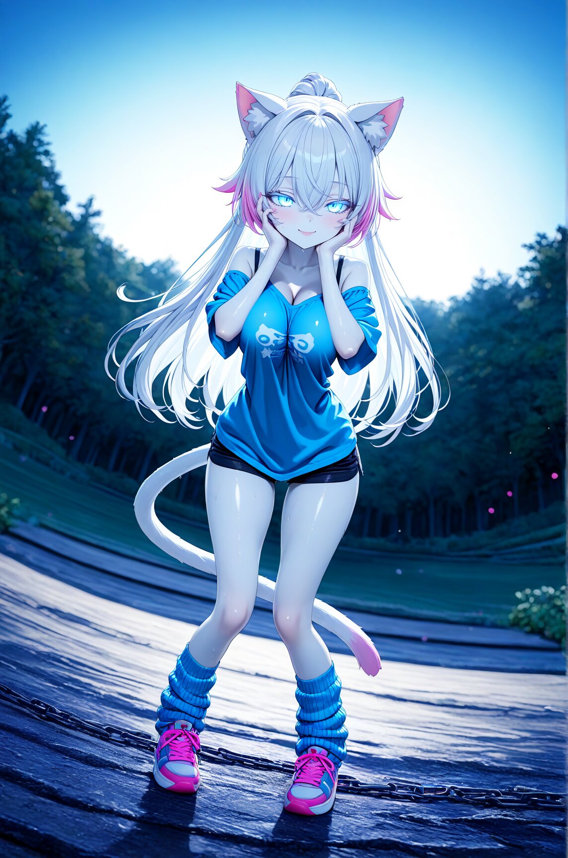 Anime illustration, CG art, 3D model, 3D rendering, 3D skin texture, high detail, depth of field, 1 person, cat ears, cat tail, hime cut, side ponytail, slanted eyes, sky blue eyes, white skin, gothic lolita, 8K, masterpiece, best quality, amazing quality, very aesthetic, (volumetric lighting), overexposed,