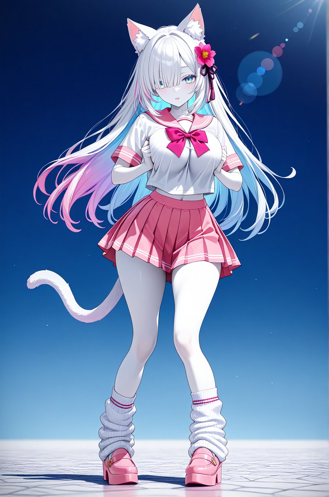 Anime illustration, CG art, 3D model, 3D rendering, 3D skin texture, high detail, depth of field, 1 person, cat ears, cat tail, hime cut, side ponytail, slanted eyes, sky blue eyes, white skin, gothic lolita, 8K, masterpiece, best quality, amazing quality, very aesthetic, (volumetric lighting), overexposed,