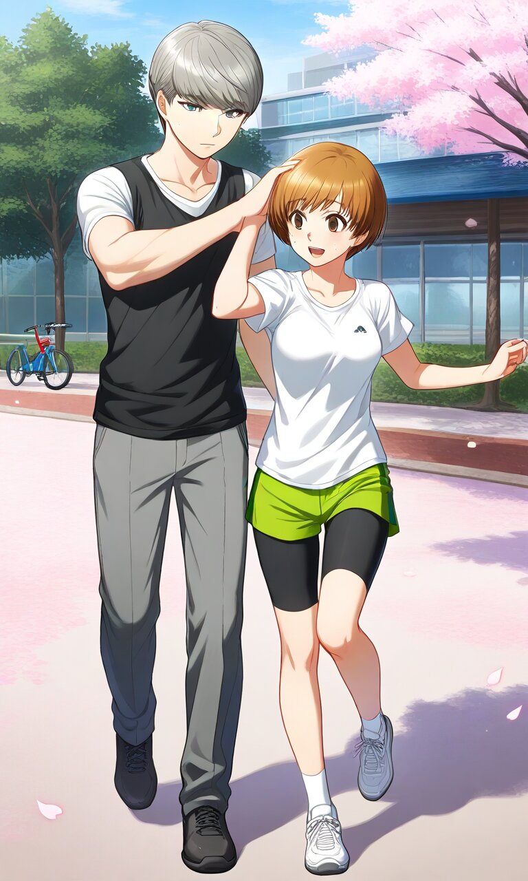 Couple, boy and girl, two people only,absurdres, ultra-detailed, master piece, high resolution, 8k, Boy, girl, couple,Early in the morning in late April, a spring breeze blows pleasantly on an urban sidewalk. A man and a woman, both dressed in running clothes, run lightly side by side. Men in black running shirts and shorts, sweat beading on their foreheads and smiling briskly, they beat the rhythm. The woman, in a brightly colored tank top and leggings, her hair swaying in the spring breeze, happily chatting with the man. They occasionally exchange glances and laugh as they match each other's pace. In the background, a tree-lined avenue is sprinkled with cherry petals, the morning sun reflects off the glass of a building, and a bicycle bell rings in the distance. In the fresh spring air, the exhilaration of running and the lighthearted bond between the two men warmly resonate on the morning sidewalk. BREAK the boy(narukami yu, grey hair, grey eyes,) BREAK the girl(satonaka_chie),