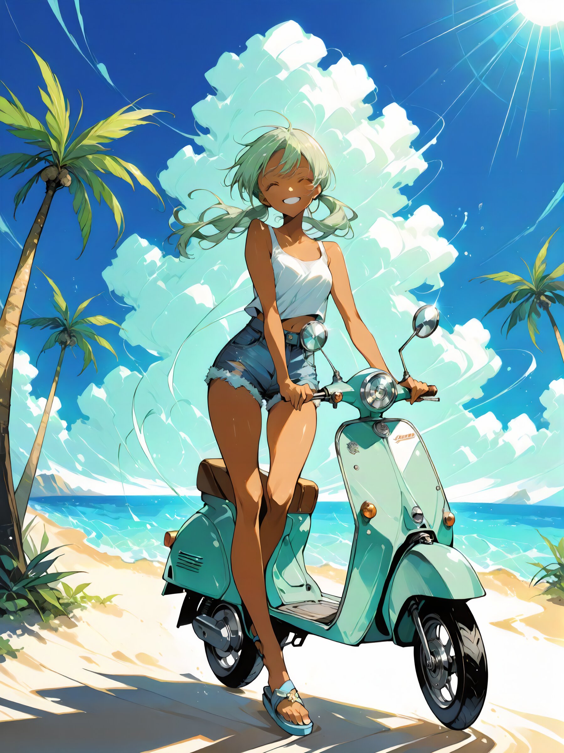 Best quality, Masterpieces, simple background, lots of negative space, delicate anime-style illustration, white background, fine detail, solo, tanned girl with brown twin-tails riding a mint green Vespa scooter, wearing a white tank top, denim shorts, and beach sandals, lifting her sunglasses with one hand and smiling confidently, wind blowing through her hair and clothes, palm trees and ocean in the background, bright blue sky, fluffy clouds, warm sunlight casting soft moving shadows, dynamic camera motion, joyful summer atmosphere, cinematic perspective, high saturation, smooth animation-ready pose and expression, energetic summer scene with breeze effects, clear beachside road, hair fluttering naturally, playful stylish vibe, full-body character centered