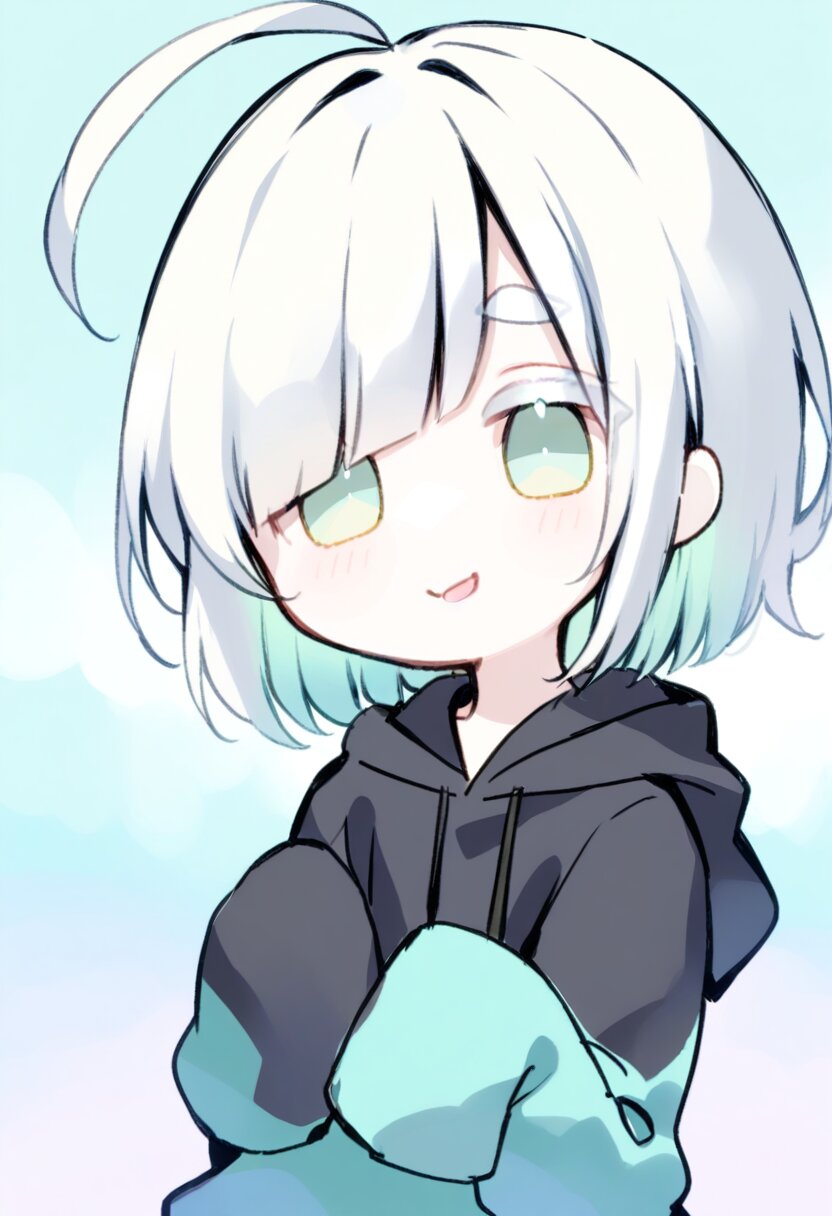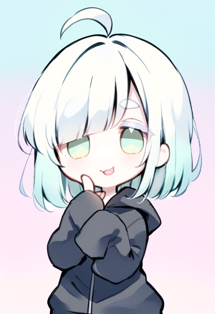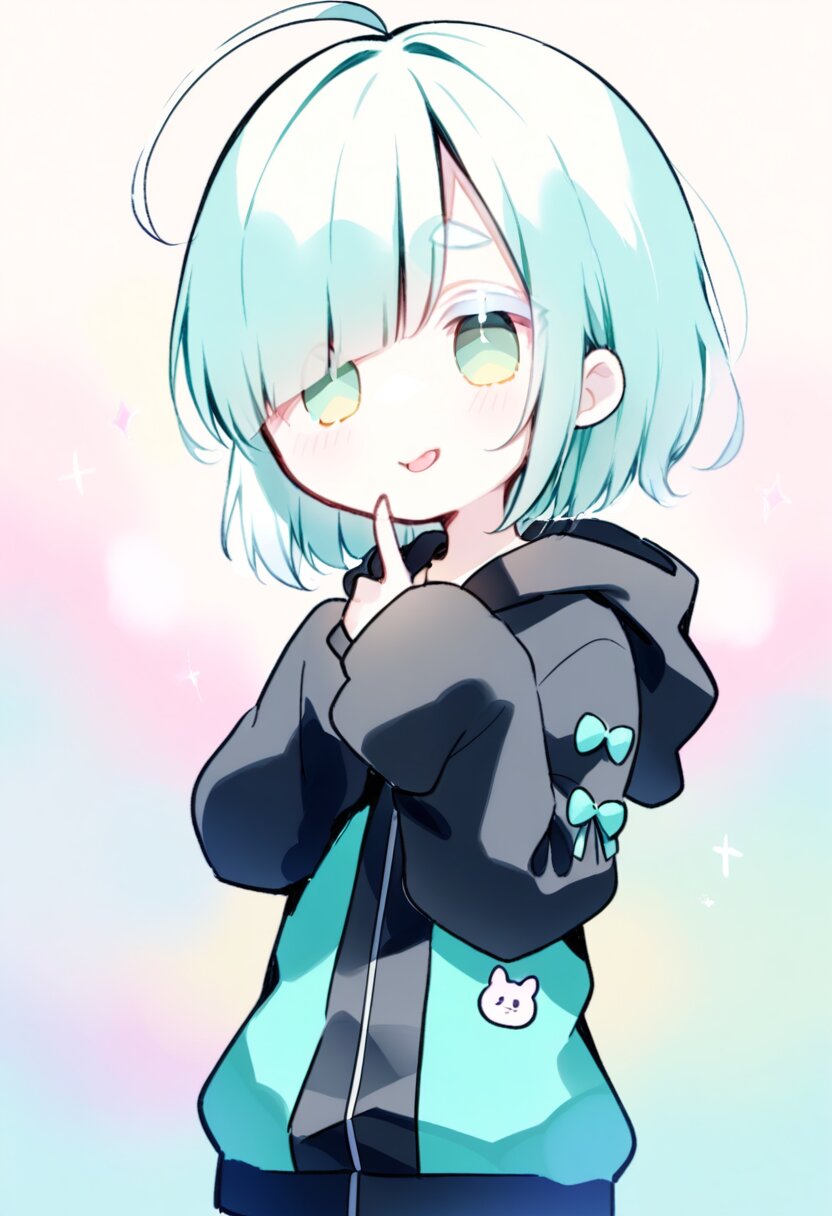 <lora:inmnstylexl:1> <lora:yumekawaii_ftr:1>best quality, masterpiece, very aesthetic, watercolor painting, pastel colors, general, chibi, 1girl, 10 years old, (bright white hair), short hair, blunt bangs, white thick eyebrow, white colored eyelashes, (hair over one eye), ahoge, oversize black hoodie, sleeves past wrists, smile, wink, tongue out, point at own cheek, portrait, mint green eyes