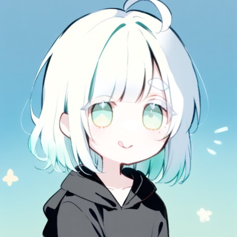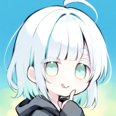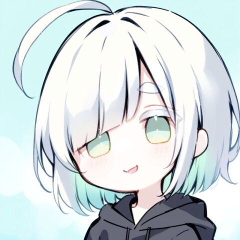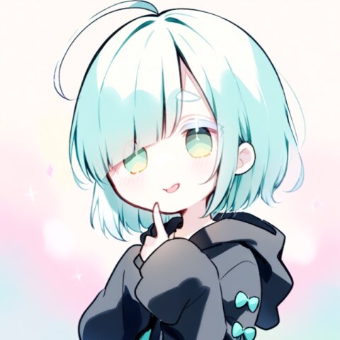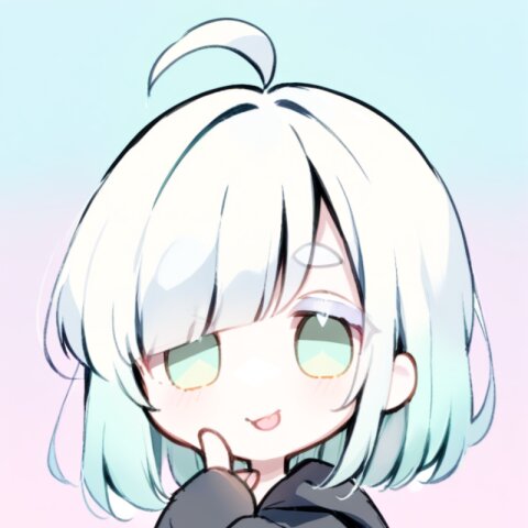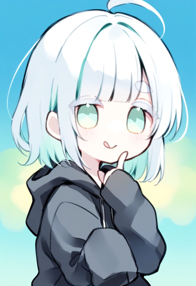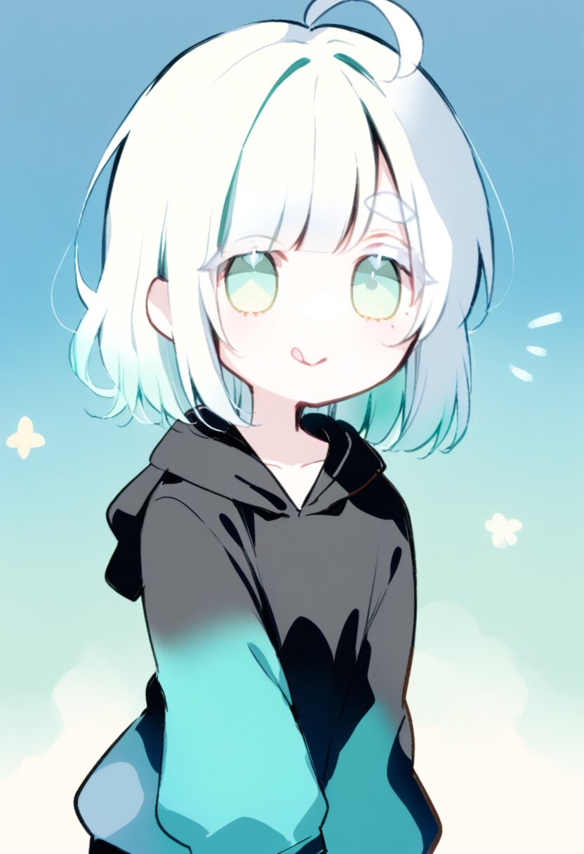 <lora:inmnstylexl:1> <lora:yumekawaii_ftr:1>best quality, masterpiece, very aesthetic, watercolor painting, pastel colors, general, chibi, 1girl, 10 years old, (bright white hair), short hair, blunt bangs, white thick eyebrow, white colored eyelashes, (hair over one eye), ahoge, oversize black hoodie, sleeves past wrists, smile, wink, tongue out, point at own cheek, portrait, mint green eyes