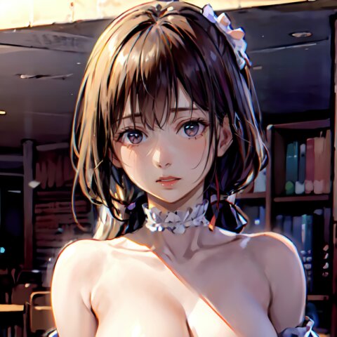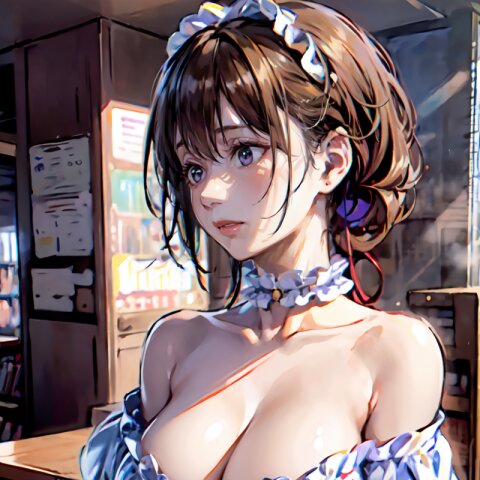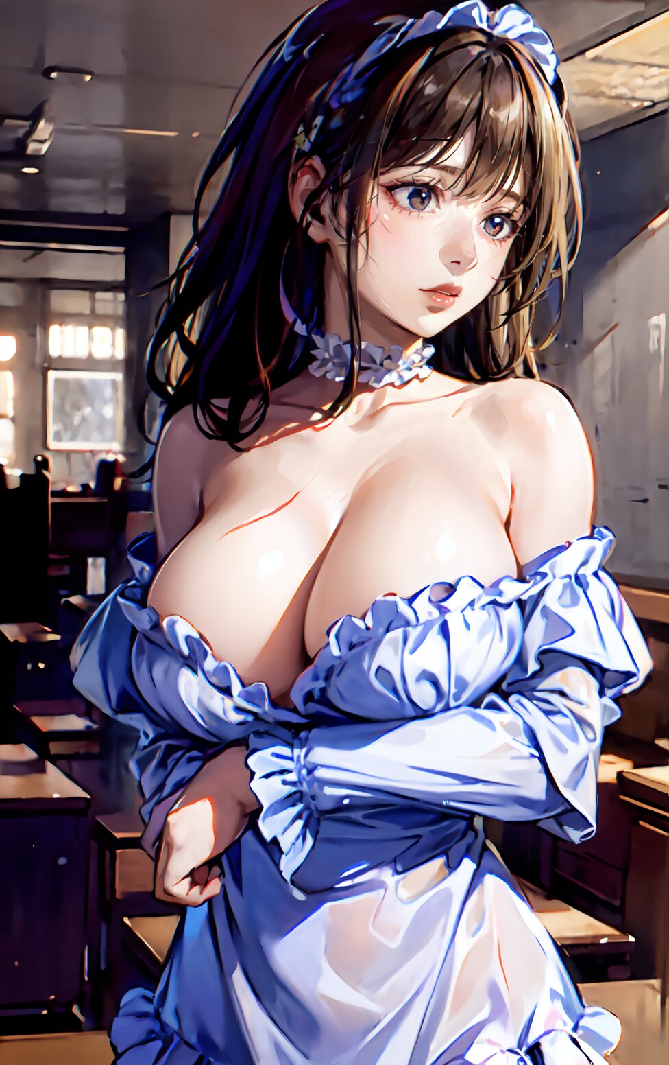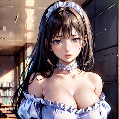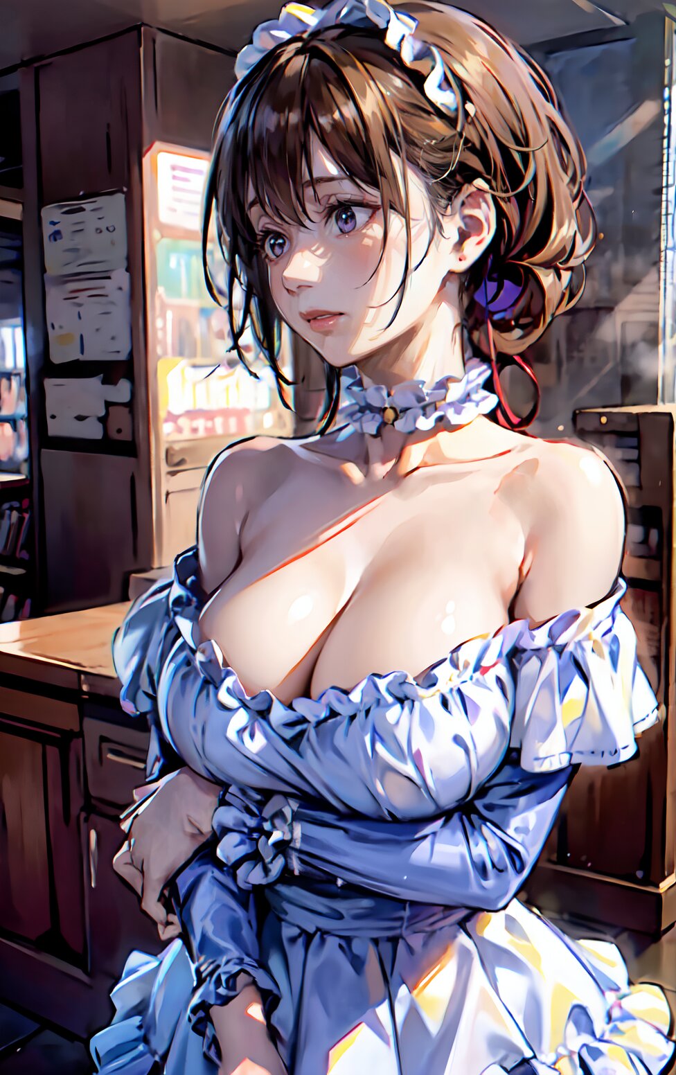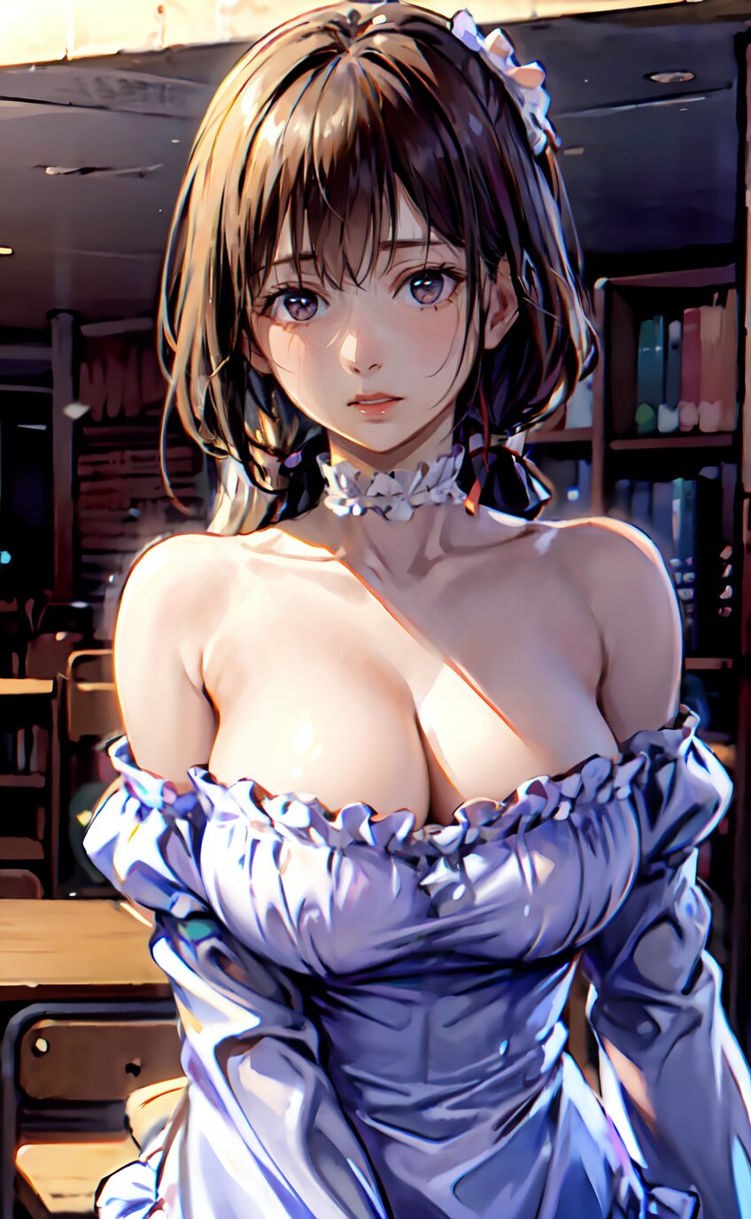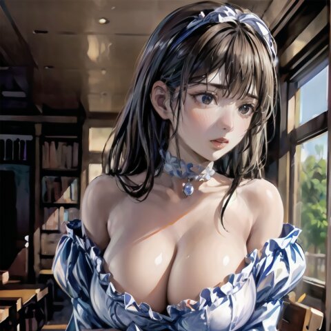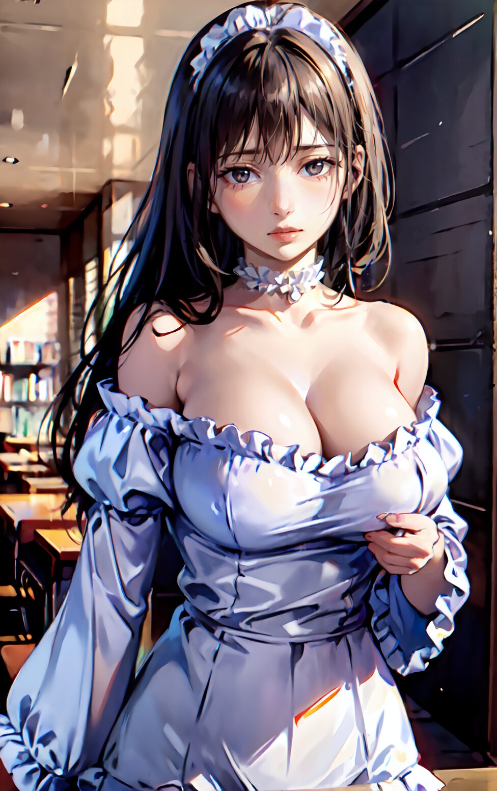 upper body, closed up face, (from front: 1.8), (8k, best quality, masterpiece:1.4), (realistic, photo-realistic:1.6), (vibrant color:1.2), ultra-detailed, 8K, HDR, 1girl, 18 years old, (slender, gigantic breasts: 1.4), long hair, (Off Shoulder Frilled Shirred Waist Puff Sleeve Layered Hem Milkmaid Dress, choker: 1.8), looking away, (standing: 1.6), in the school library, <lora:ris_v01:1>
