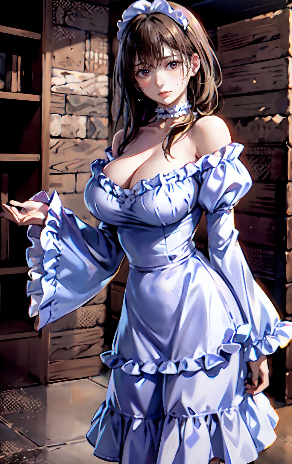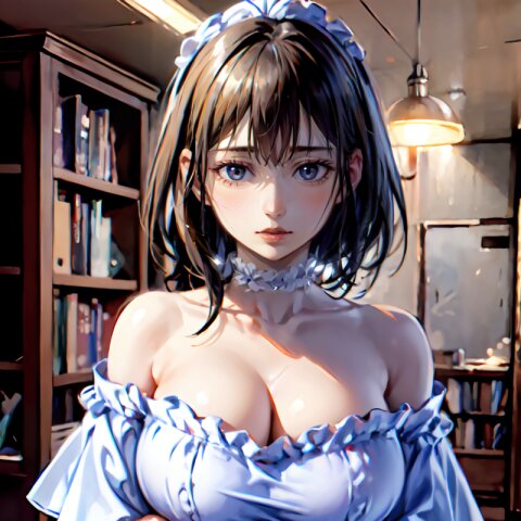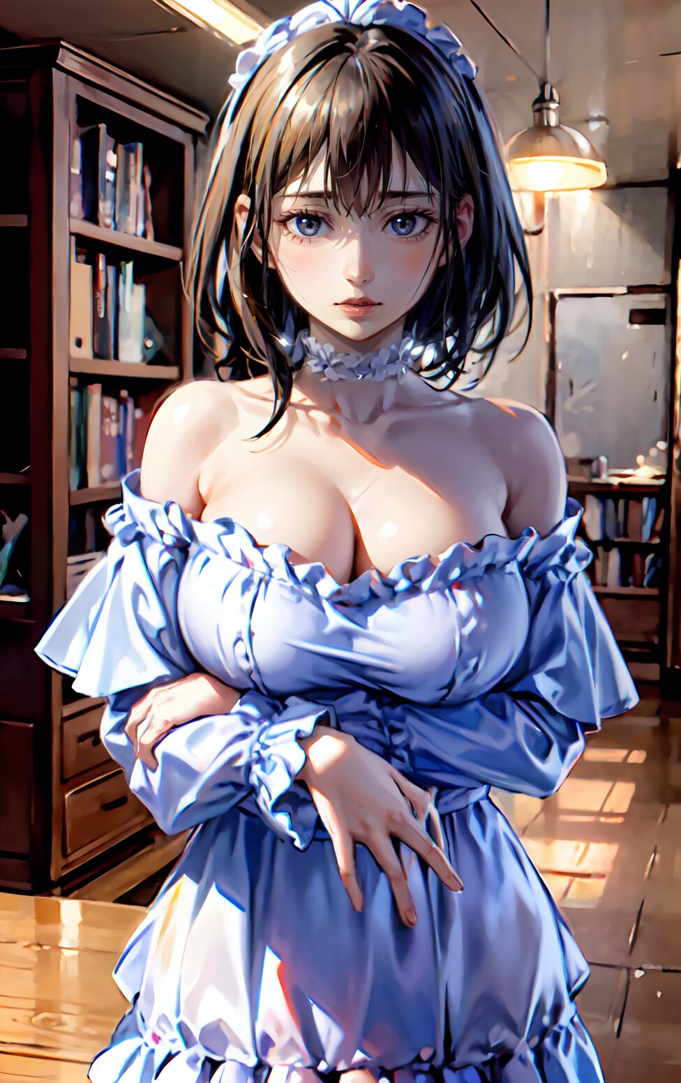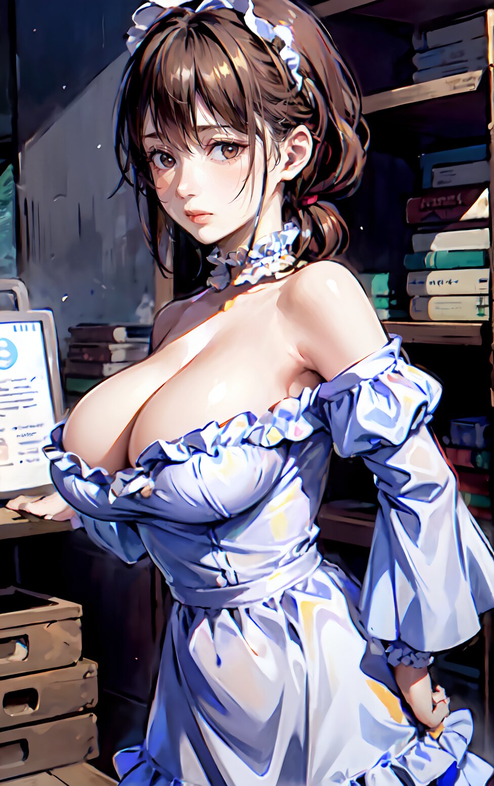 upper body, closed up face, (from front: 1.8), (8k, best quality, masterpiece:1.4), (realistic, photo-realistic:1.6), (vibrant color:1.2), ultra-detailed, 8K, HDR, 1girl, 18 years old, (slender, gigantic breasts: 1.4), long hair, (Off Shoulder Frilled Shirred Waist Puff Sleeve Layered Hem Milkmaid Dress, choker: 1.8), looking away, (standing: 1.6), in the school library, <lora:ris_v01:1>