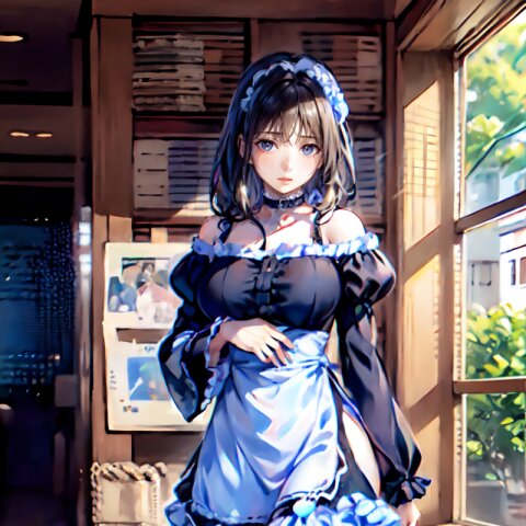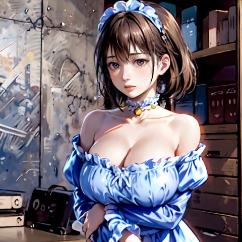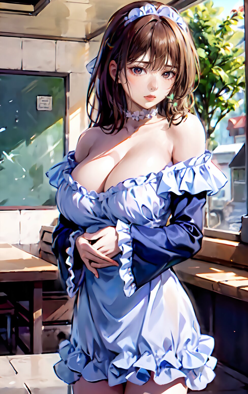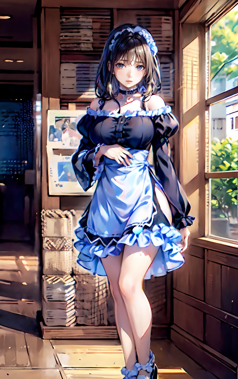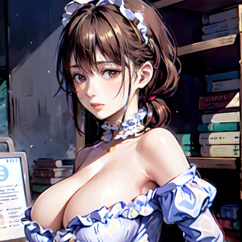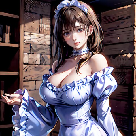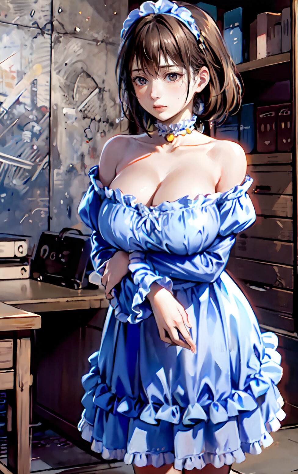 upper body, closed up face, (from front: 1.8), (8k, best quality, masterpiece:1.4), (realistic, photo-realistic:1.6), (vibrant color:1.2), ultra-detailed, 8K, HDR, 1girl, 18 years old, (slender, gigantic breasts: 1.4), long hair, (Off Shoulder Frilled Shirred Waist Puff Sleeve Layered Hem Milkmaid Dress, choker: 1.8), looking away, (standing: 1.6), in the school library, <lora:ris_v01:1>