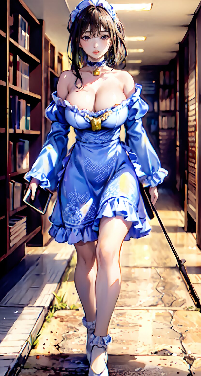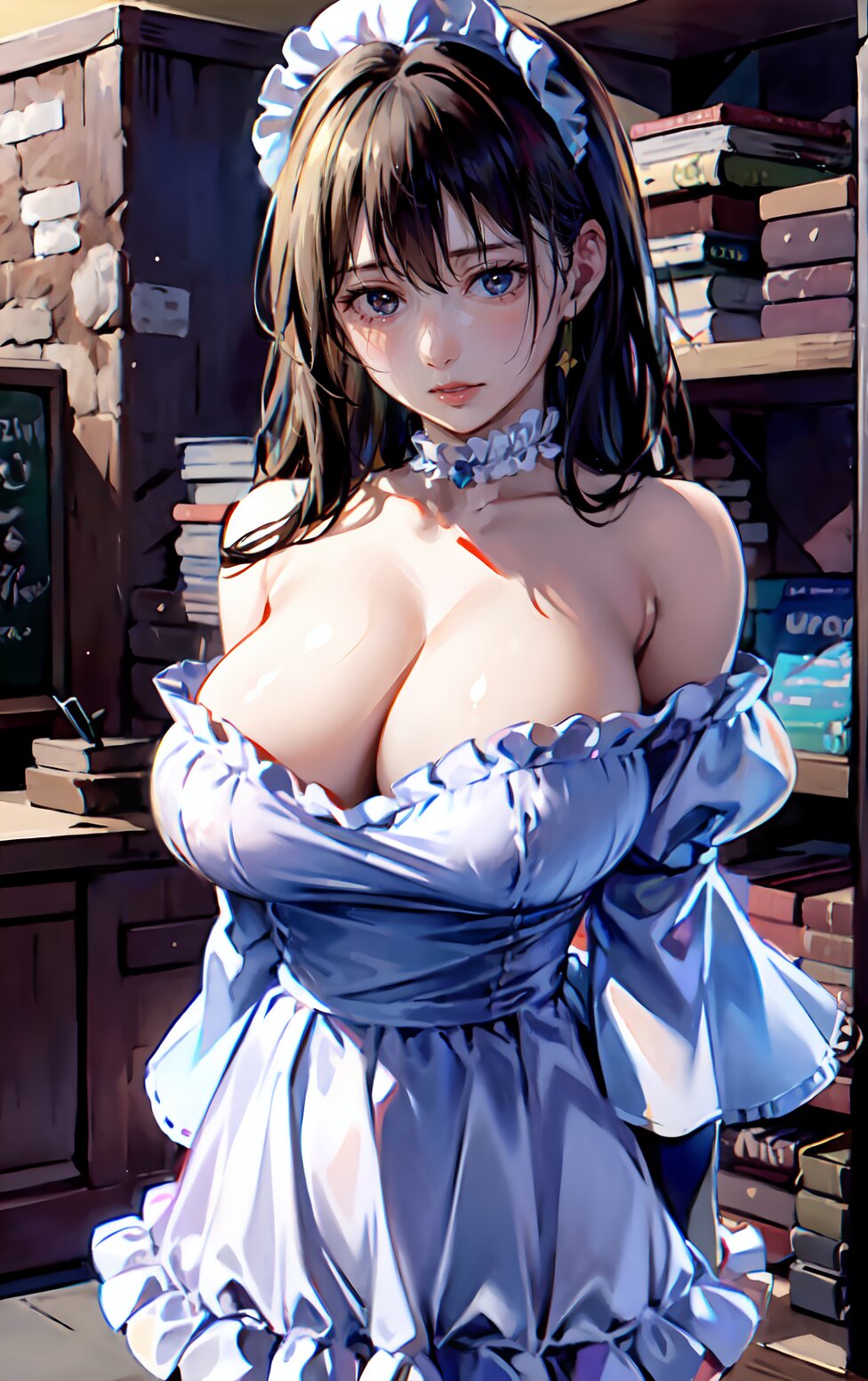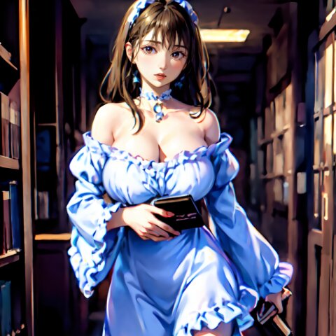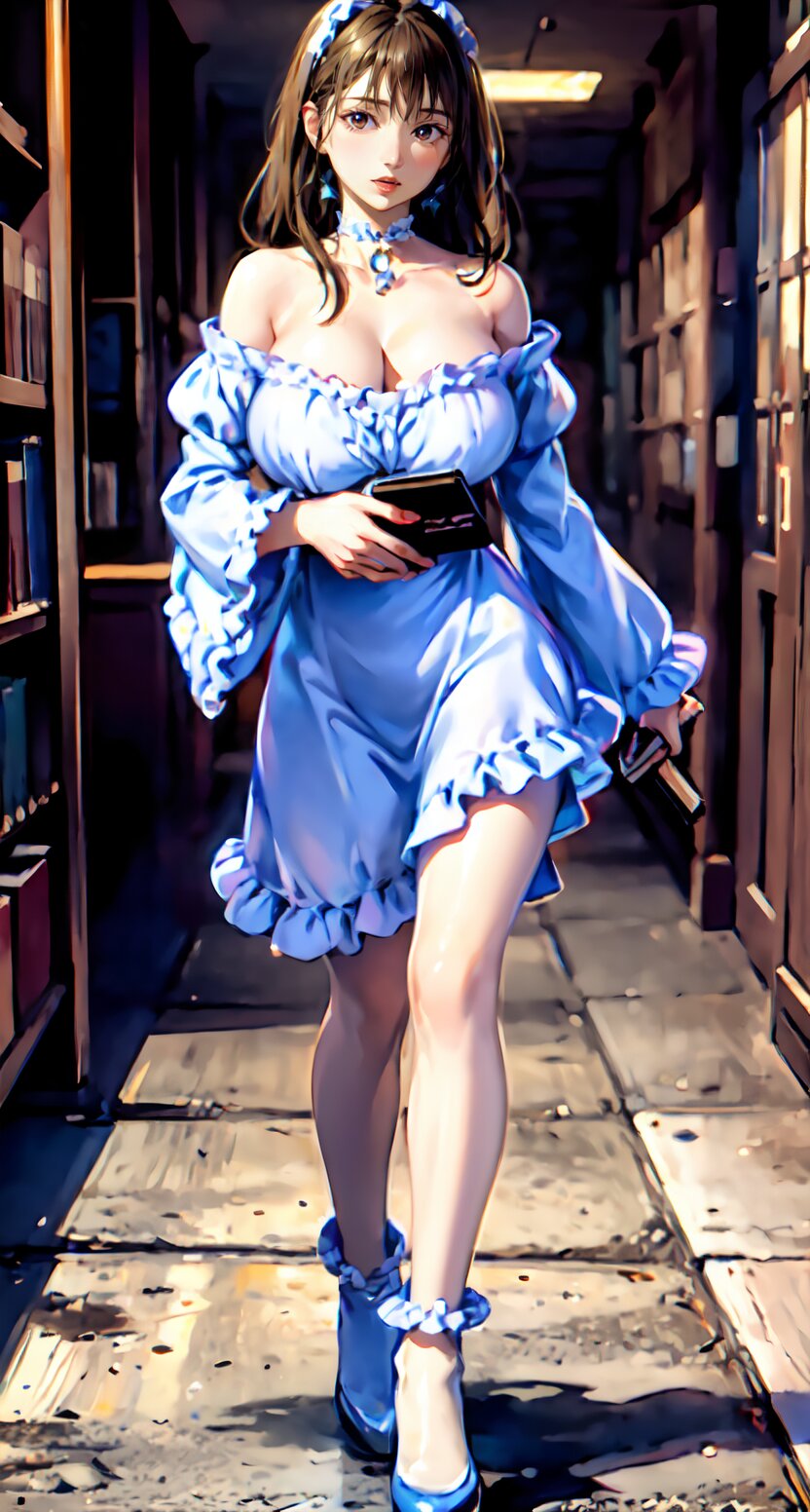 upper body, closed up face, (from front: 1.8), (8k, best quality, masterpiece:1.4), (realistic, photo-realistic:1.6), (vibrant color:1.2), ultra-detailed, 8K, HDR, 1girl, 18 years old, (slender, gigantic breasts: 1.4), long hair, (Off Shoulder Frilled Shirred Waist Puff Sleeve Layered Hem Milkmaid Dress, choker: 1.8), looking away, (standing: 1.6), in the school library, <lora:ris_v01:1>